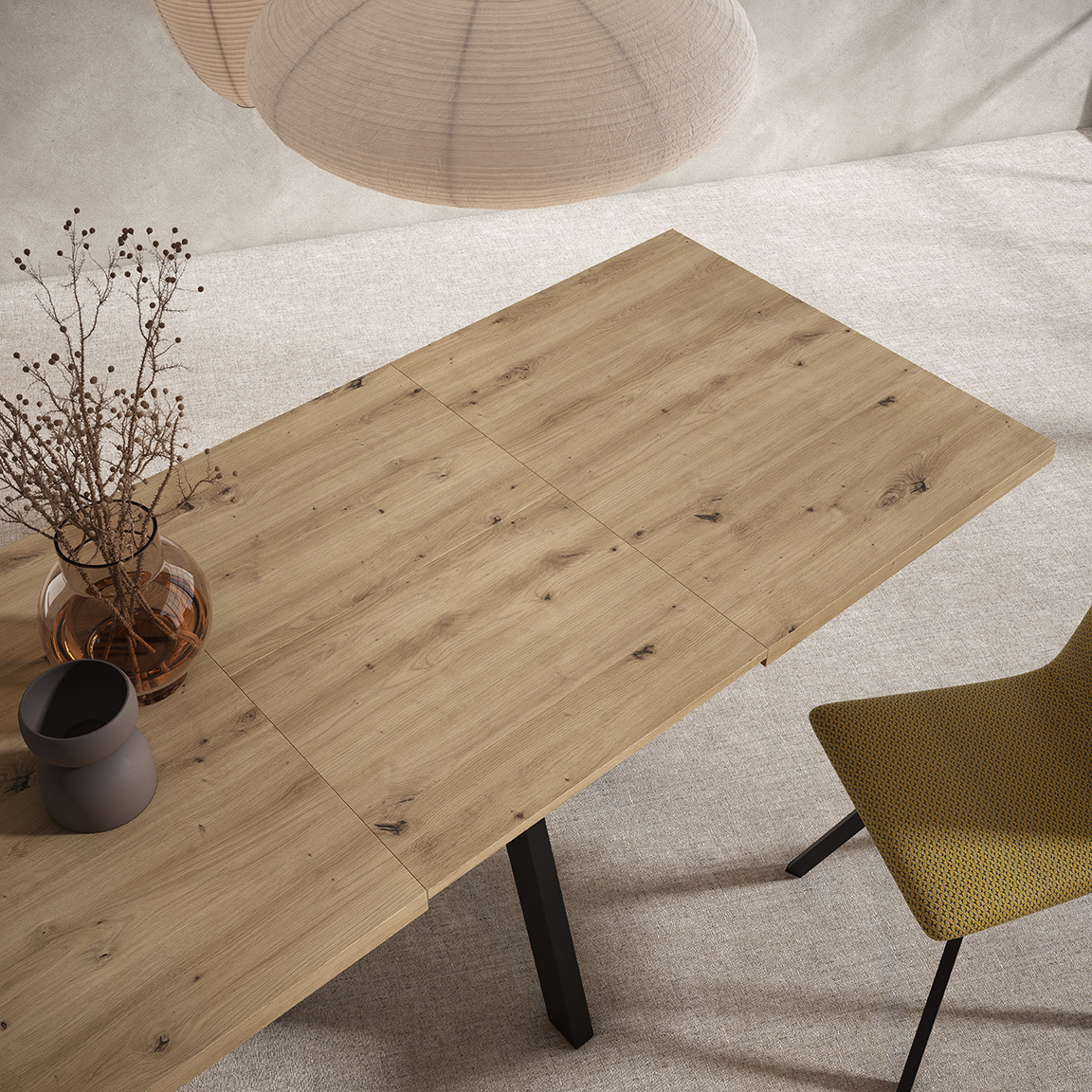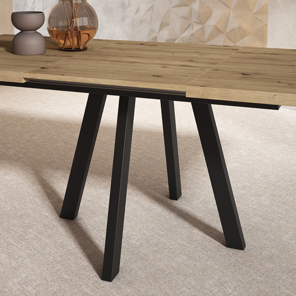 • Tapa de tablero macizo con vetas visibles de estilo natural. • Canto recto y ligeramente biselado para un acabado limpio y contemporáneo. • Encimera formada por paneles seccionados, apta para posibles mecanismos de extensión central. • Estructura metálica inferior que refuerza la estabilidad del conjunto. • Cinco patas independientes de tubo metálico con disposición en ángulo. • Diseño de patas abiertas que facilita la distribución de las sillas alrededor de la mesa. • Unión de patas soldada a un bastidor oculto bajo la tapa para mejorar la rigidez. • Superficie superior preparada para acabados protectores contra manchas y rayaduras.