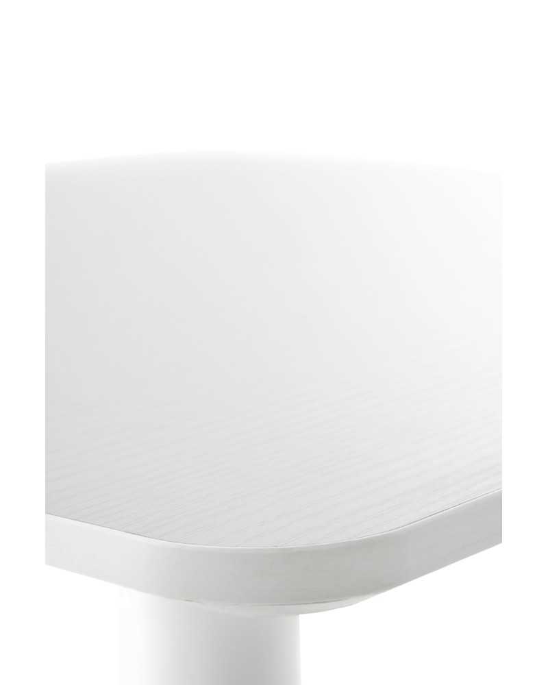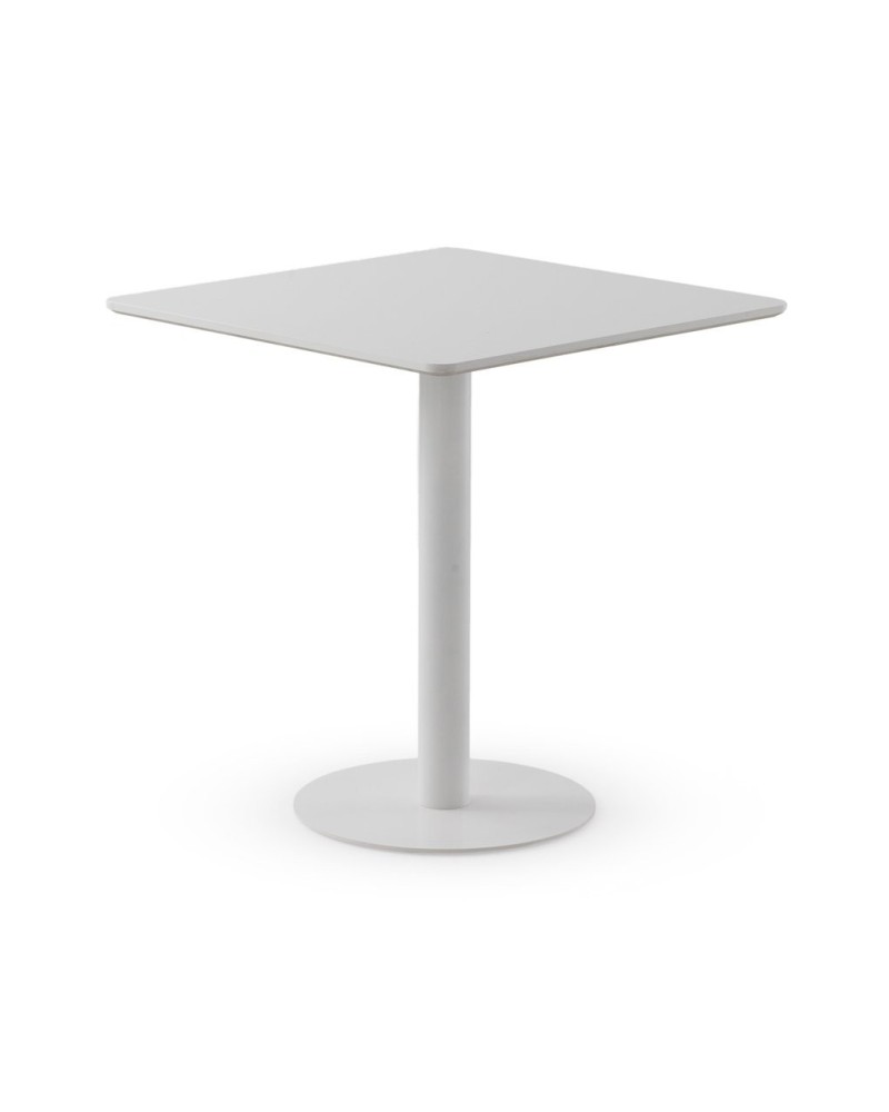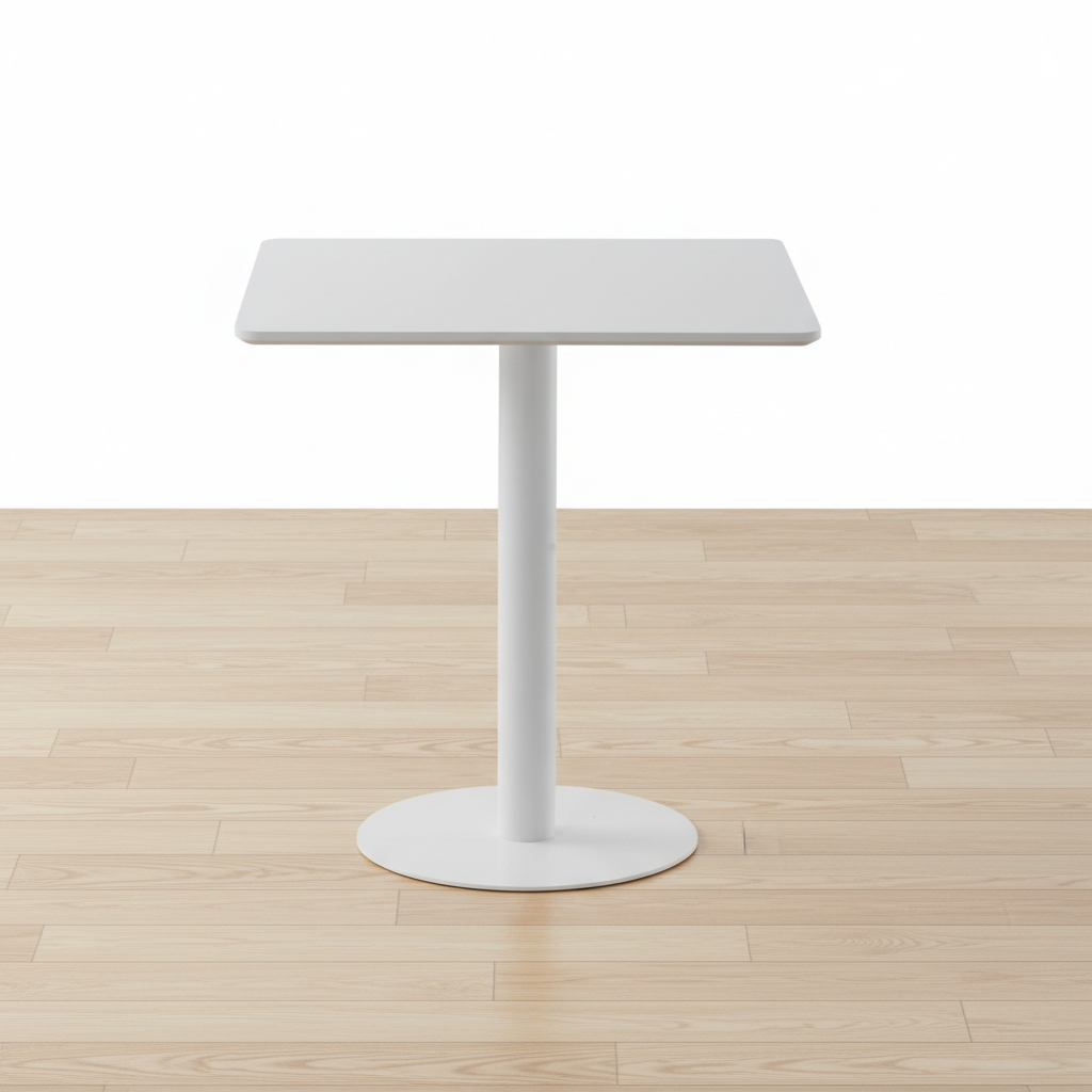 Mesa cuadrada blanca minimalista con tablero liso y pie central cilíndrico sobre base redonda estable.