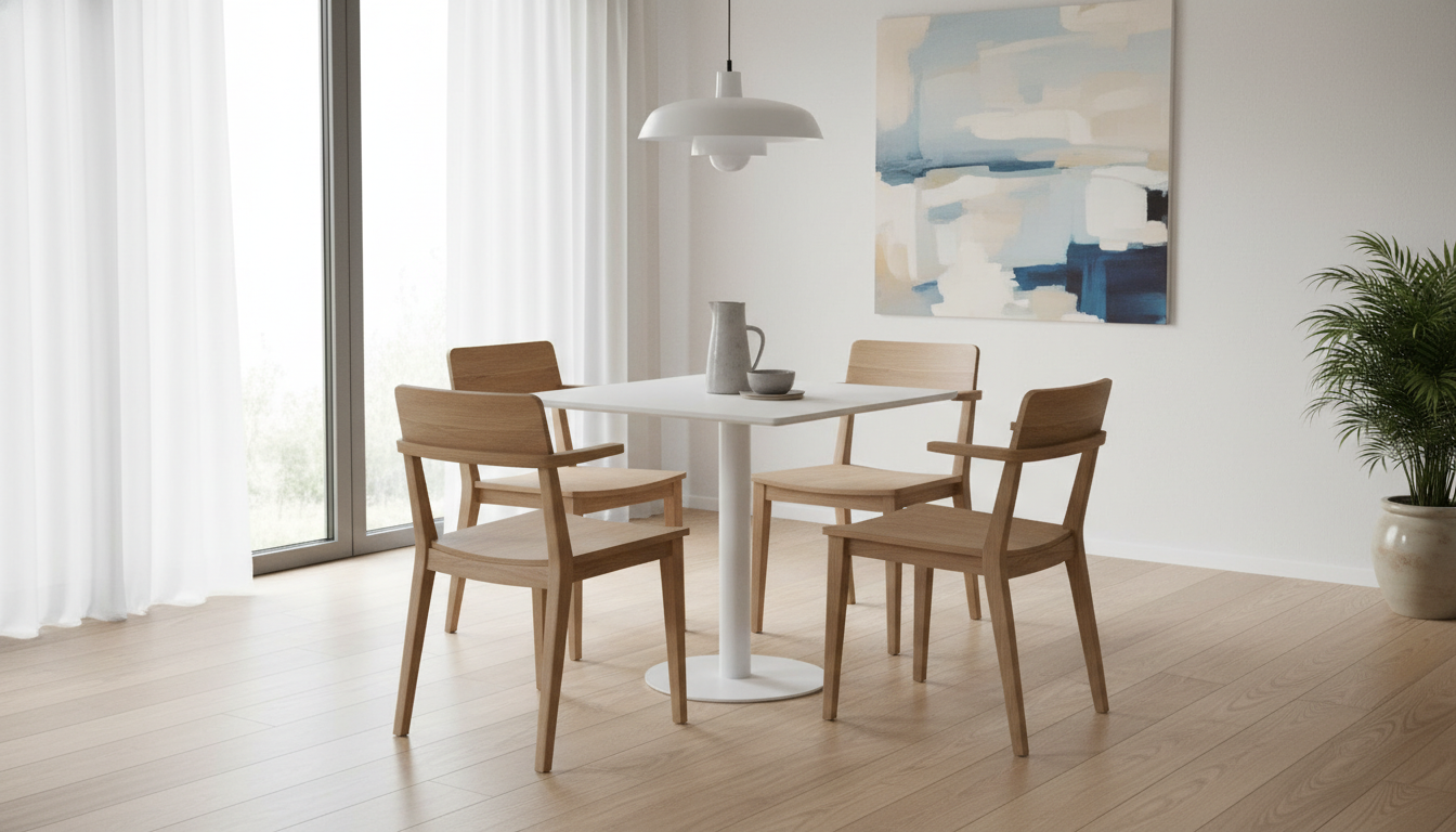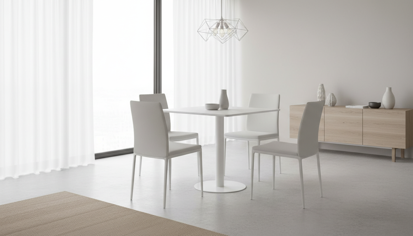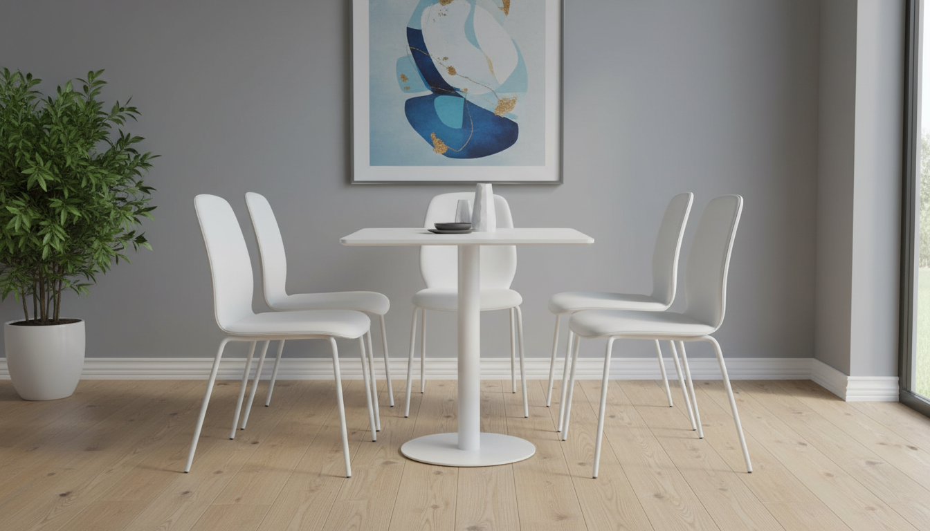 Esta mesa cuadrada presenta un tablero en melamina blanca resistente y fácil de limpiar, elevado sobre un pie central metálico blanco que proporciona estabilidad sin obstruir las piernas. Su diseño minimalista en color blanco uniforme la hace ideal para cocinas, comedores o bares, con capacidad para 4 personas cómodamente. La base ancha asegura firmeza en suelos variados, y su estructura metálica aporta durabilidad para uso diario intensivo. Con un estilo nórdico e industrial, combina funcionalidad y estética contemporánea, ahorrando espacio gracias al pie central único. Perfecta para hogares o hostelería, resiste rayones y humedad típicos de la melamina.