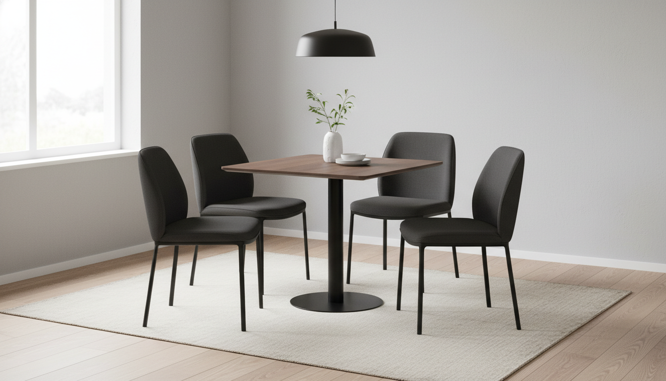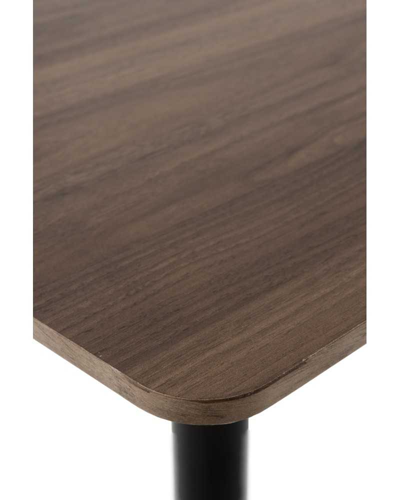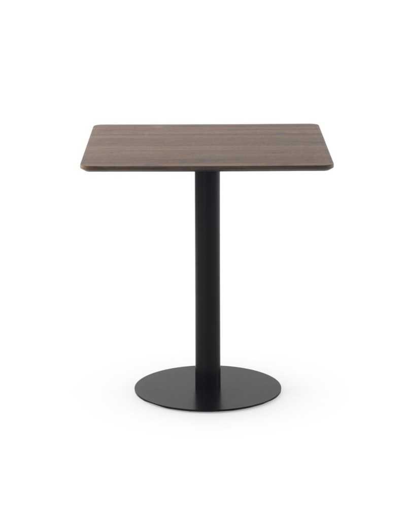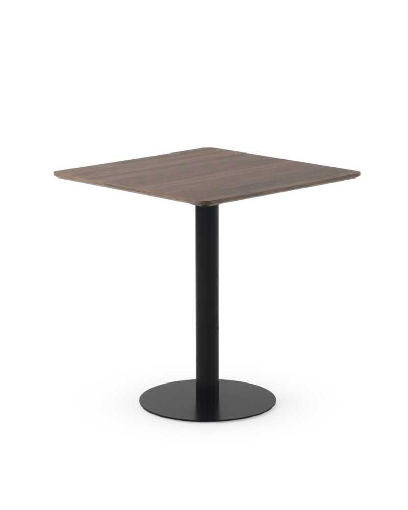 Mesa cuadrada en melamina nogal con pie central metálico negro. Diseño moderno y estable para hasta cuatro personas, ideal para espacios reducidos.