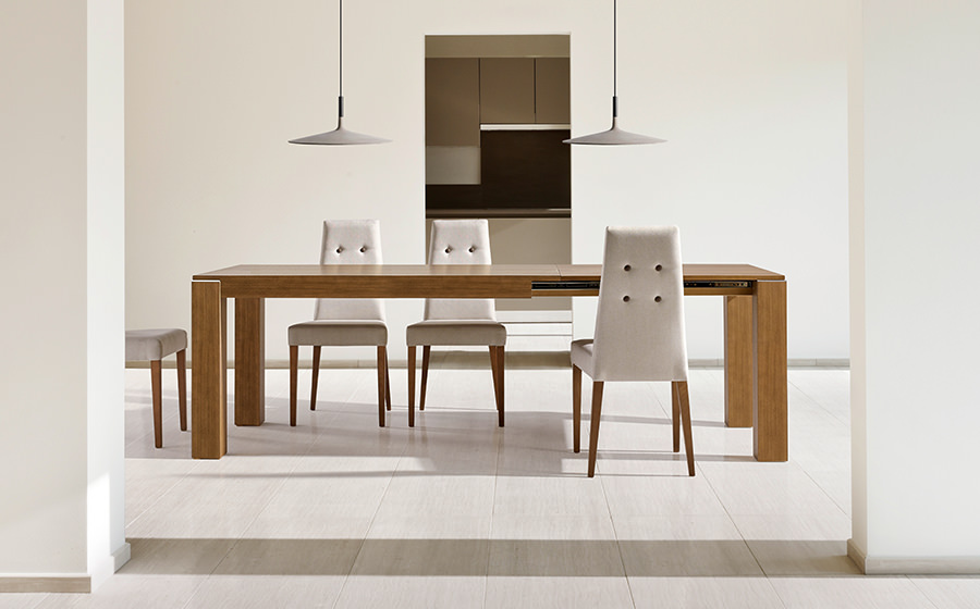 Mesa de comedor extensible de diseño moderno, fabricada en madera de alta calidad y acabado natural. Ideal para espacios contemporáneos, combina funcionalidad y estilo, adaptándose a diferentes necesidades y número de comensales.