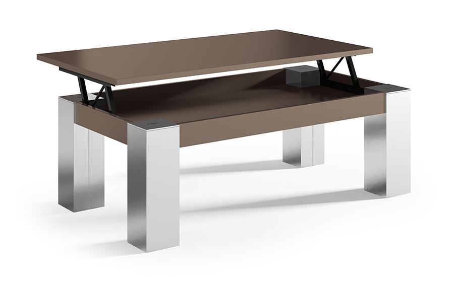 Mesa de centro moderna con mecanismo elevable y espacio de almacenamiento. Patas robustas y diseño funcional ideal para salas contemporáneas.