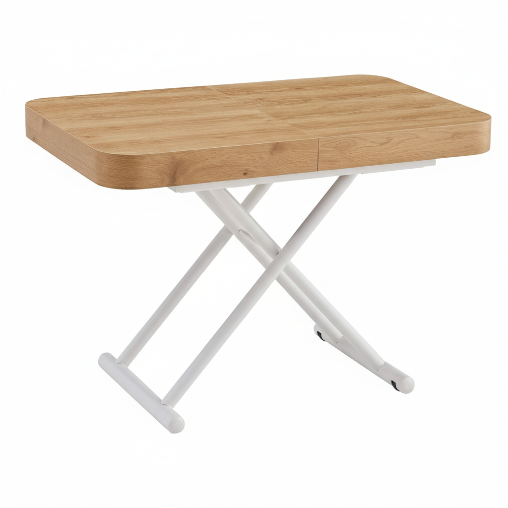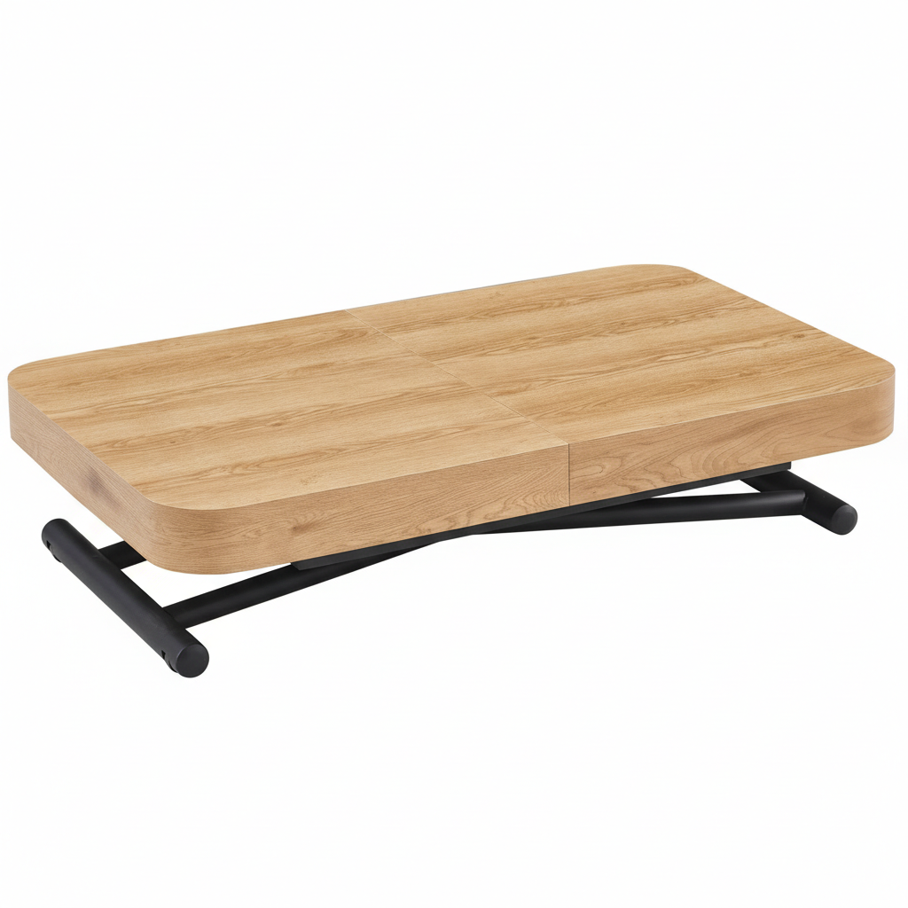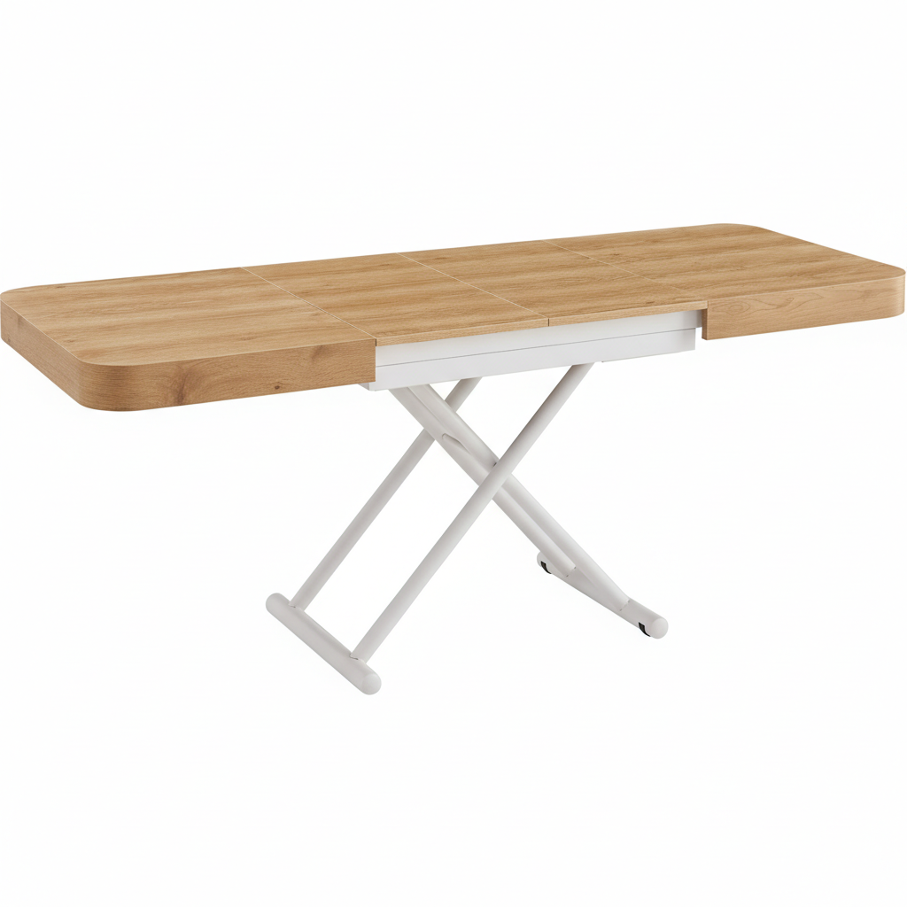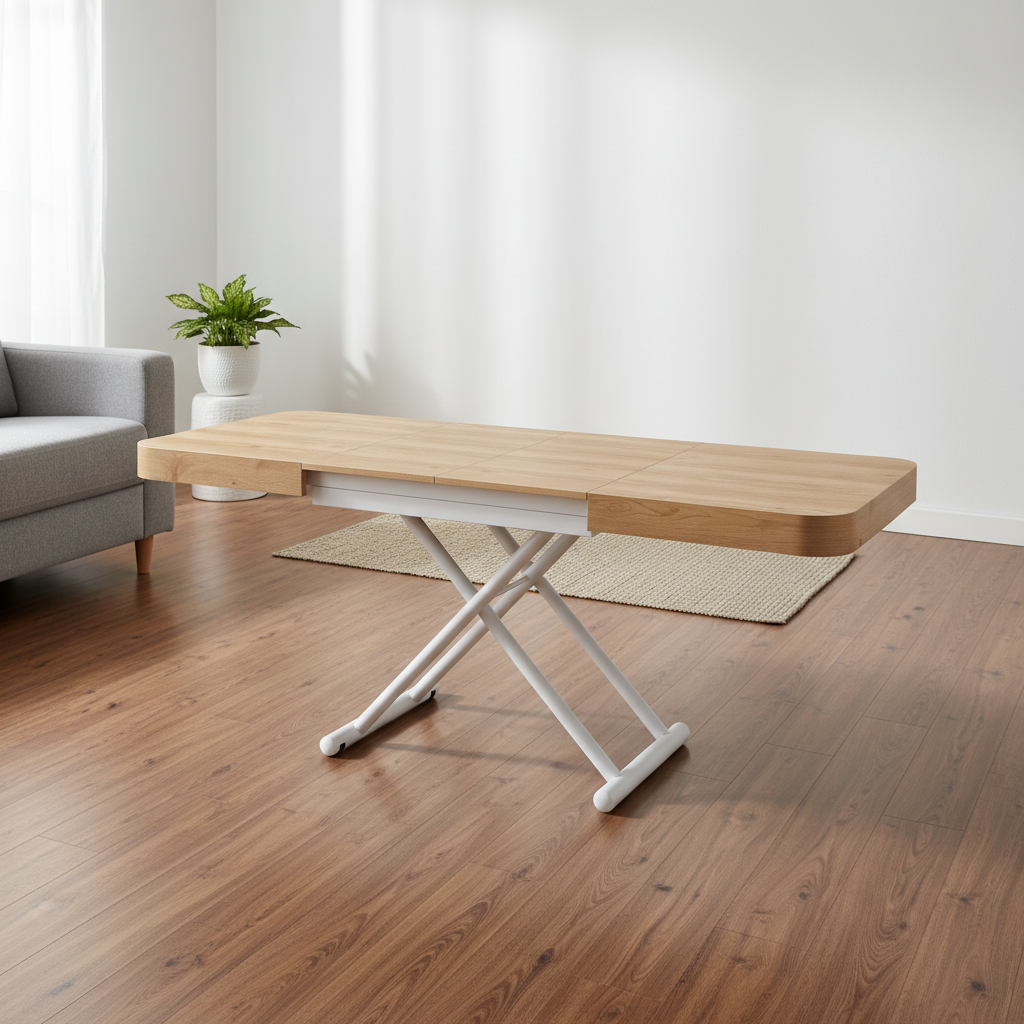 La mesa de centro elevable y extensible destaca por su diseño moderno y funcional, con tapa en melamina de roble que imita la calidez de la madera natural. Su estructura metálica robusta permite una elevación eléctrica suave mediante batería recargable y mando a distancia, ideal para transformar el espacio en segundos. Cuenta con dos paneles extensibles independientes que se deslizan bajo la tapa, ampliando la superficie útil sin esfuerzo. Las patas plegables en forma de tijera facilitan su ajuste de altura, pasando de posición baja para el salón a elevada para comedor. Perfecta para hogares contemporáneos, combina elegancia escandinava con practicidad diaria, soportando el uso intensivo gracias a sus materiales resistentes y mecanismos precisos. Su acabado mate evita huellas y se integra en cualquier decoración minimalista o rústica.