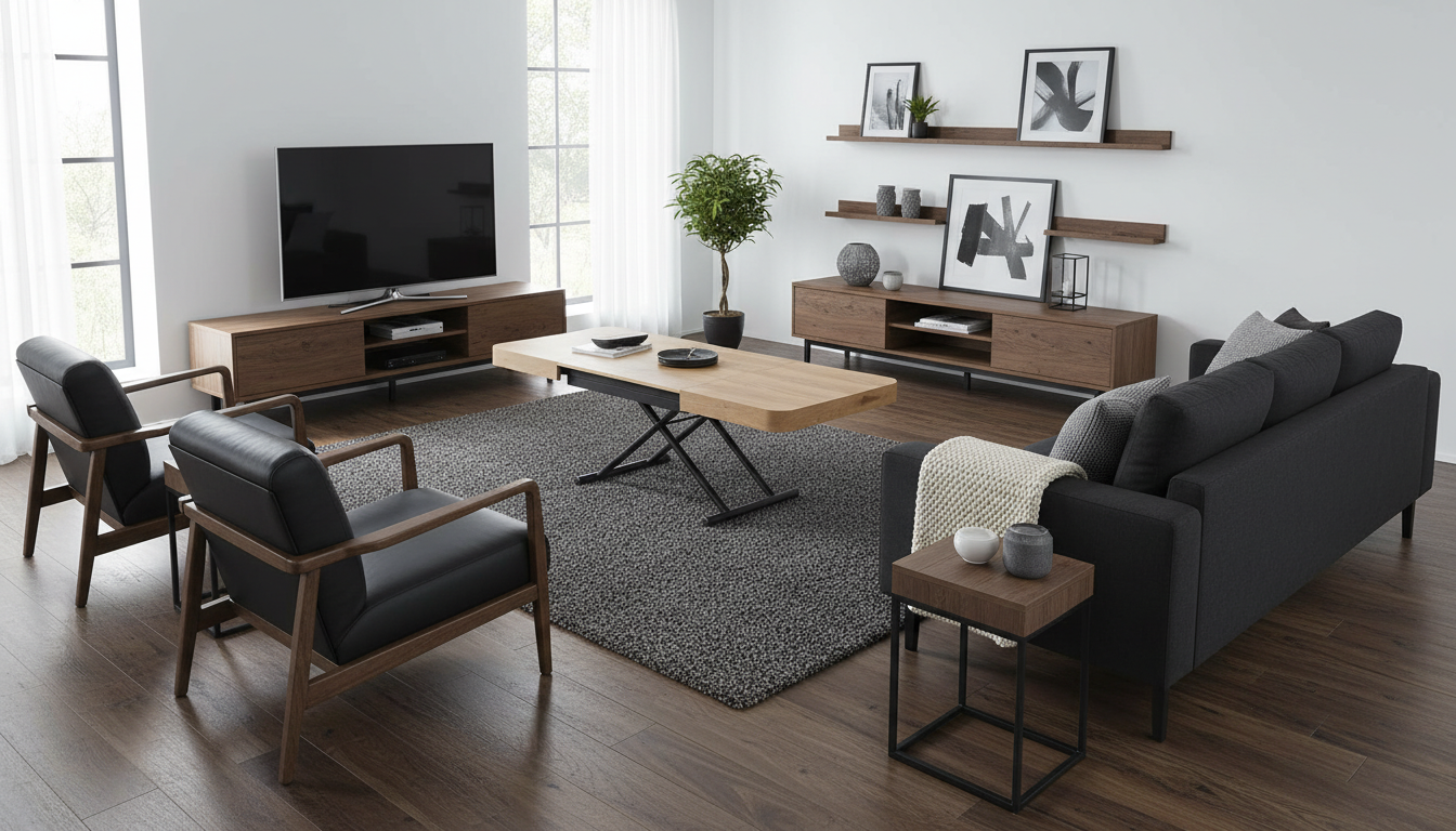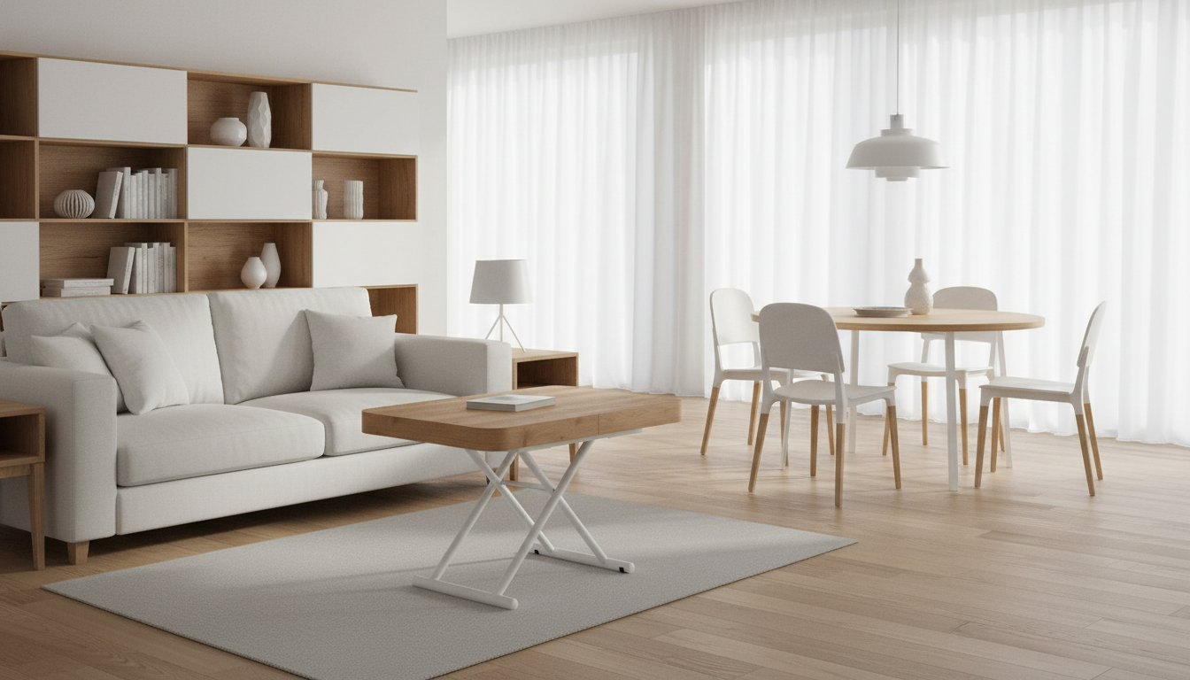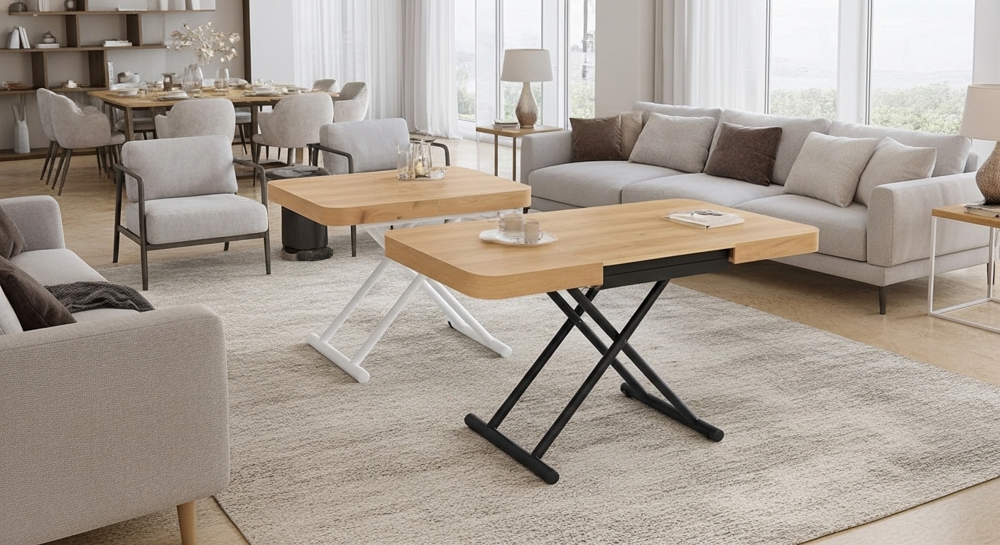Ofrece versatilidad al elevarse y extenderse fácilmente, ahorrando espacio y adaptándose a diferentes usos como salón o comedor.