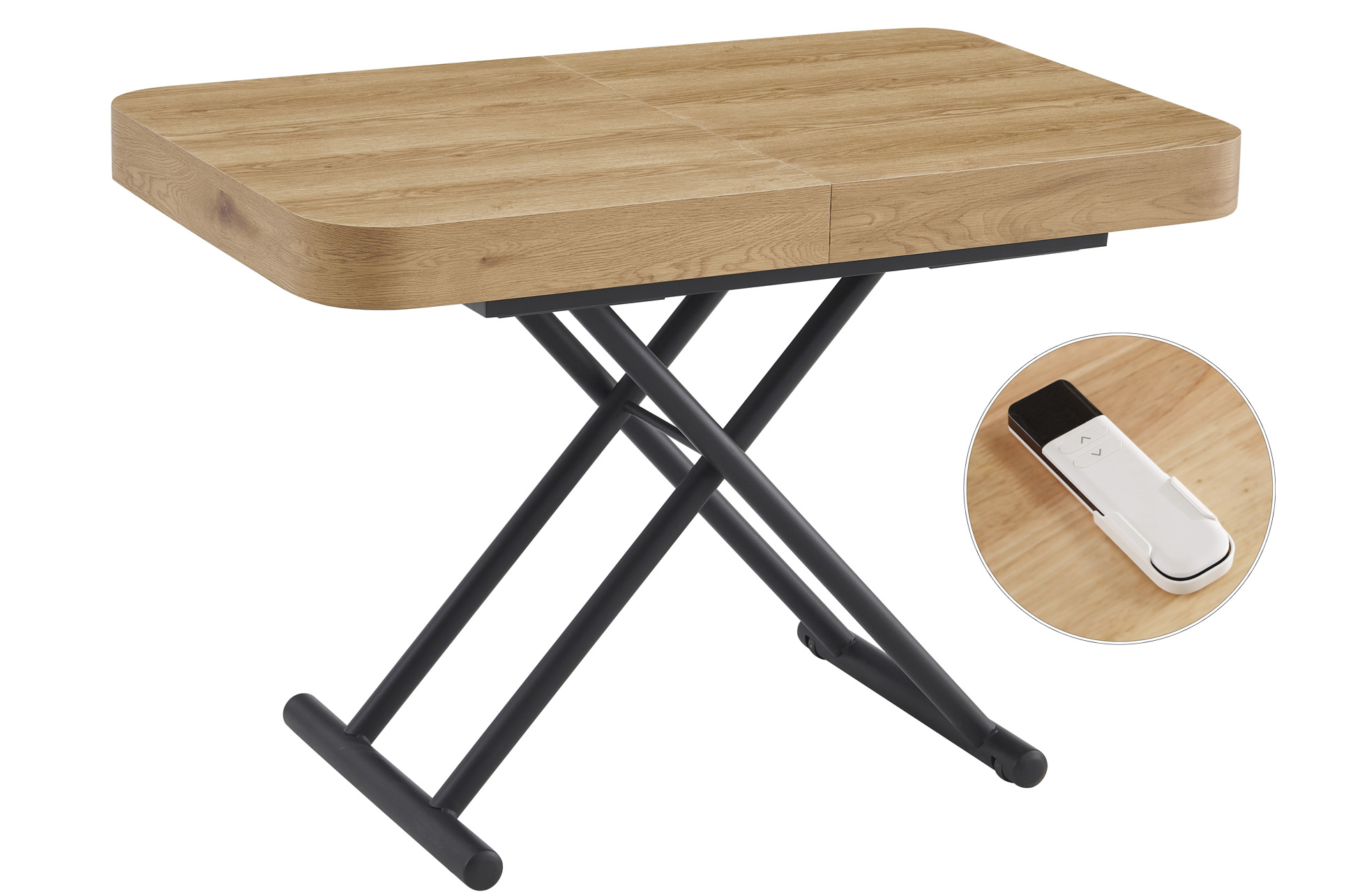 Esta mesa de centro elevable y extensible ofrece tapa en melamina roble y estructura metálica. Elevación eléctrica con batería y mando a distancia, más dos extensibles independientes. Diseño funcional y moderno para uso diario.