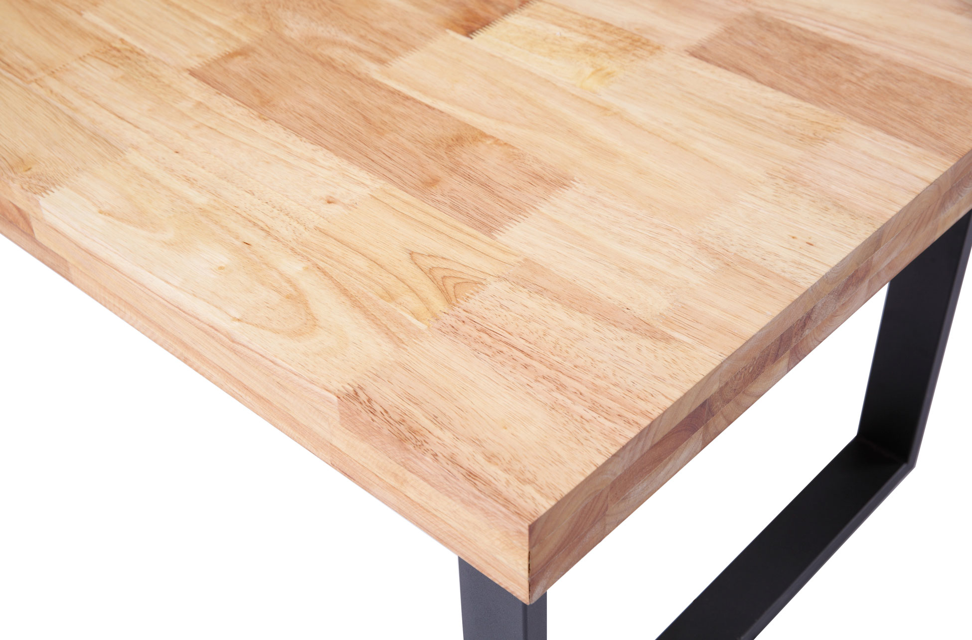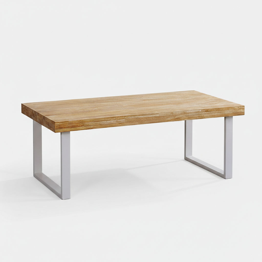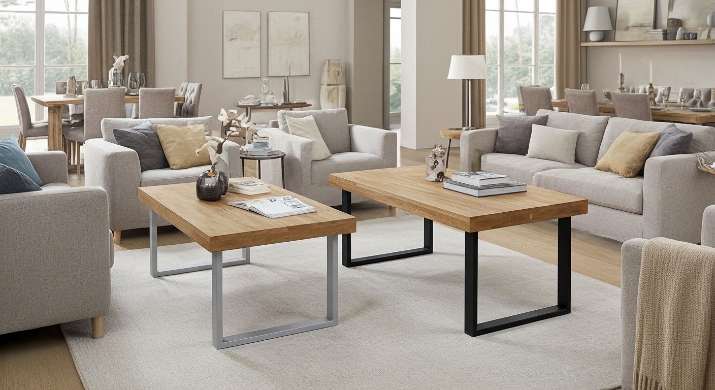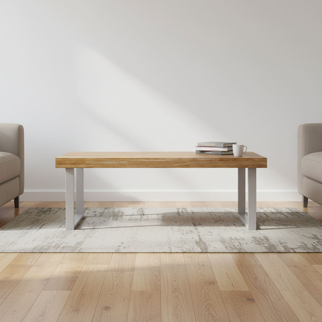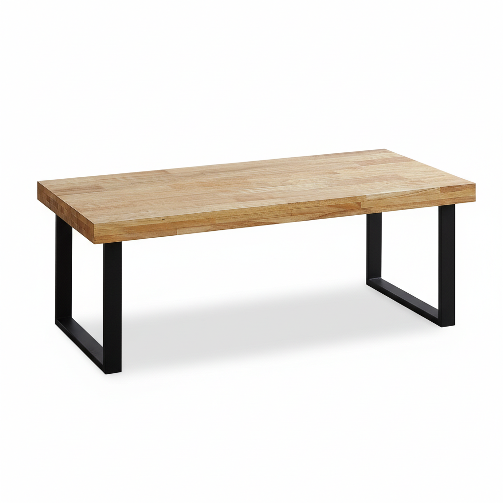 La mesa de centro Natural combina una tapa gruesa de roble nordish con veteado visible y patas metálicas estilizadas en U. Ofrece estabilidad, calidez natural y un diseño minimalista perfecto para salones modernos.