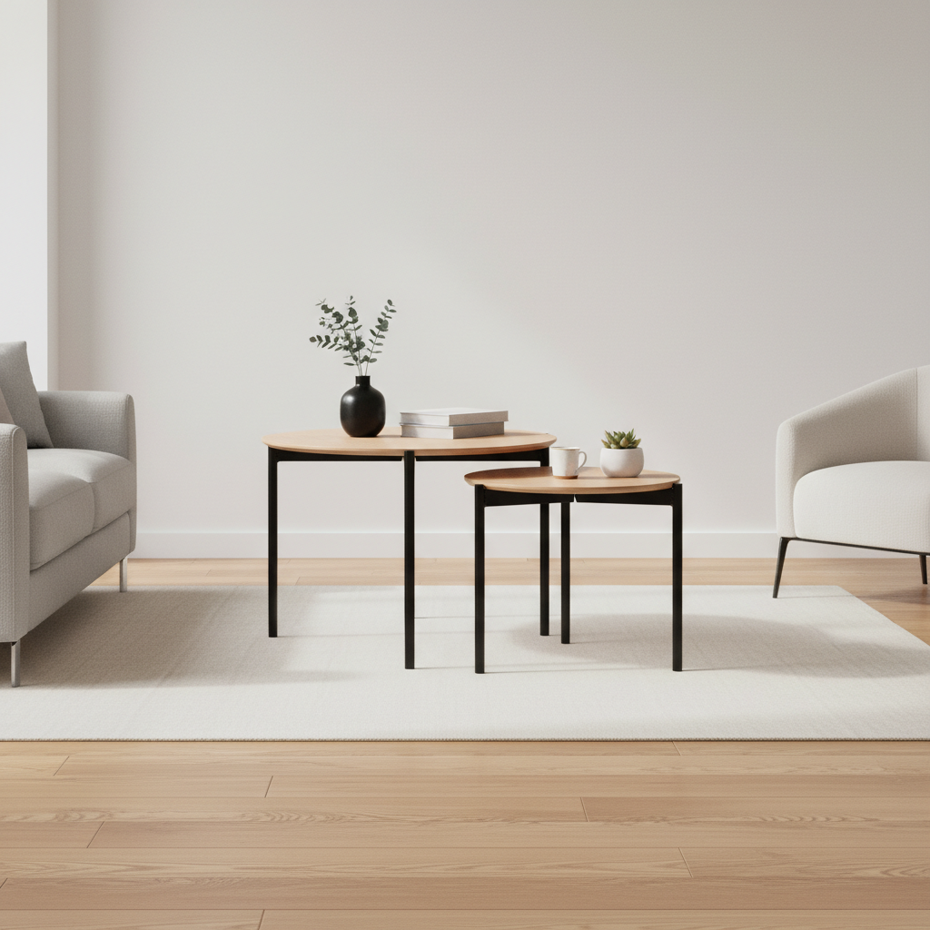 Juego de mesas de centro nido con tapas de MDF laminado 3D roble y patas metálicas negras. Diseño funcional, estable y elegante para optimizar espacios.