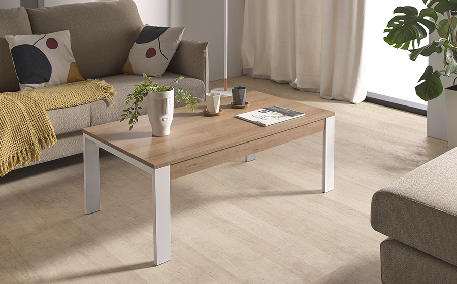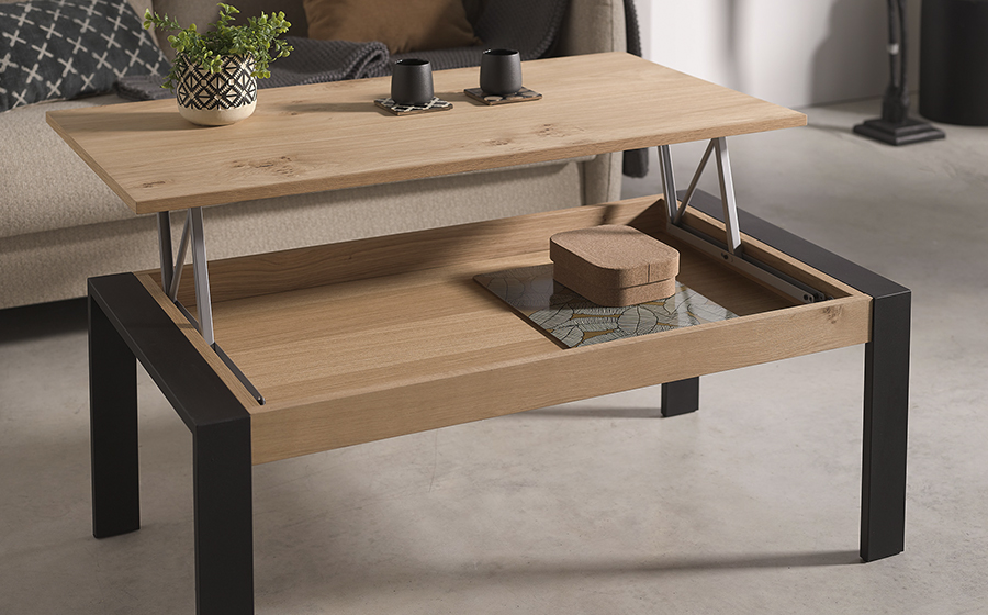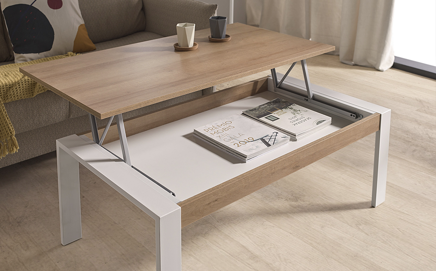 La mesa elevable es mucho más versátil, ya que sirve como mesa auxiliar, escritorio ocasional o espacio para comer desde el sofá. Además, suele incorporar almacenamiento oculto donde puedes guardar objetos y mantener el salón ordenado.