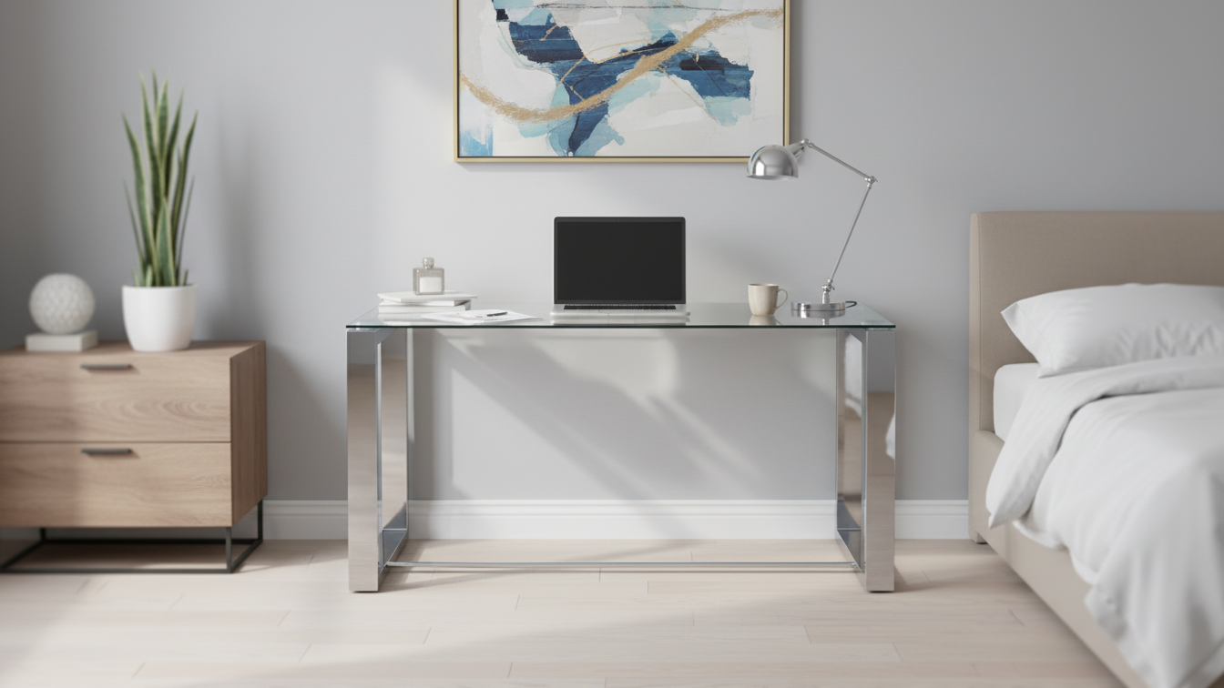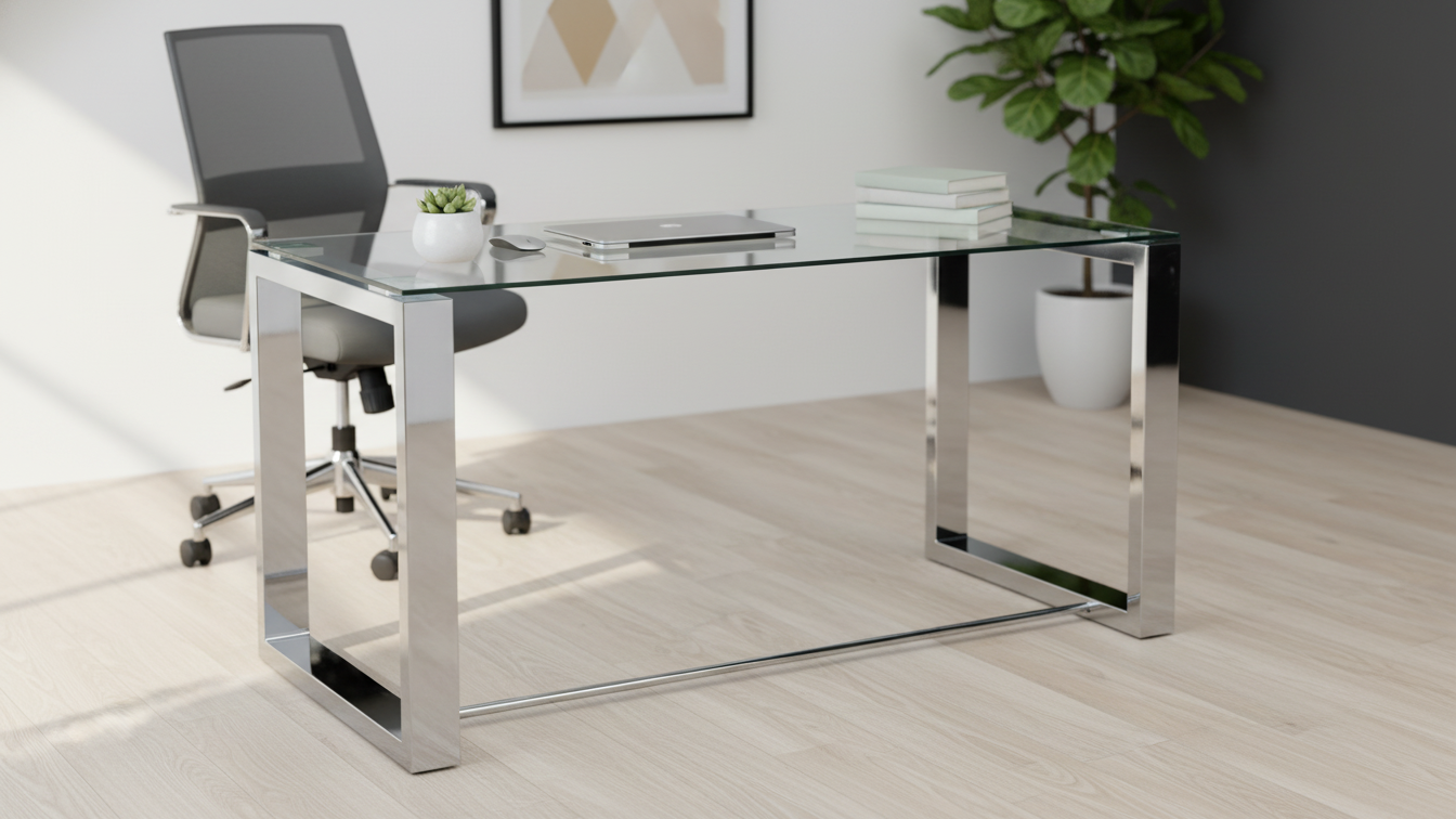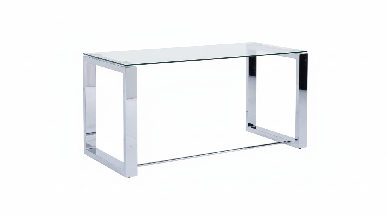 Descripción breve: Mesa de estudio con tablero de cristal templado y estructura metálica cromada, muy estable, de diseño minimalista y ligera visualmente, perfecta para crear una zona de trabajo cómoda en casa o en la oficina.