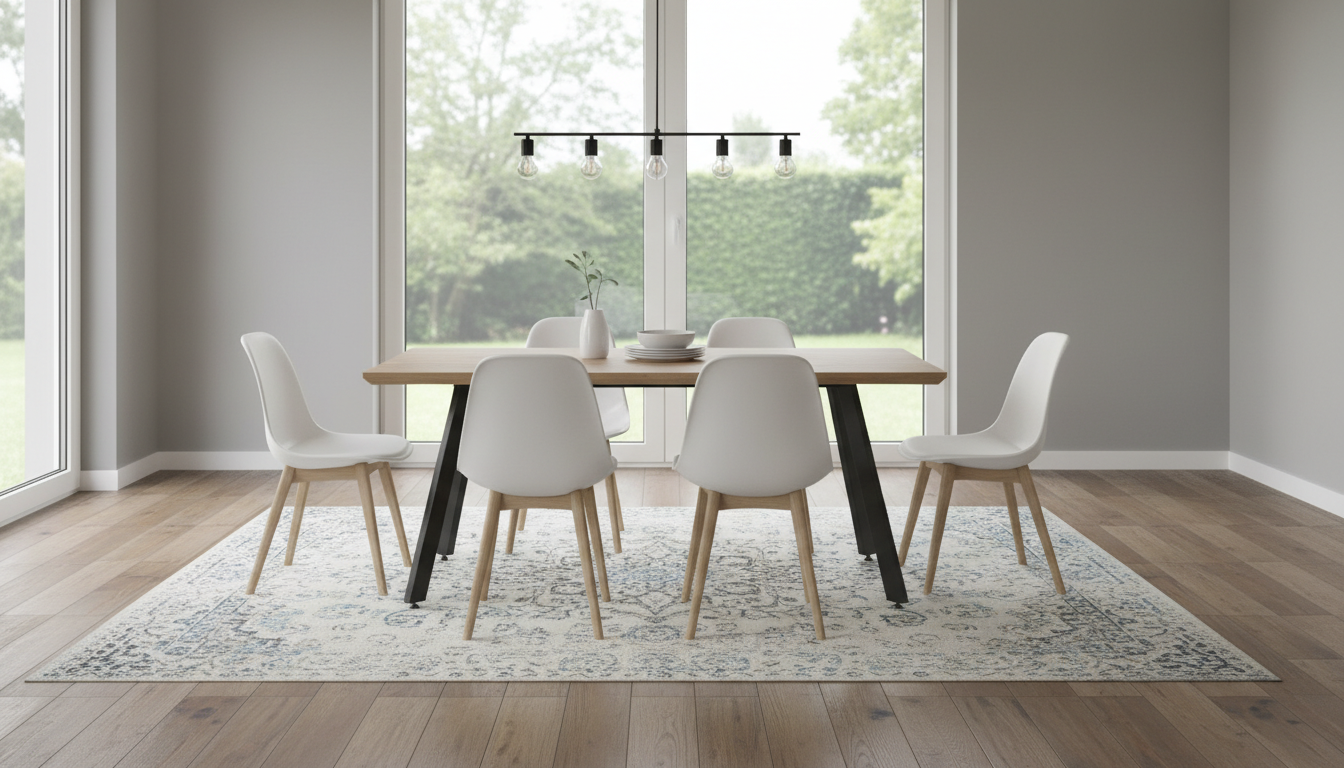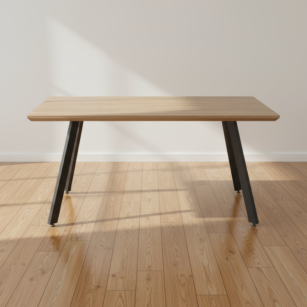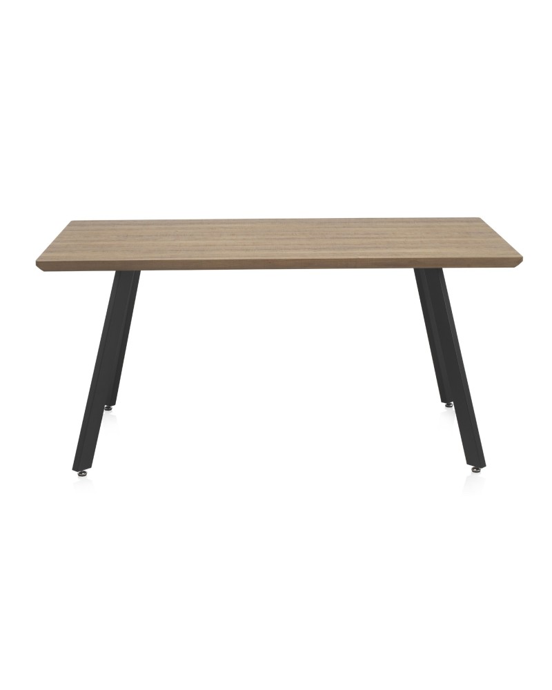 La mesa presenta un diseño rectangular moderno e industrial, con un tablero de melamina en efecto madera de roble natural que aporta calidez y naturalidad al espacio. Sus patas metálicas negras inclinadas ofrecen un aspecto robusto y contemporáneo, ideal para comedores o salas de estar. Con capacidad para 6 personas, combina funcionalidad y estilo minimalista, elevando cualquier ambiente doméstico con su grosor de tablero de 4 cm que garantiza solidez. Las medidas precisas son 160 cm de largo, 90 cm de ancho y 75 cm de alto, facilitando su integración en hogares gallegos. Este modelo destaca por su resistencia diaria y fácil mantenimiento, perfecto para familias activas.