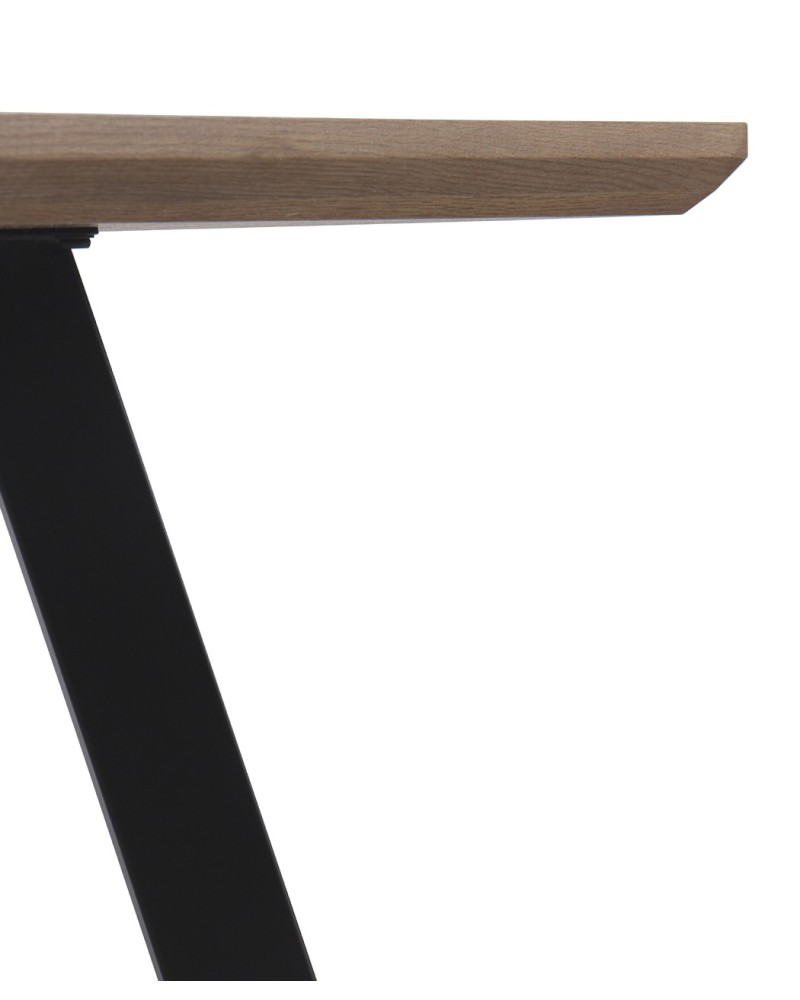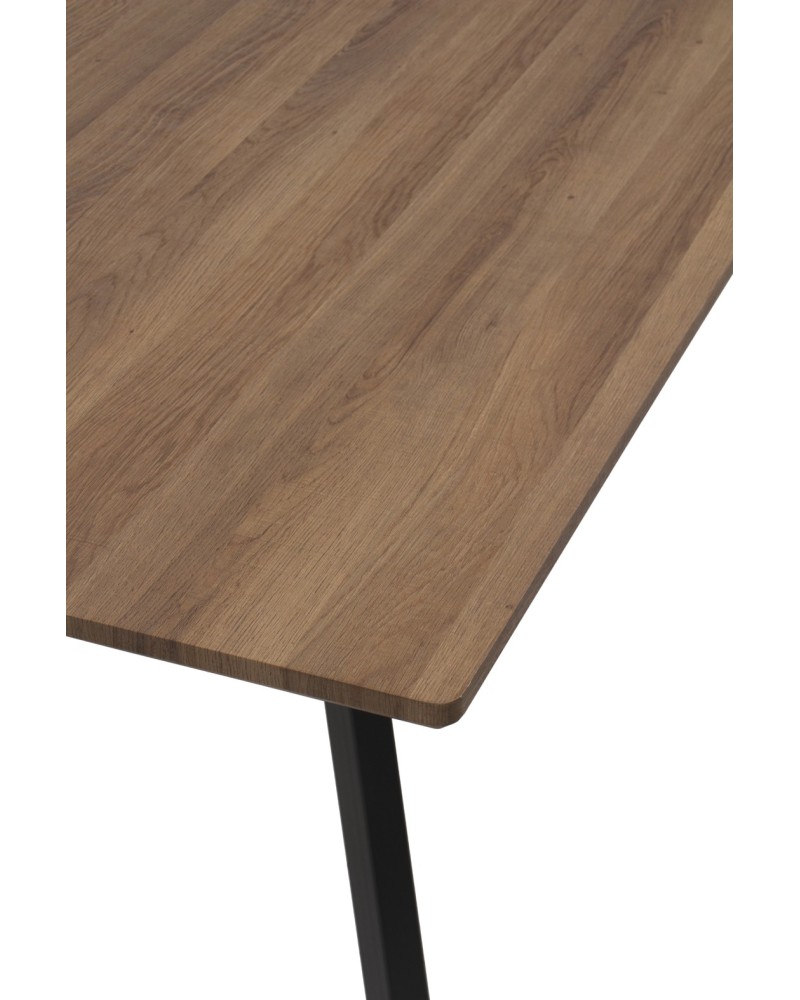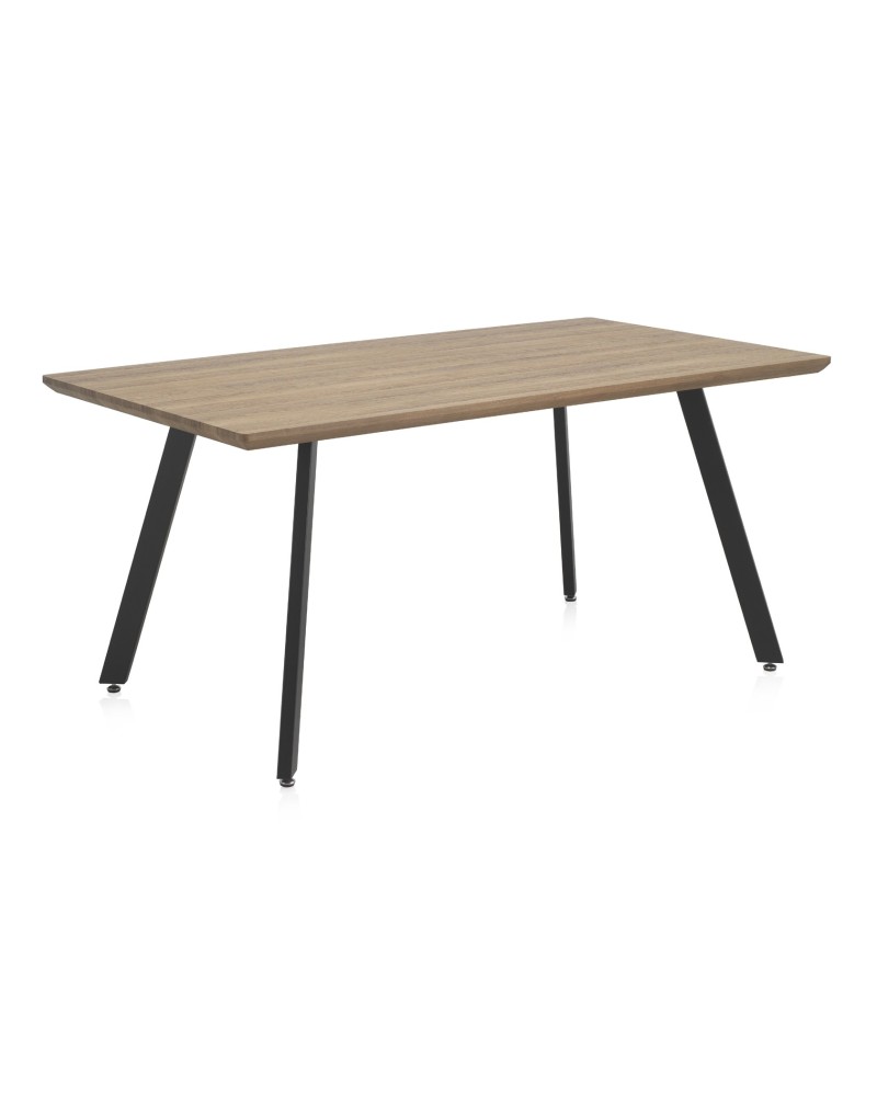 Mesa rectangular de melamina efecto roble con patas metálicas negras. Diseño industrial para 6 personas, robusta y elegante.
