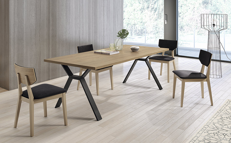Mesa de comedor fija o extensible de estilo moderno, fabricada en madera clara y patas metálicas en color oscuro. Su diseño minimalista aporta elegancia y funcionalidad, ideal para ambientes luminosos y actuales. Perfecta para reuniones familiares o como pieza central en salones contemporáneos.