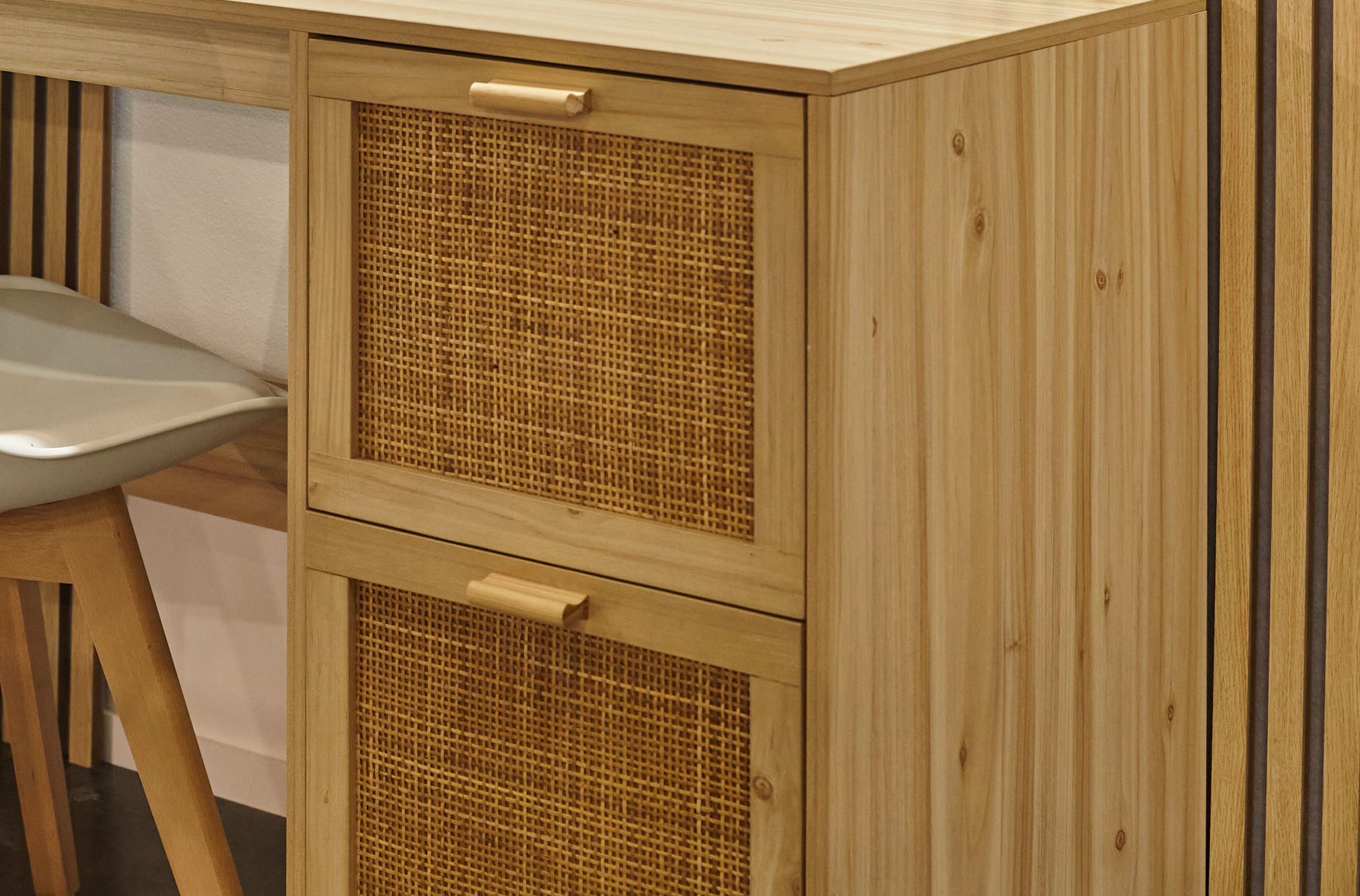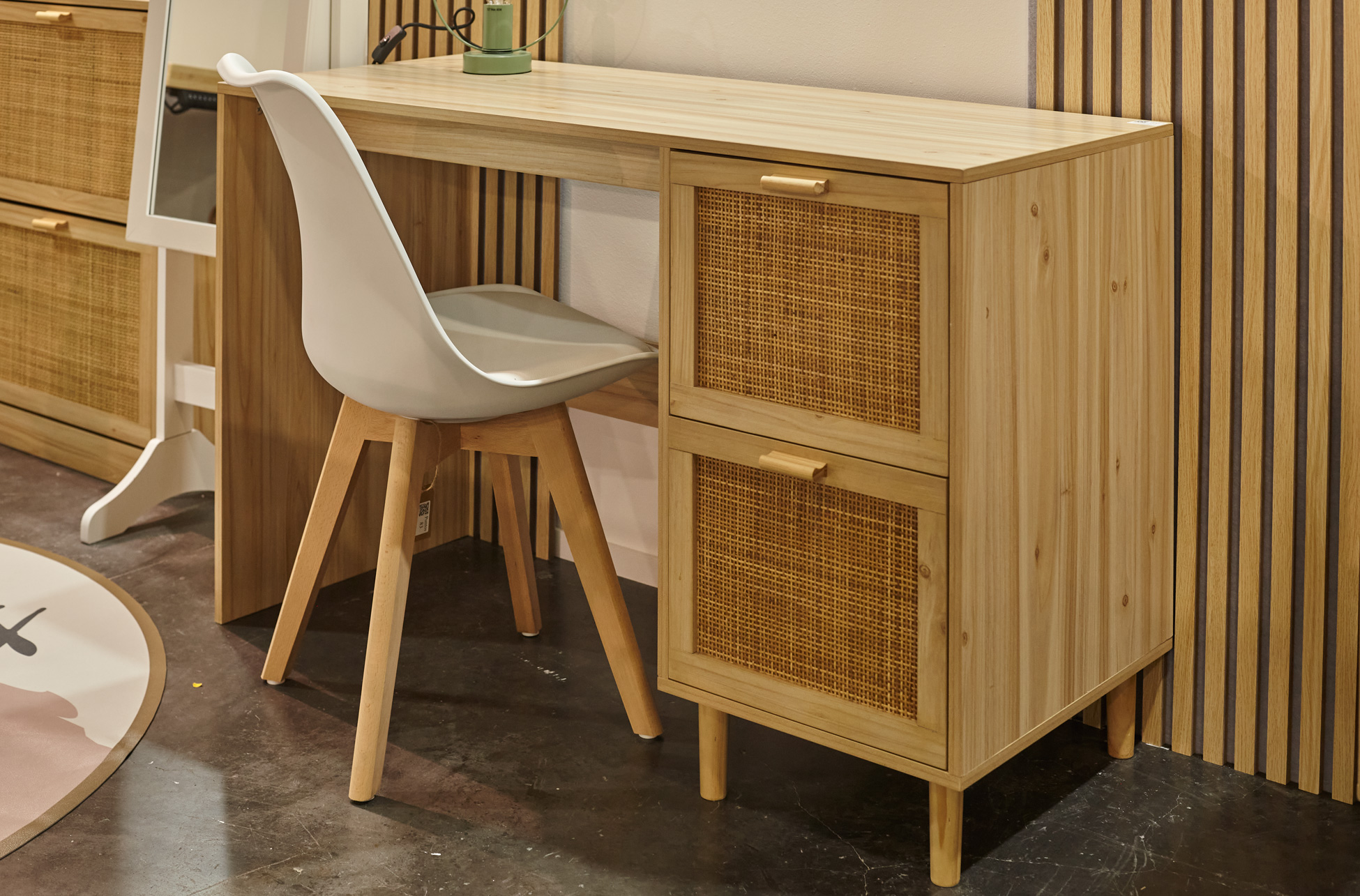 La mesa de estudio Decor ofrece una amplia superficie de trabajo y dos cajones frontales con rejilla de ratán que aportan un toque cálido y natural al espacio. Su diseño recto permite integrarla fácilmente en dormitorios juveniles, despachos o zonas de estudio, creando un ambiente ordenado y funcional. La estructura fija está fabricada en tablero de melamina con acabado tipo pino y se apoya sobre patas de madera de pino, lo que proporciona buena estabilidad durante el uso diario. Los cajones son de gran capacidad, perfectos para guardar material escolar, documentos o pequeños accesorios de oficina, manteniendo la encimera despejada. Es una mesa cómoda para trabajar con ordenador, cuadernos y lámpara de sobremesa, y su estilo sencillo se adapta tanto a decoraciones modernas como rústicas.