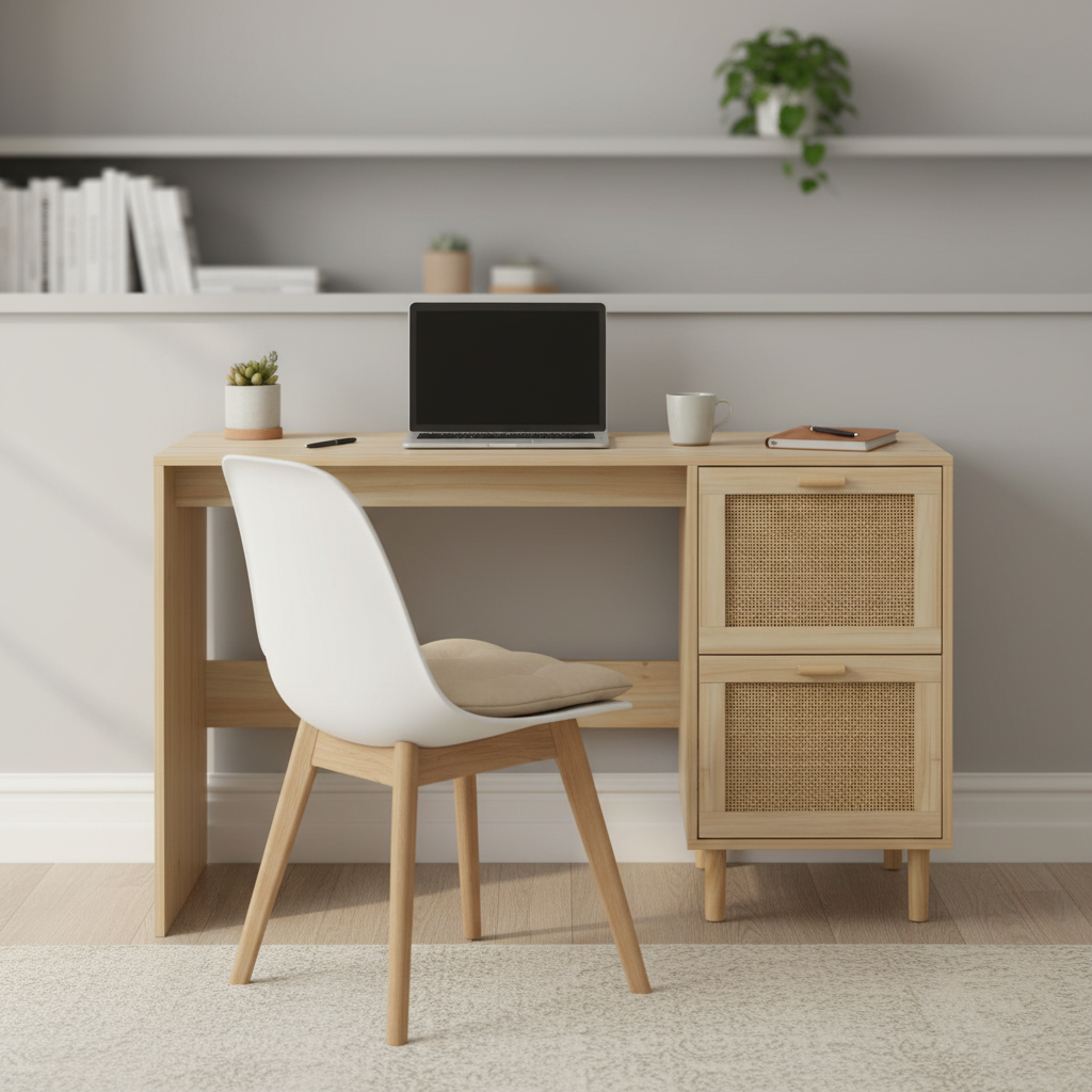 La mesa de estudio Decor combina una superficie funcional con dos cajones amplios decorados en ratán, ideal para organizar libros y material de oficina. Su estructura recta y ligera visualmente facilita que el espacio de estudio se vea despejado y ordenado.