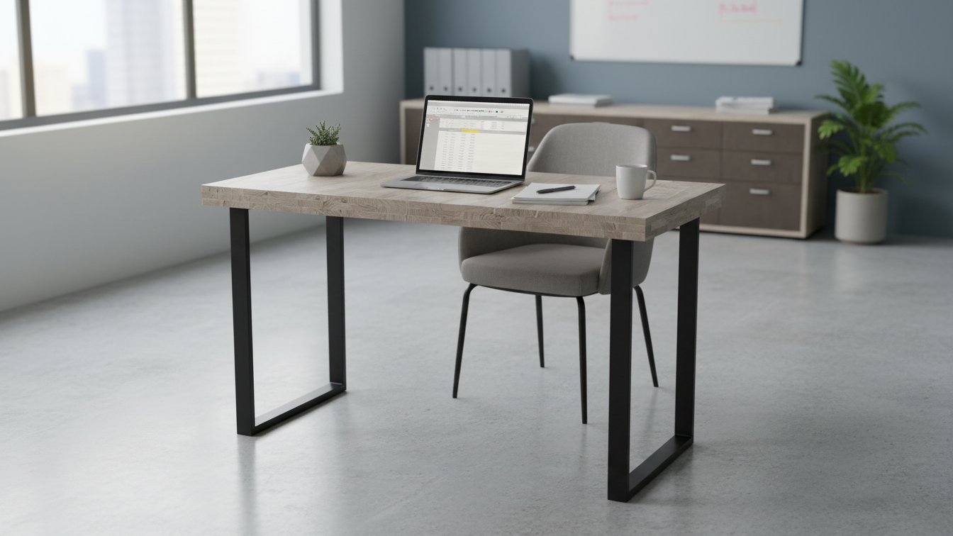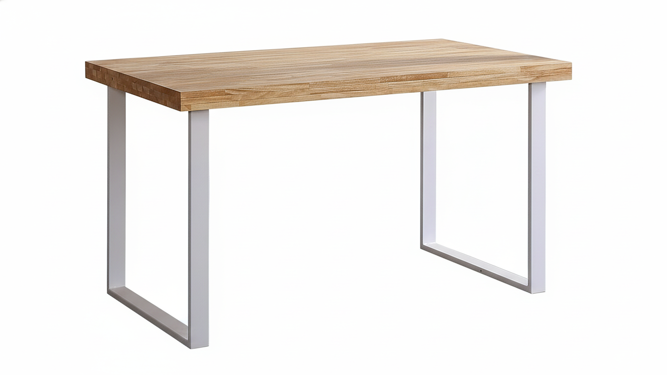 Mesa de estudio con tapa de madera y patas metálicas de líneas rectas, pensada para integrarse fácilmente en diferentes estilos decorativos y mantener el área de trabajo ordenada.