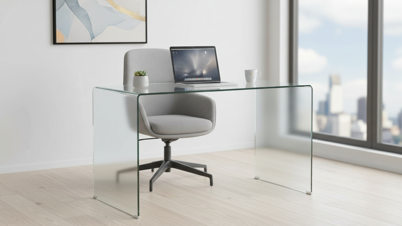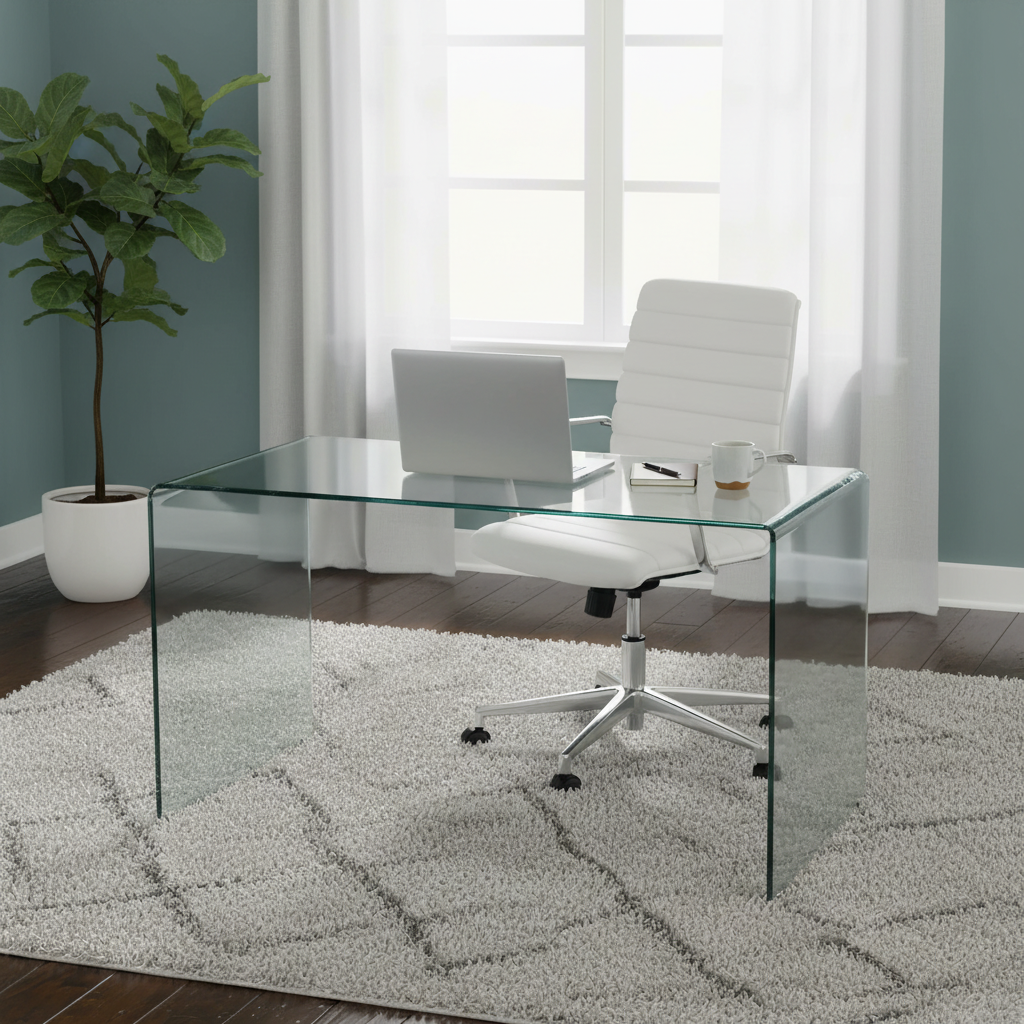 Esta mesa de estudio presenta una estructura de una sola pieza de cristal curvado, que aporta un estilo muy limpio y contemporáneo. La transparencia del vidrio ayuda a que el espacio de trabajo parezca más amplio y despejado, por lo que funciona muy bien en despachos pequeños o habitaciones juveniles. La encimera es amplia para colocar ordenador, teclado, documentos y accesorios sin sensación de agobio. El vidrio templado ofrece una superficie firme y resistente al uso diario, adecuada para teletrabajo, estudio o tareas creativas. Las esquinas redondeadas mejoran la seguridad y aportan un acabado elegante.