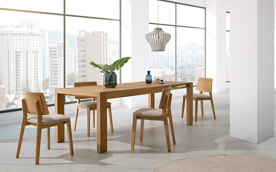 Mesa comedor extensible, con 1 o 2 extensibles, pata de madera y sobre en chapa natural o melamina.