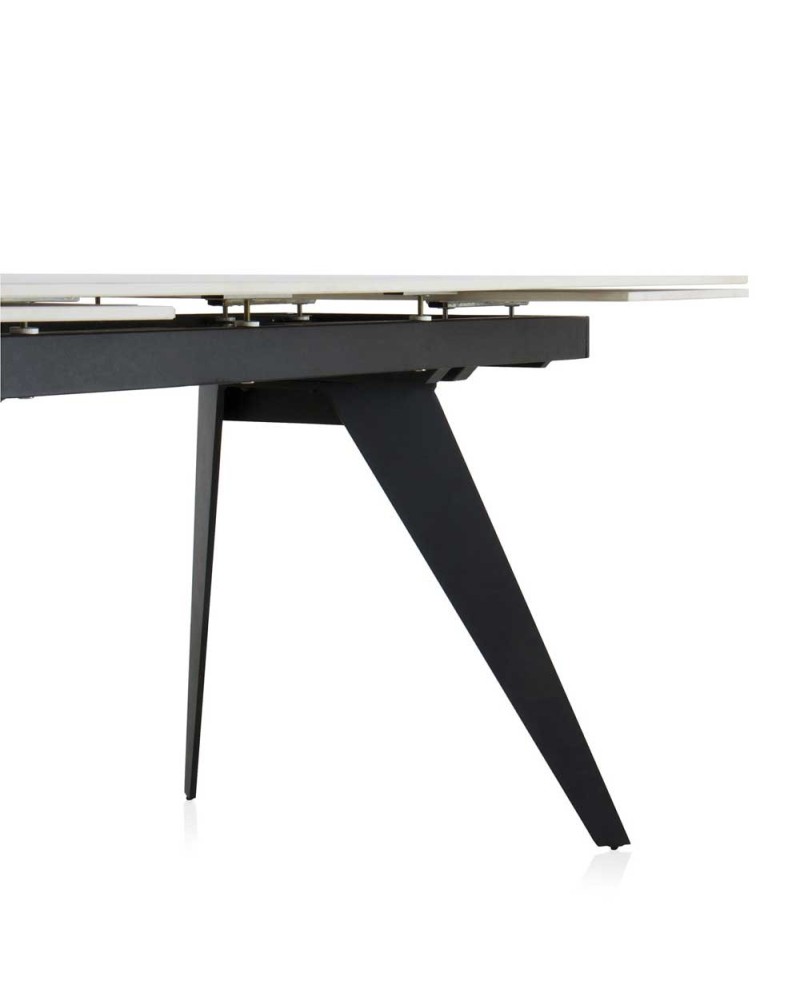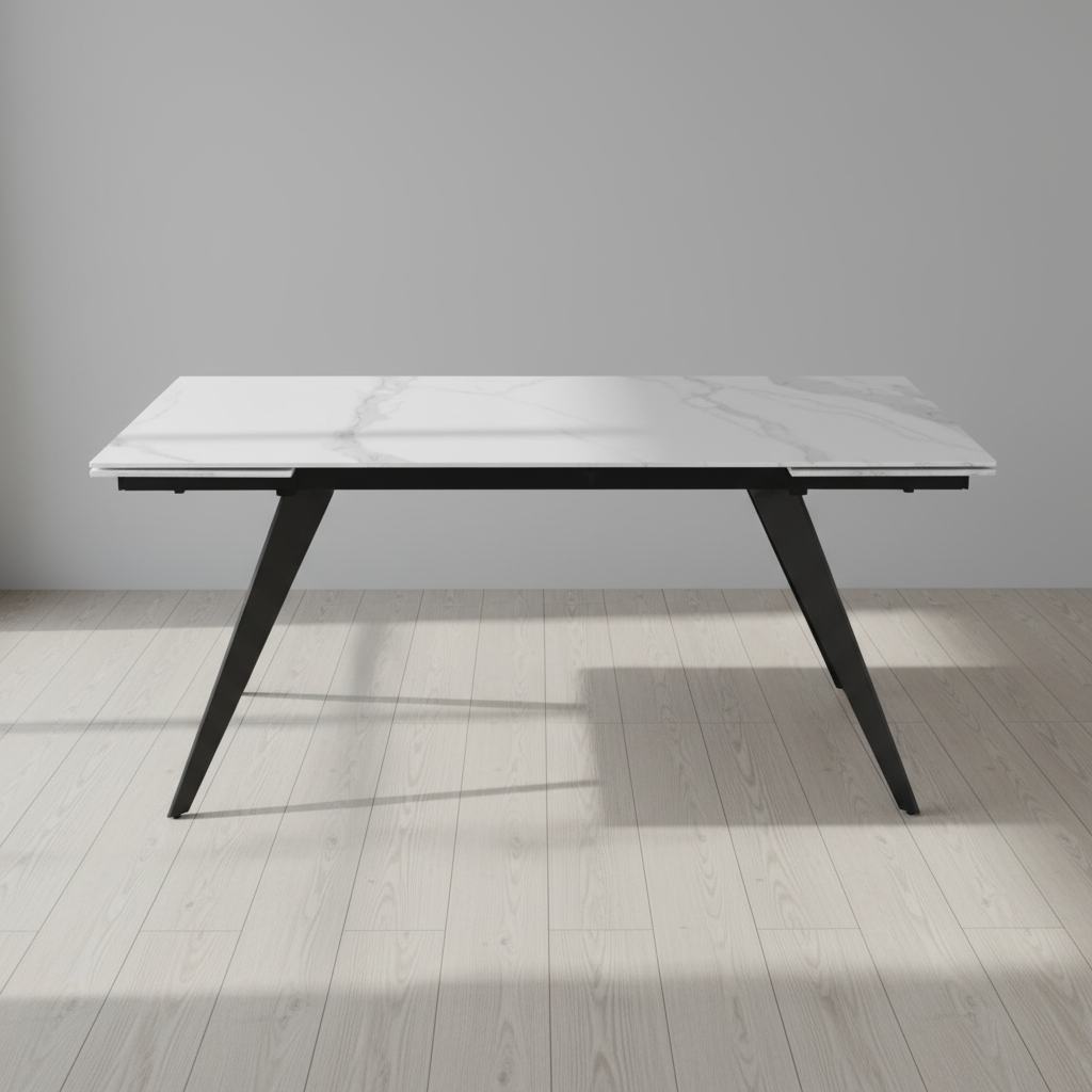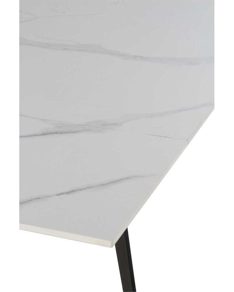 Mesa extensible elegante con tablero cerámico efecto mármol blanco y pies metálicos negros. Se adapta fácilmente a reuniones grandes gracias a su mecanismo automático y diseño resistente.