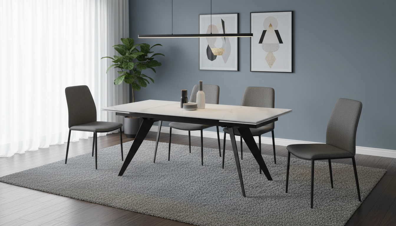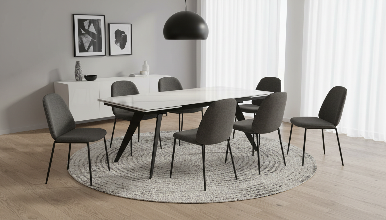 Esta mesa extensible destaca por su tablero de cerámica imitación mármol blanco de 10 mm de grosor, que imita fielmente la elegancia del mármol natural con vetas sutiles y acabado brillante. Se extiende de 180 cm a 260 cm de largo, con un ancho de 95 cm y altura de 76 cm, permitiendo acomodar cómodamente a 10-12 comensales. Los pies metálicos en color negro, de diseño en V invertida, aportan estabilidad y un toque industrial chic. Cuenta con apertura y cierre automático para un uso intuitivo y rápido. Fabricada con materiales duraderos como cerámica resistente a rayones y altas temperaturas, y hierro pintado para evitar óxido, es ideal para hogares dinámicos. Su peso equilibrado facilita el manejo diario, y el montaje es sencillo, centrado en fijar las patas. Perfecta para espacios gallegos luminosos, eleva cualquier comida con su presencia sofisticada y práctica.