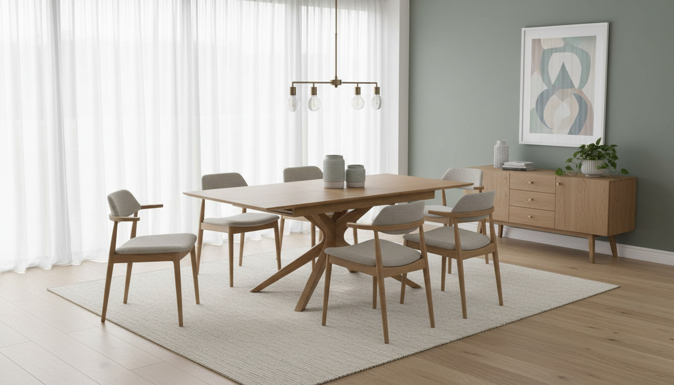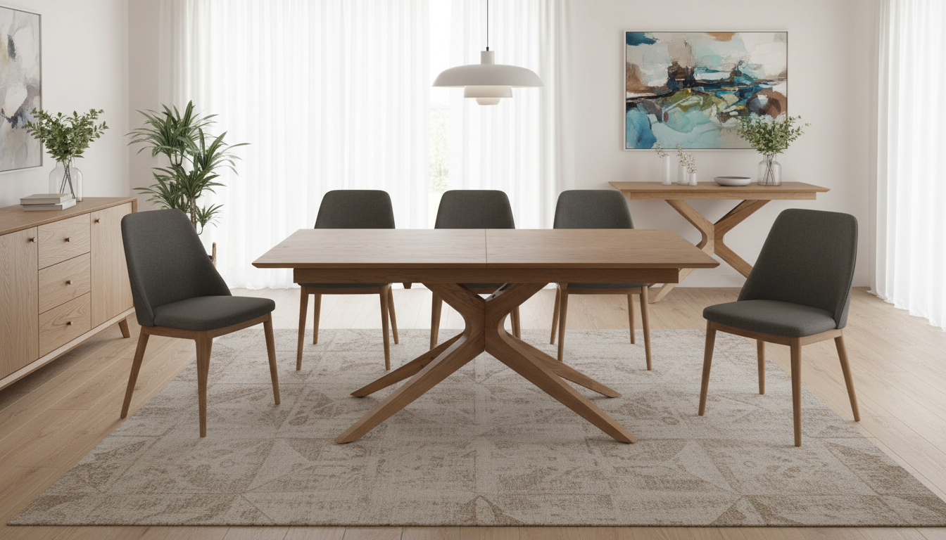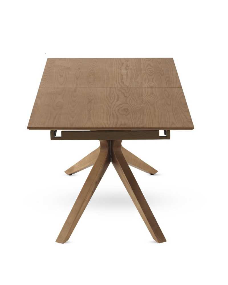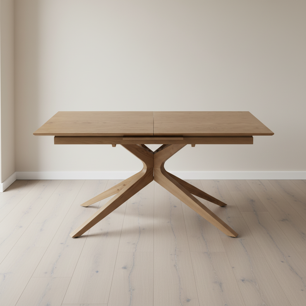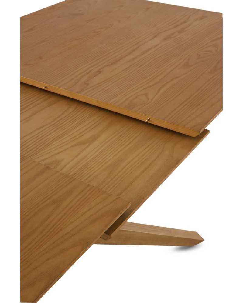 Mesa extensible de comedor con sobre en madera de fresno natural y pie robusto de roble. Se expande fácilmente para más comensales, combinando elegancia, estabilidad y practicidad diaria.