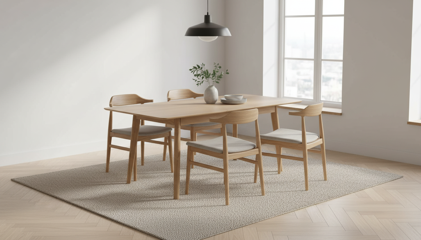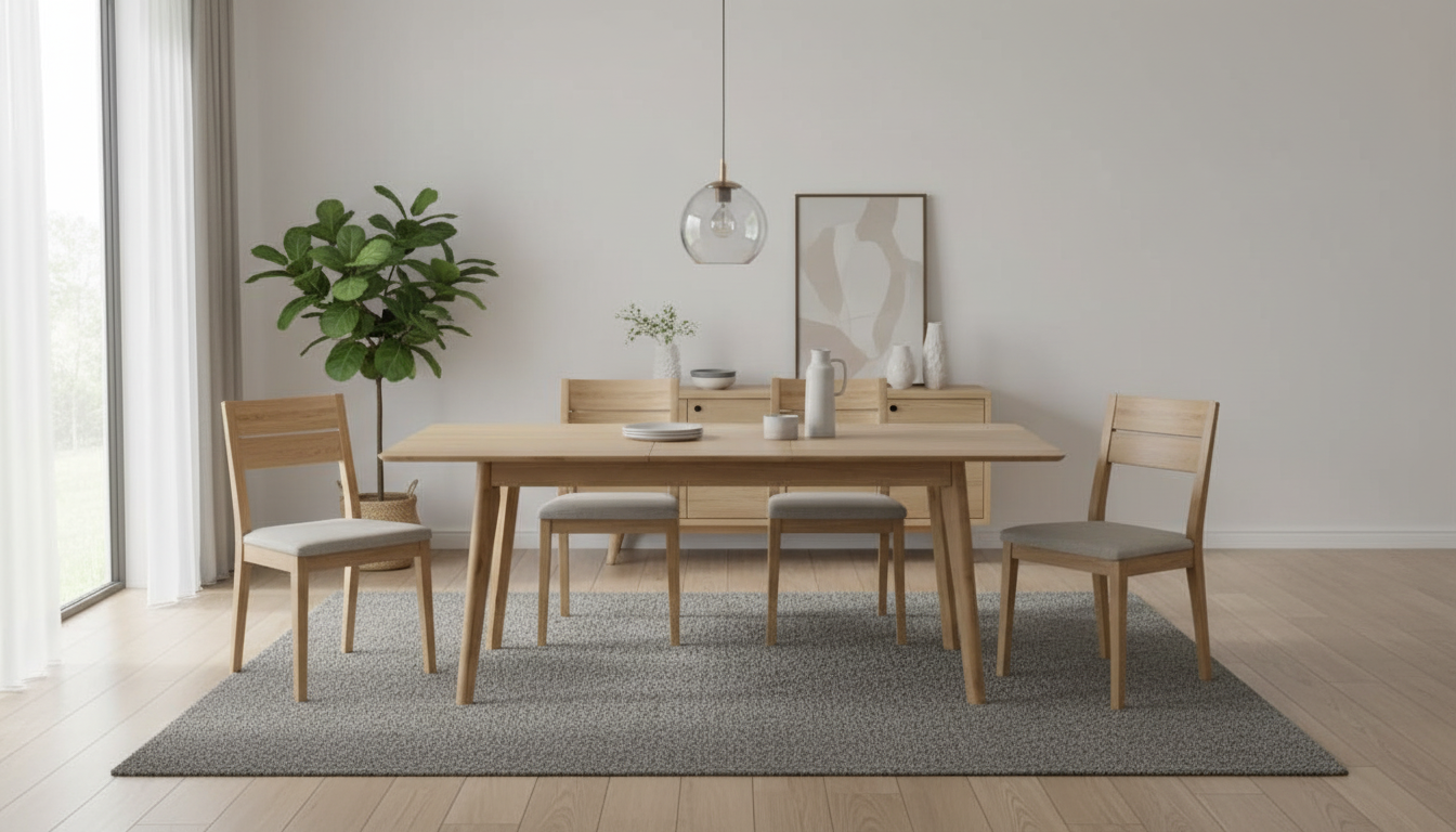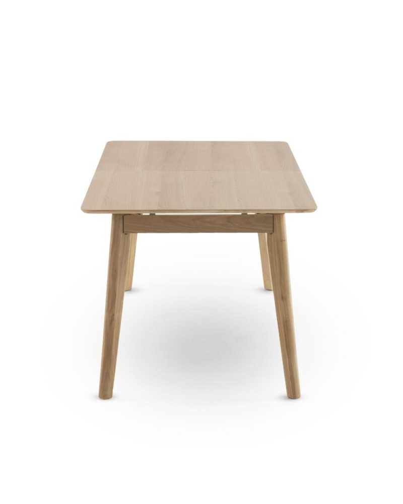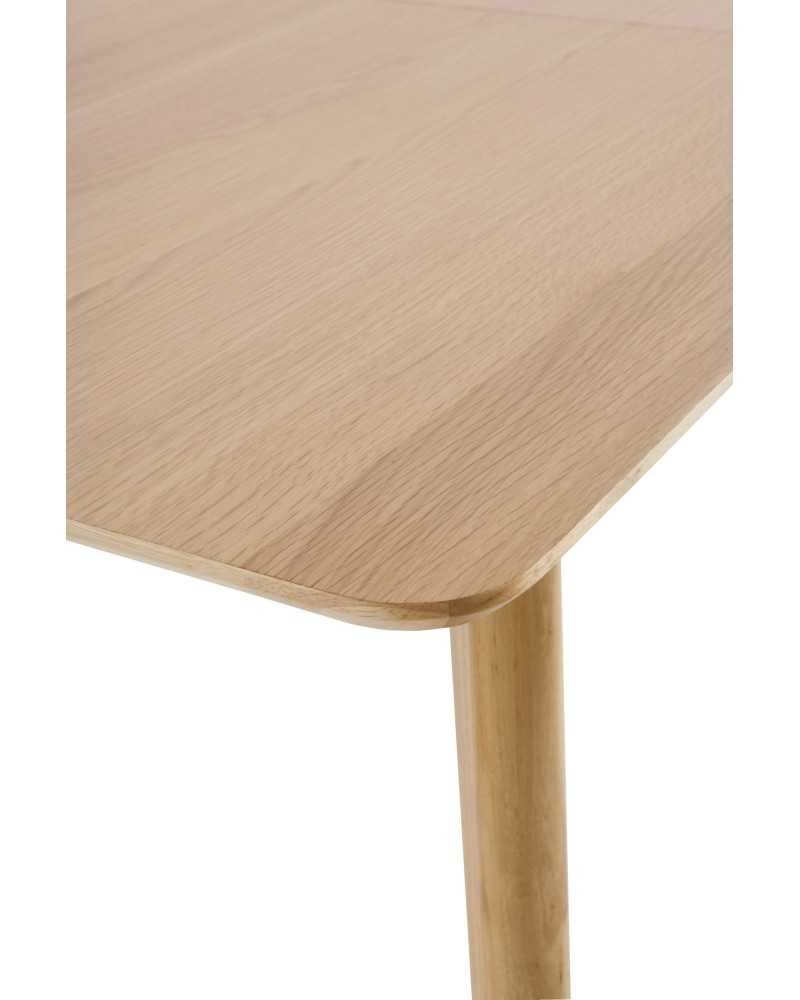 Mesa de comedor extensible con tablero en roble natural y patas torneadas de hevea. Se amplía automáticamente para más comensales, combinando robustez, elegancia y facilidad de uso en un diseño rectangular suave.