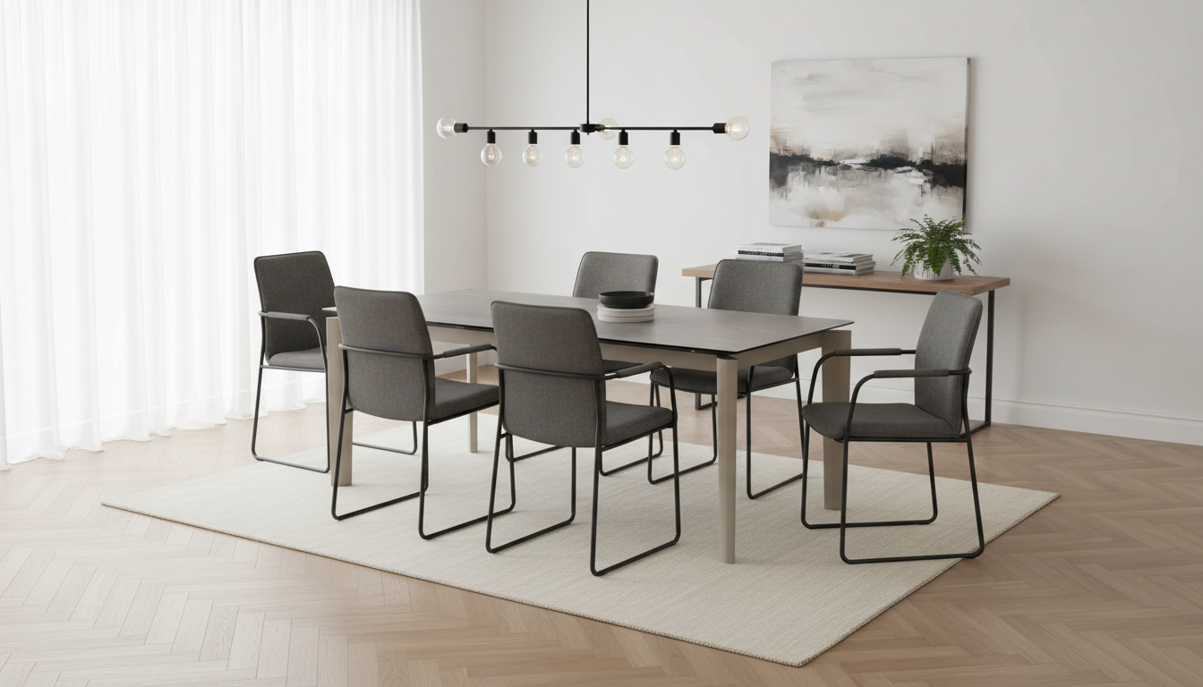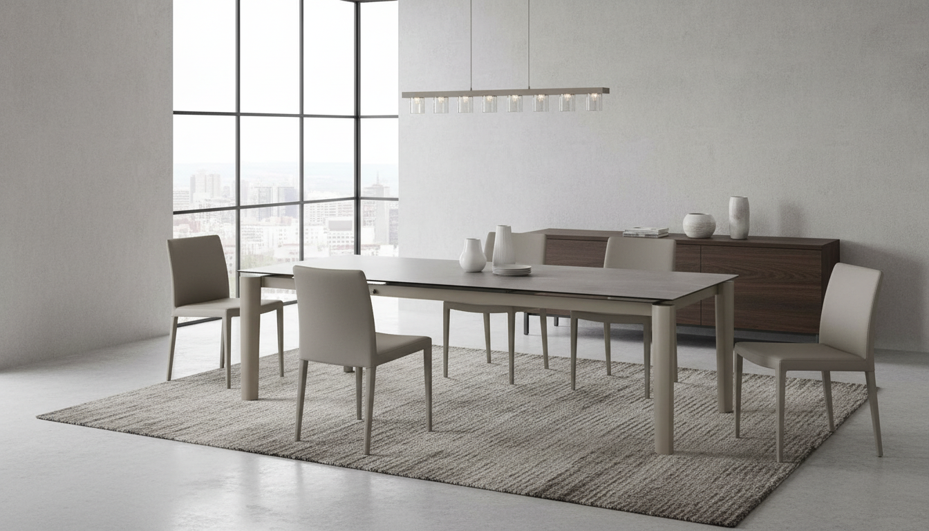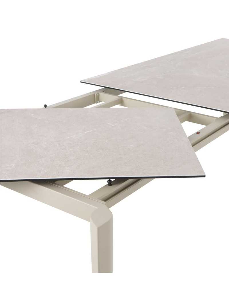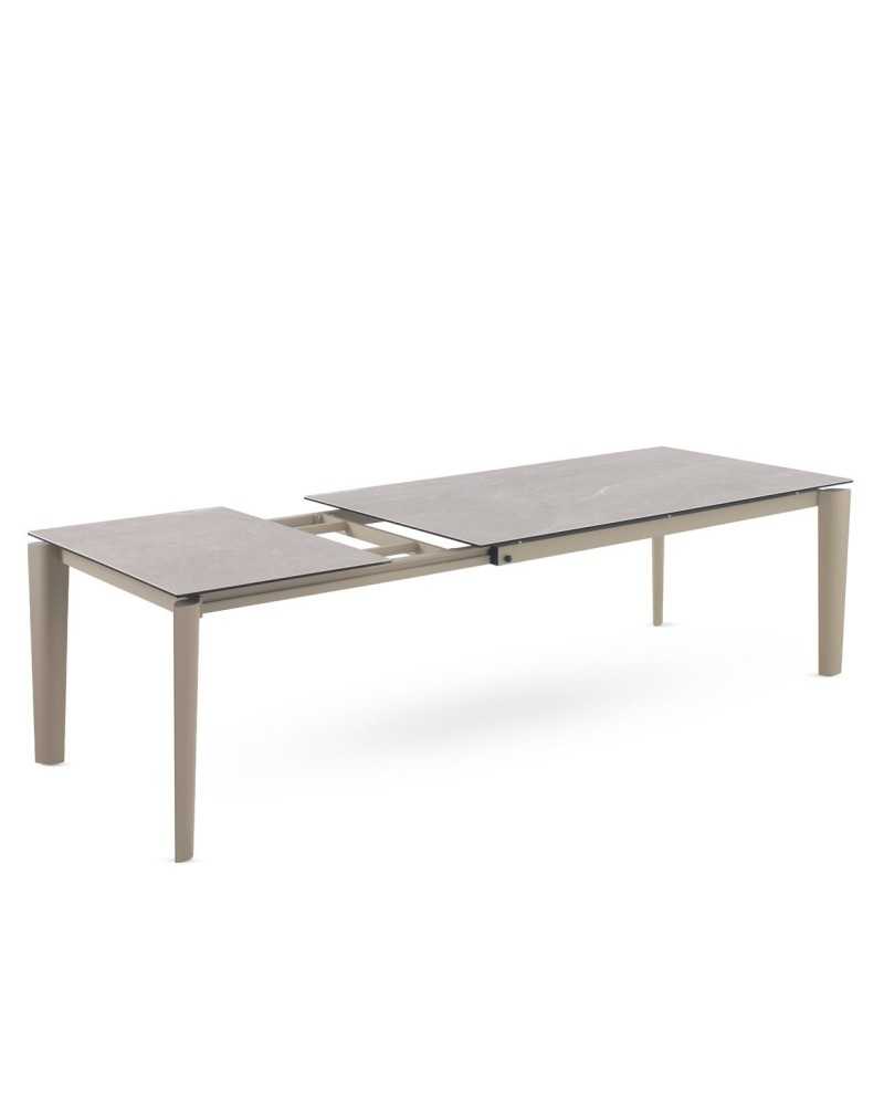 Mesa rectangular extensible con encimera cerámica mate en tono topo y estructura metálica. Se abre fácilmente para más comensales, combinando elegancia y practicidad en comedores modernos.