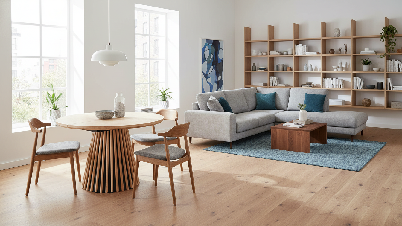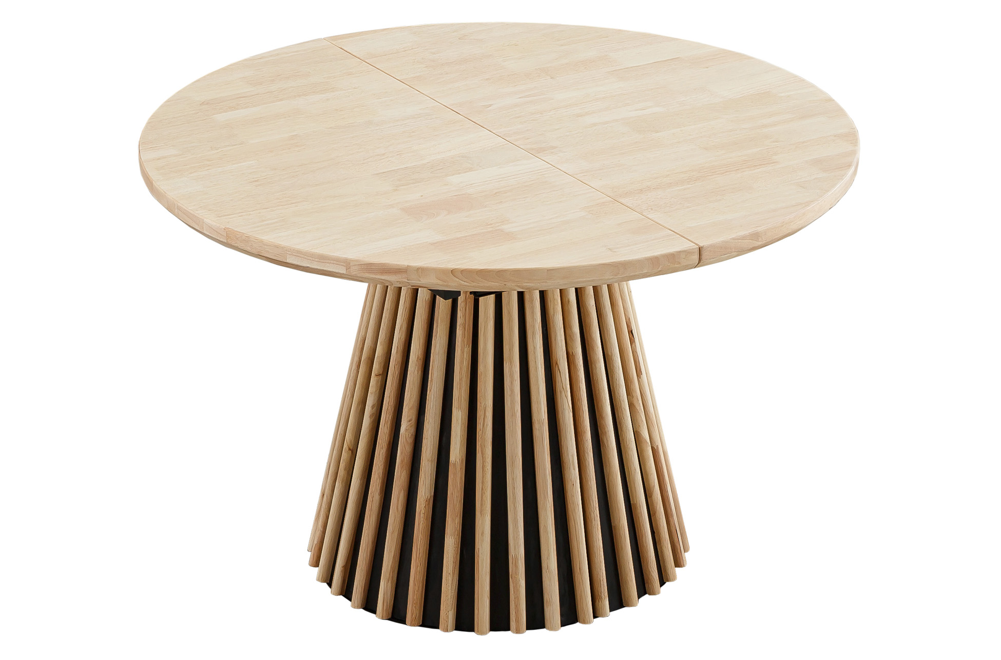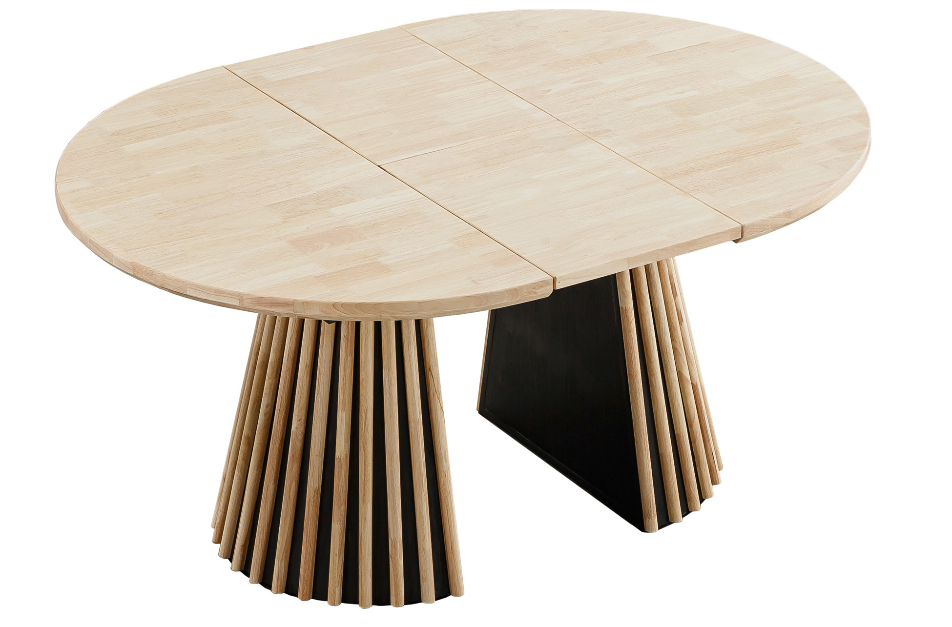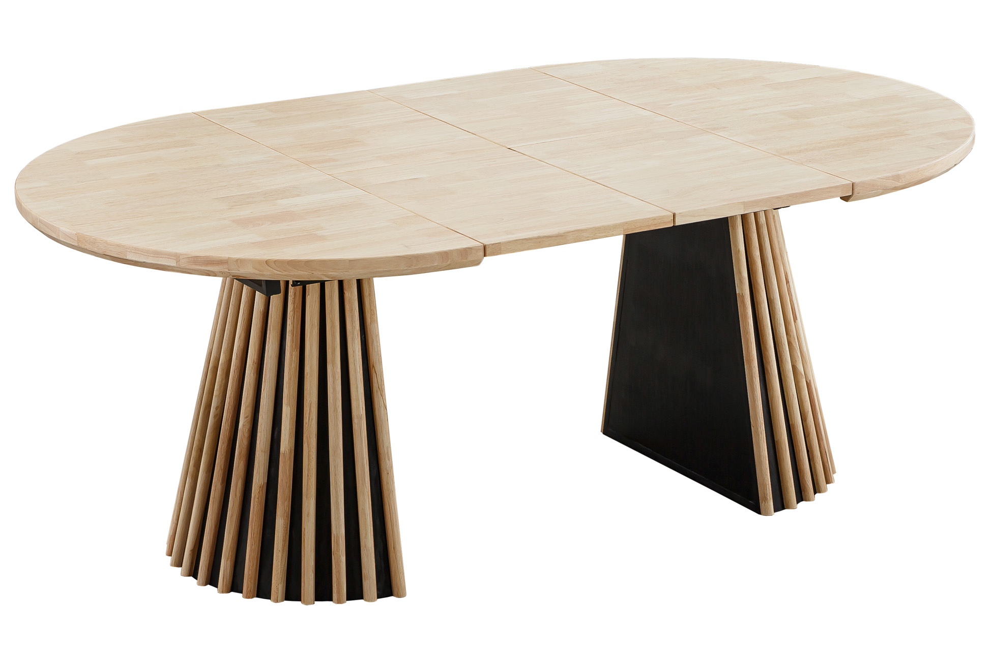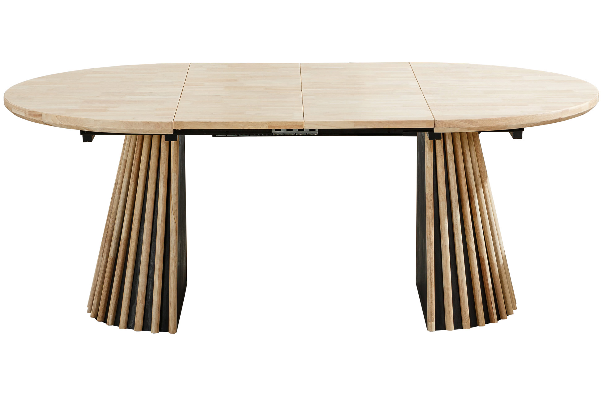 Mesa extensible de comedor con tapa ovalada y elegante base de listones, que se abre con un mecanismo central suave para ganar plazas extra manteniendo un estilo moderno y acogedor en el salón.