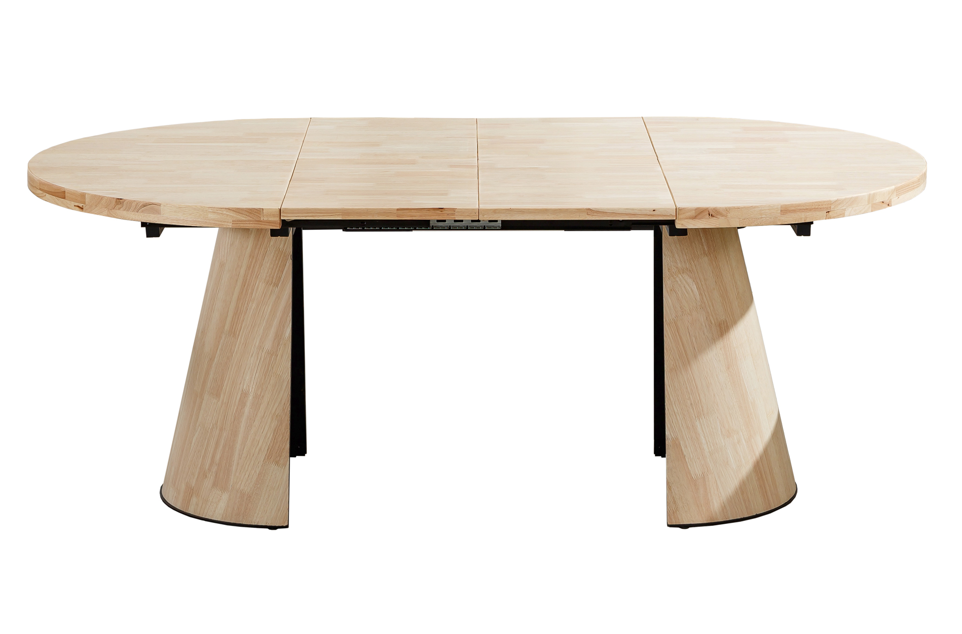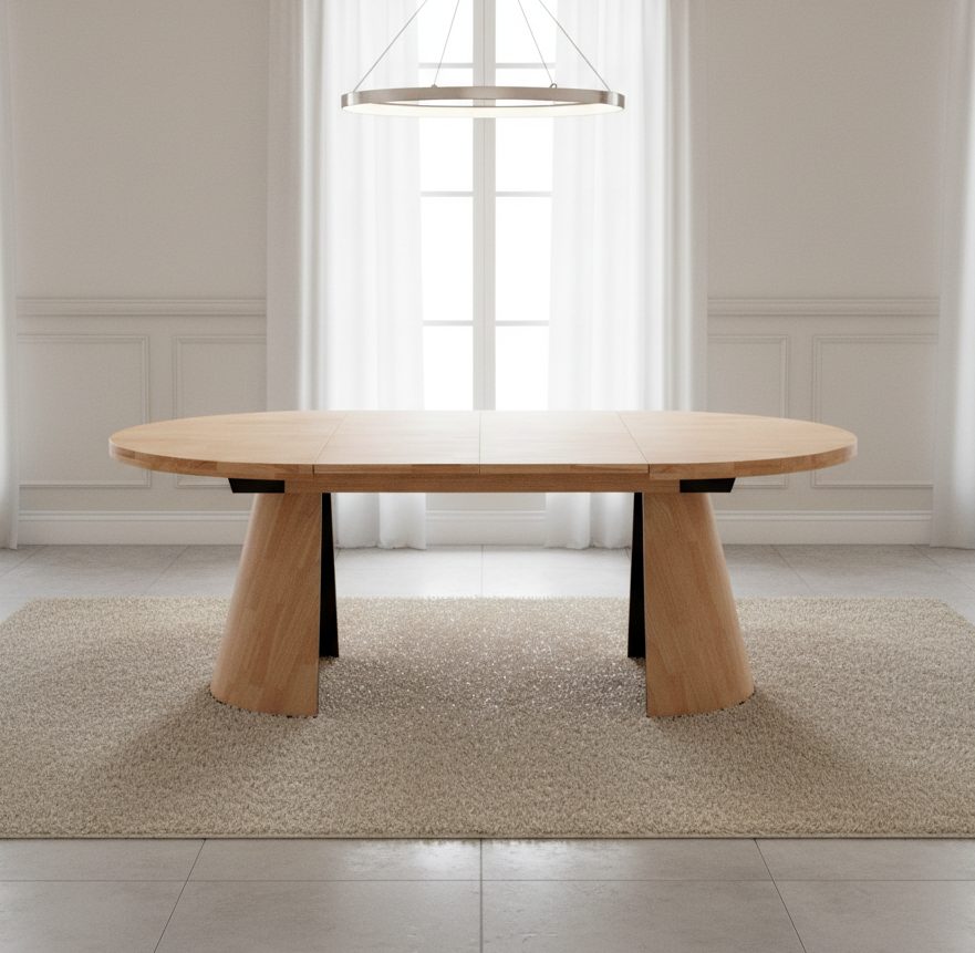 Mesa de comedor extensible de diseño contemporáneo, con sobre redondeado y bordes suavemente biselados que aportan una estética ligera y elegante. Su tablero de madera muestra un veteado natural que crea un ambiente cálido y acogedor en el comedor. La estructura se apoya sobre dos bases troncocónicas que facilitan la comodidad de los comensales al evitar esquinas y travesaños molestos. El sistema extensible central permite agrandar la superficie de forma rápida, ofreciendo espacio adicional cuando llegan visitas. Es una mesa pensada para hogares actuales que buscan combinar funcionalidad y estilo en un único mueble versátil.