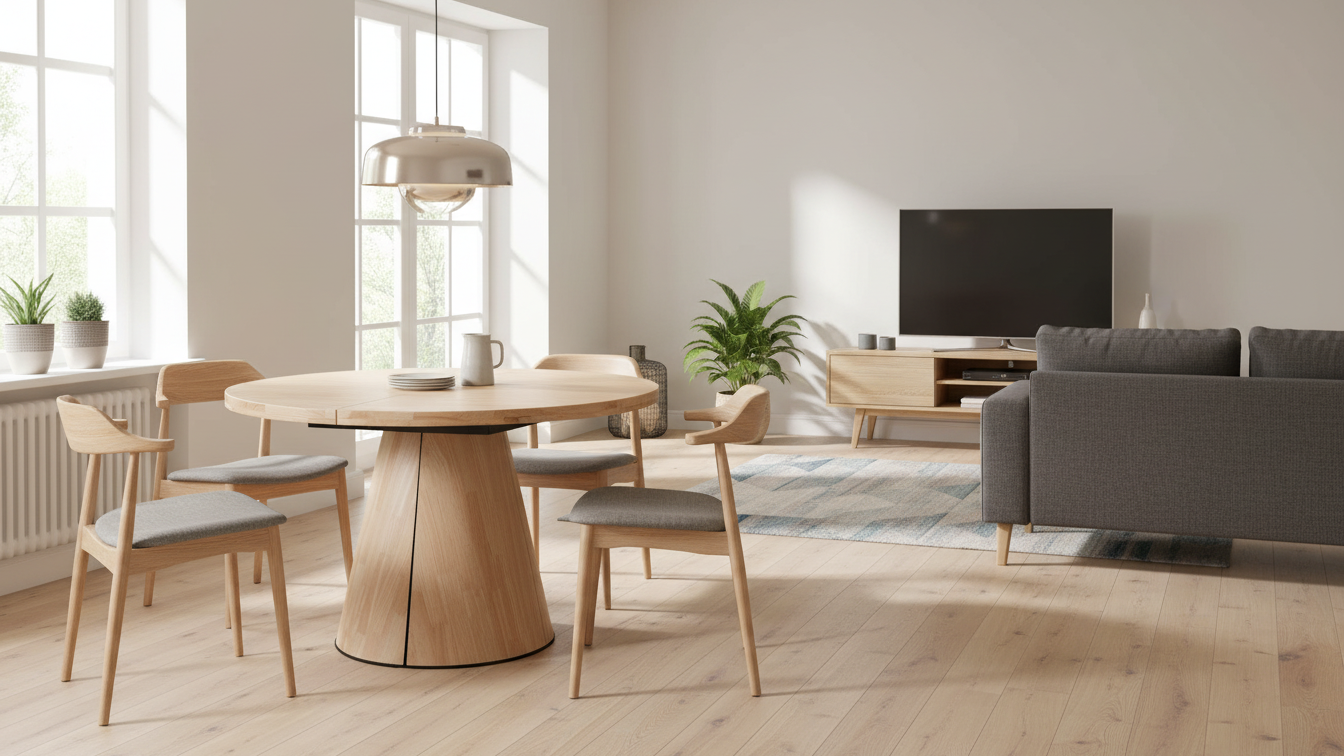 Ofrece una superficie compacta para el día a día y se amplía fácilmente cuando se necesita más espacio, optimizando el uso del comedor sin renunciar al diseño moderno.