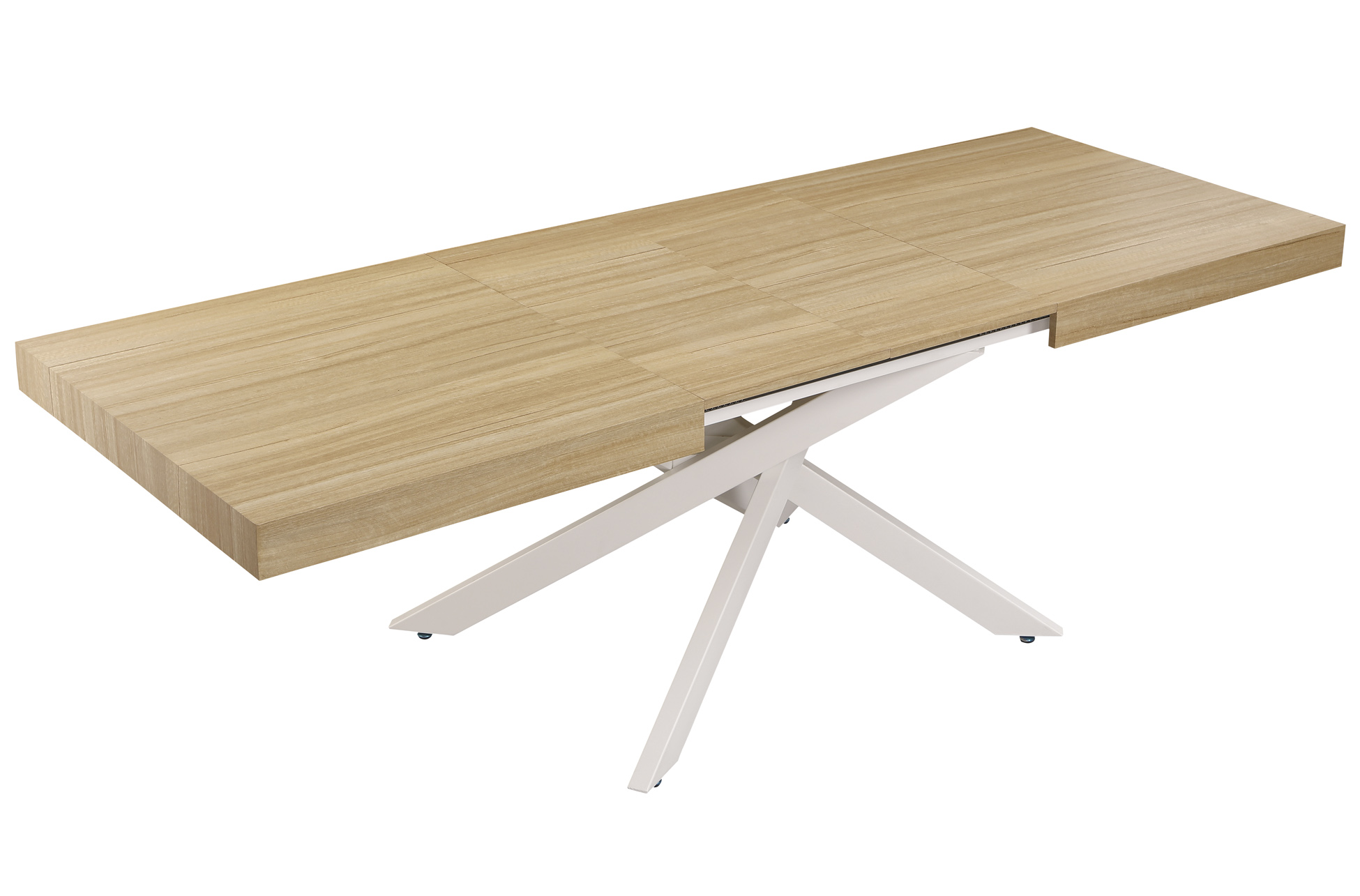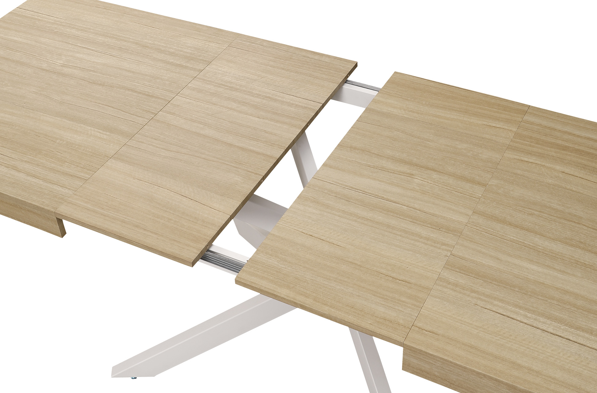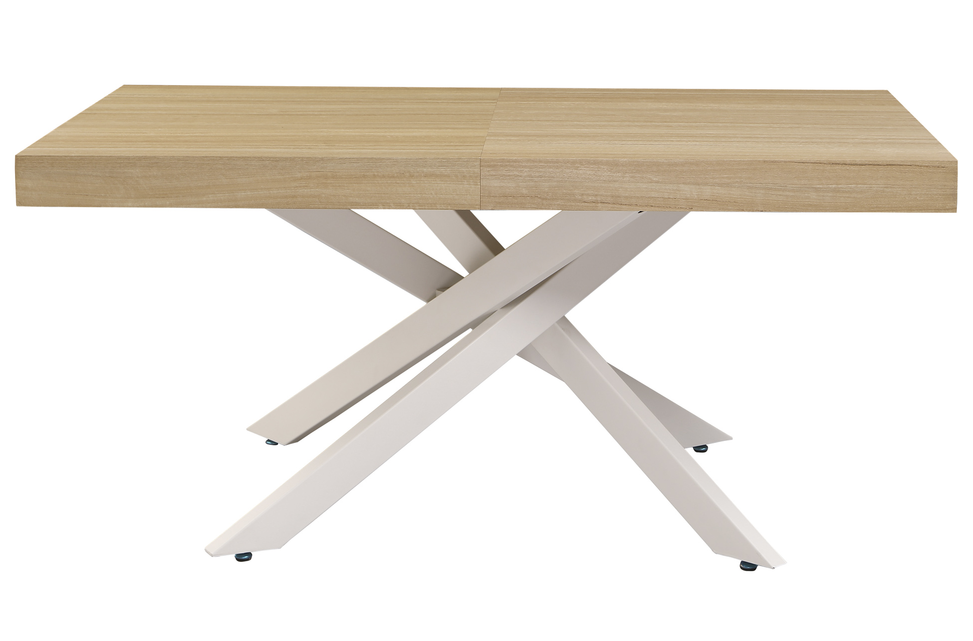 Mesa extensible de comedor con tapa de aspecto madera y patas metálicas cruzadas, de estilo moderno y líneas limpias. Ofrece una extensión rápida y práctica para ganar plazas adicionales en reuniones.