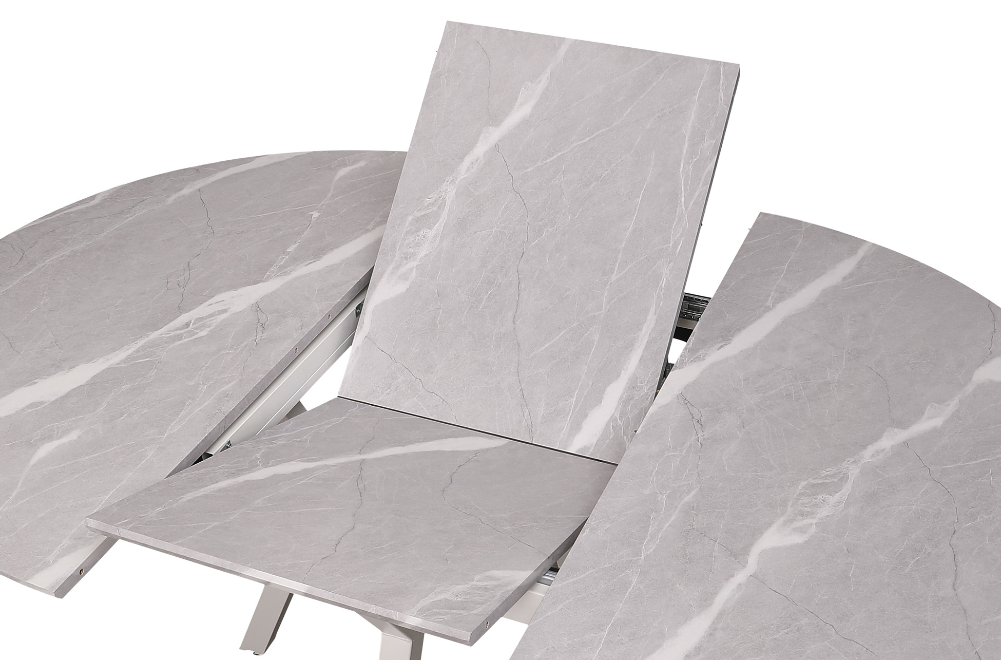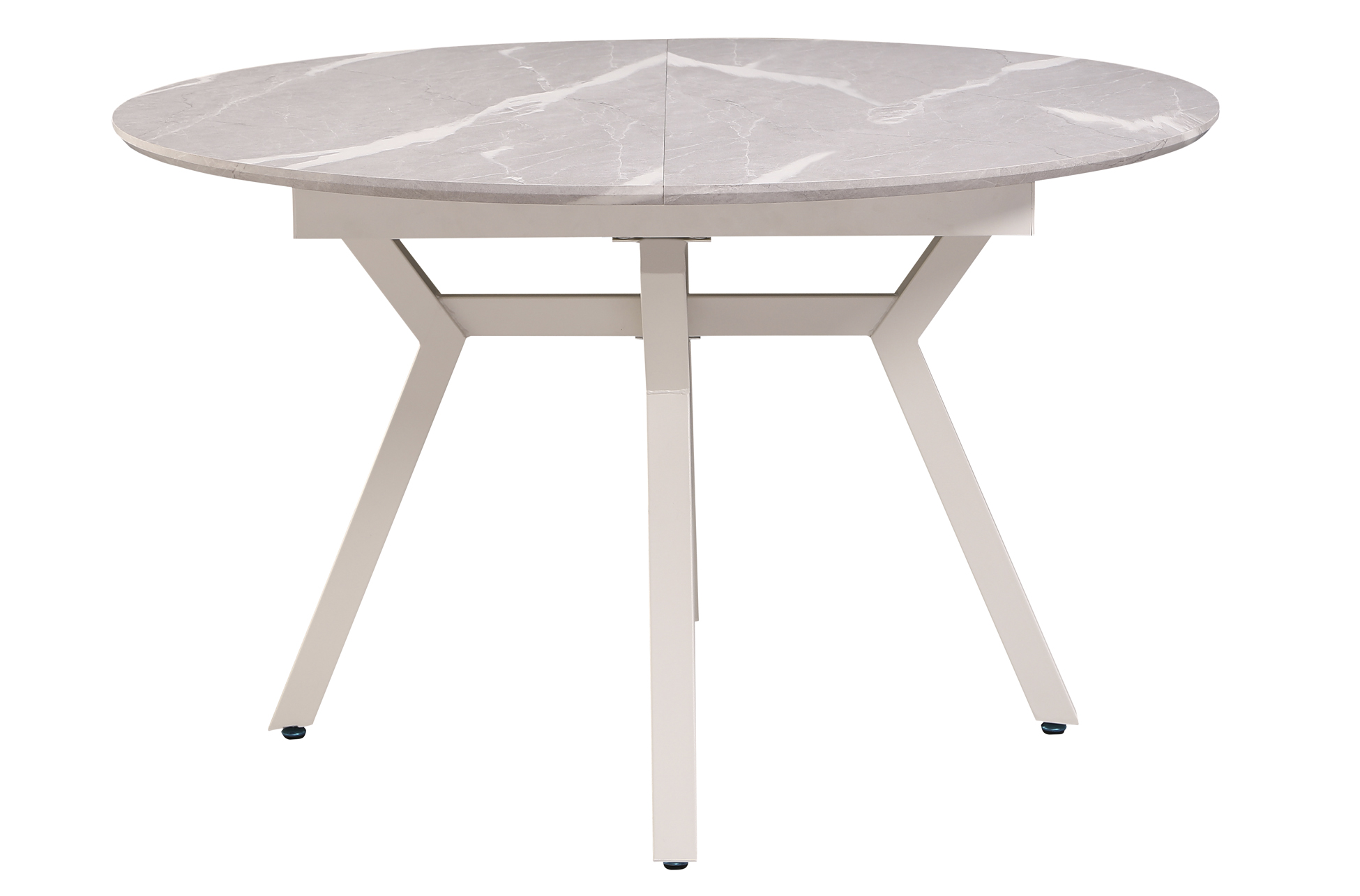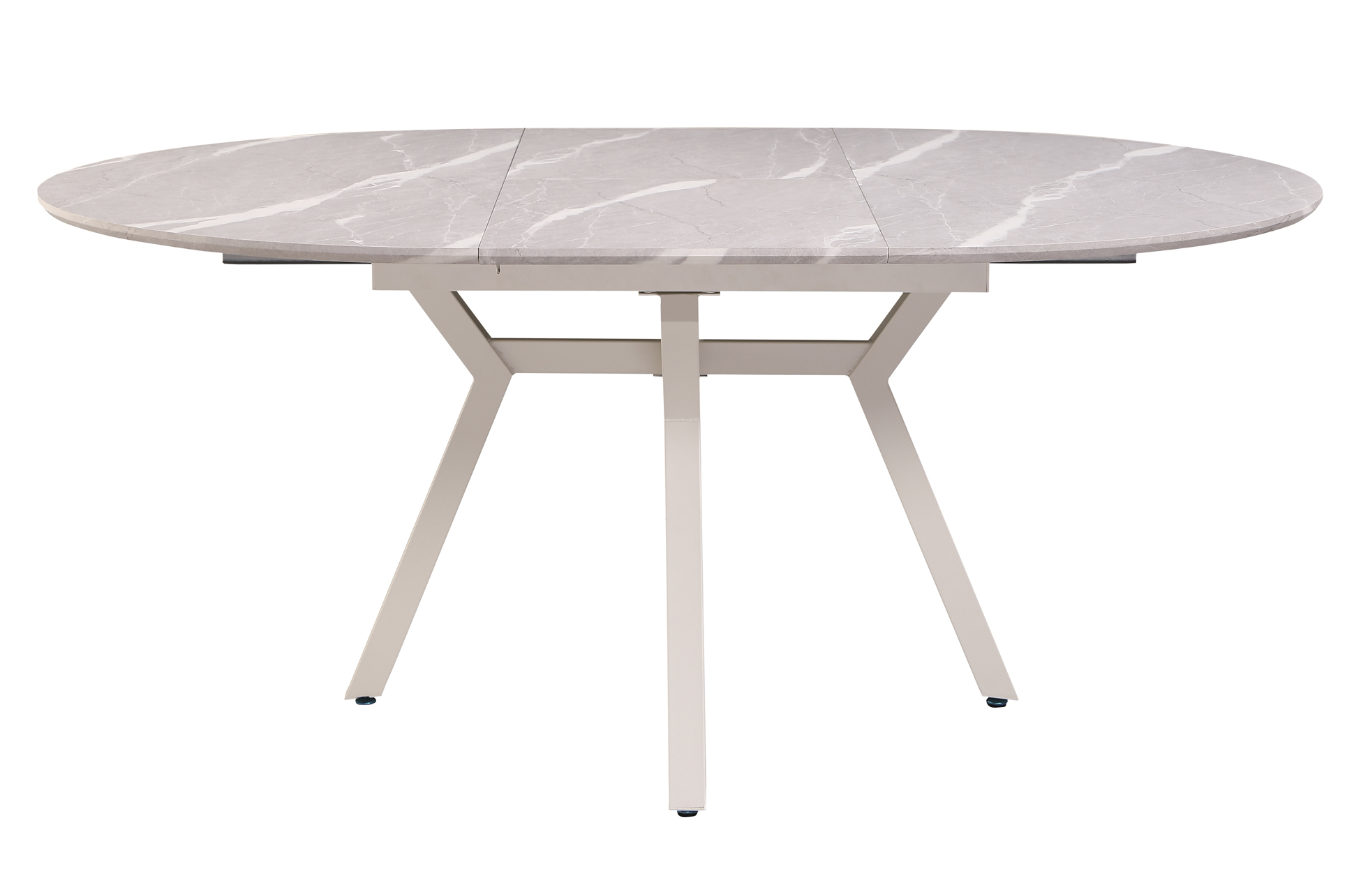 Mesa extensible de comedor con tablero efecto mármol y patas metálicas estilizadas. Diseño moderno, estable y fácil de extender para más comensales.