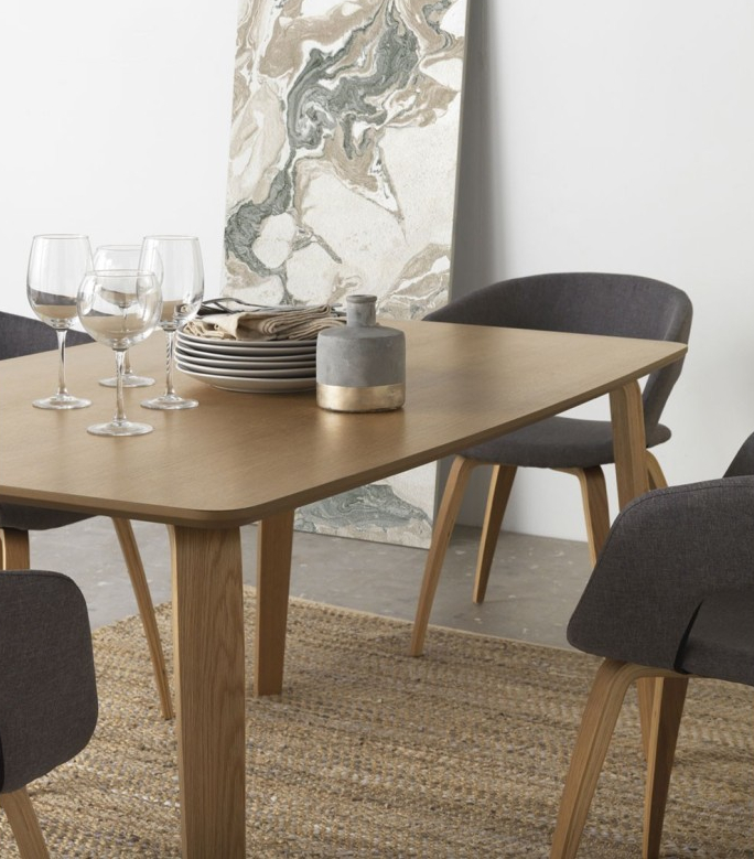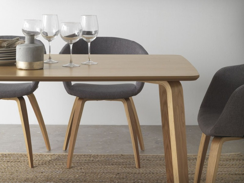 Mesa rectangular de roble natural con patas inclinadas y acabado mate. Tablero grueso y estable para 6 comensales, diseño minimalista y cálido.