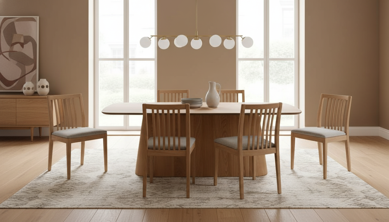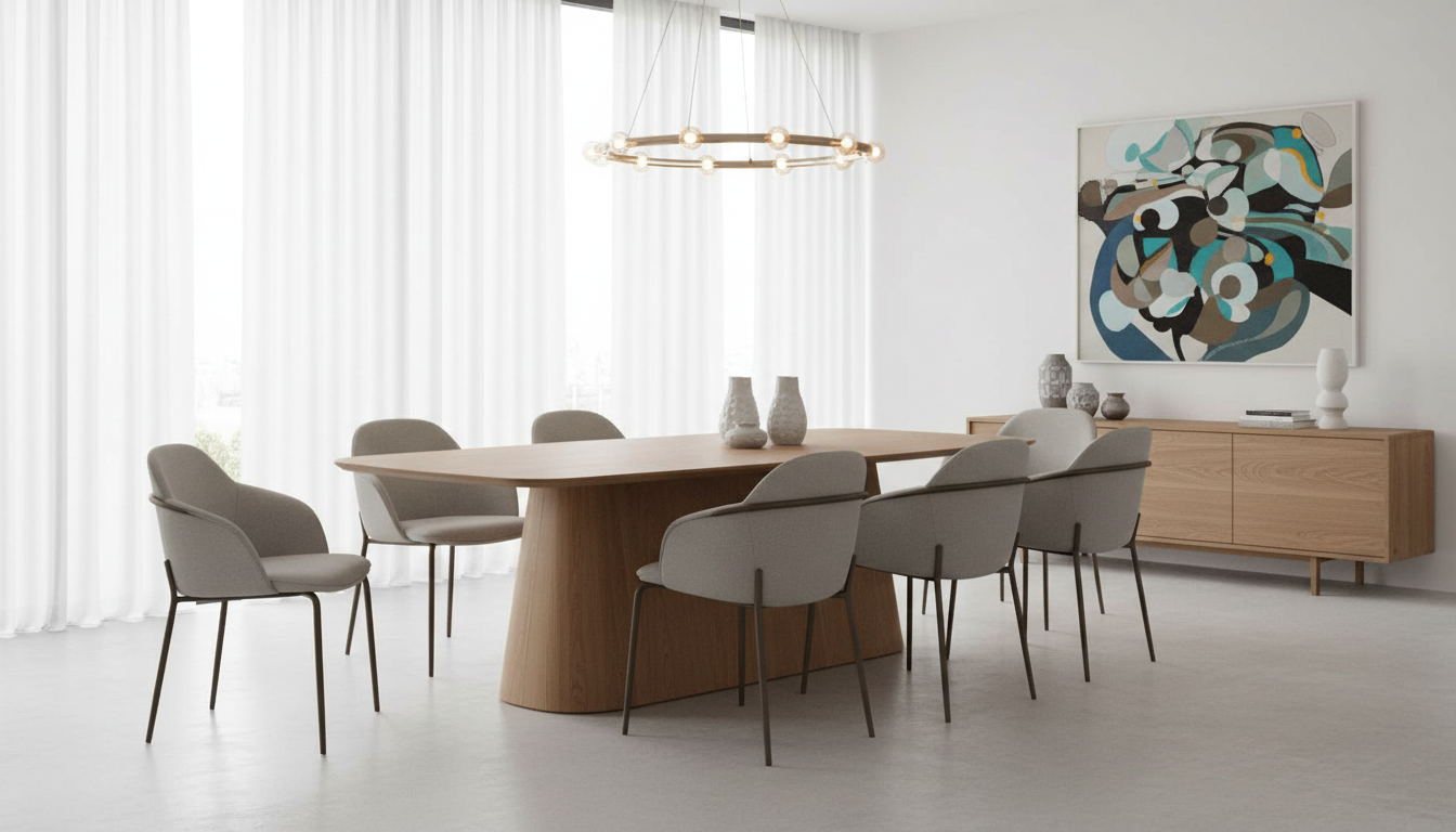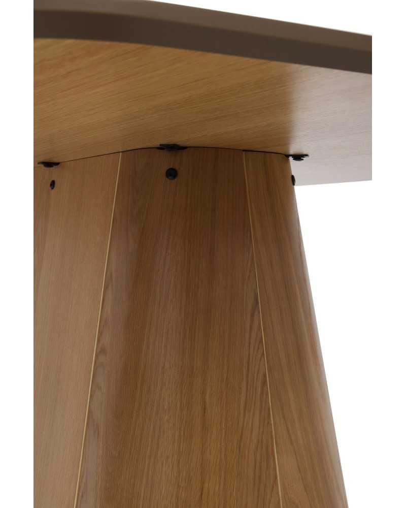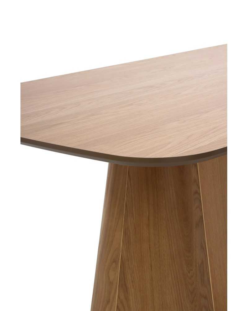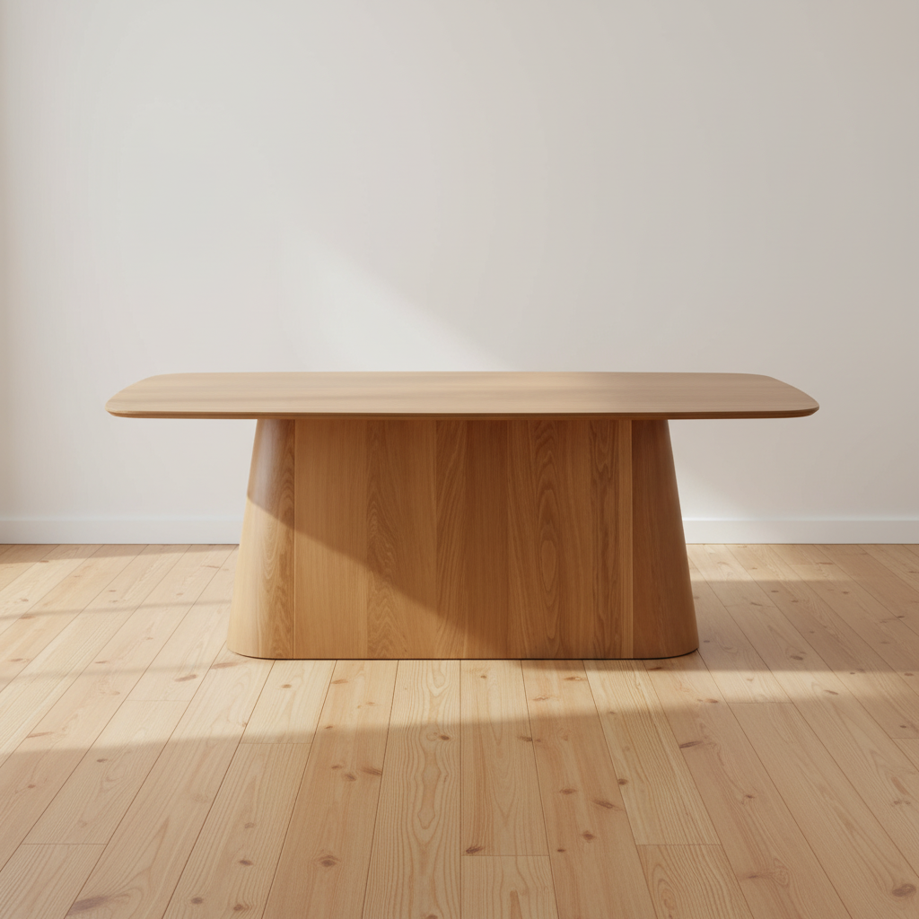 Mesa rectangular de roble natural con pie central cónico, tablero grueso y esquinas redondeadas. Espaciosa para 10-12 comensales, elegante y estable.