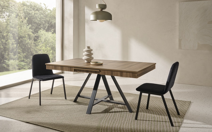 Mesa de comedor moderna de líneas rectas en madera, con estructura metálica central. Diseño minimalista ideal para espacios contemporáneos, perfecta para combinar con diferentes estilos decorativos y crear ambientes cálidos y elegantes.