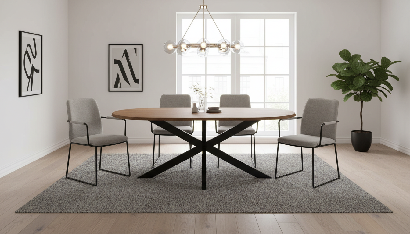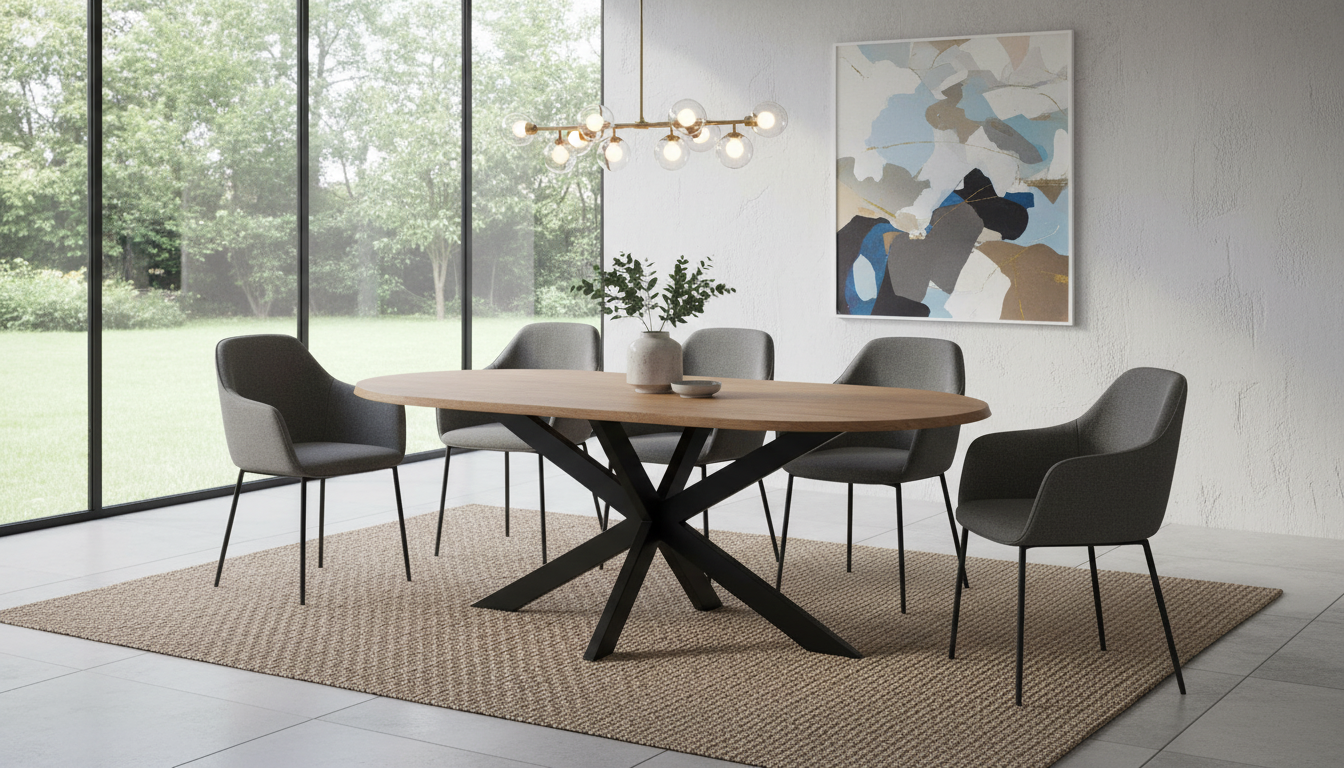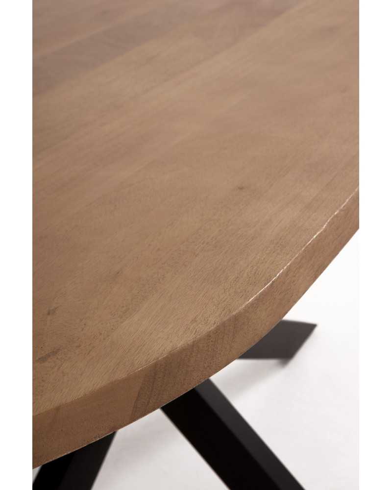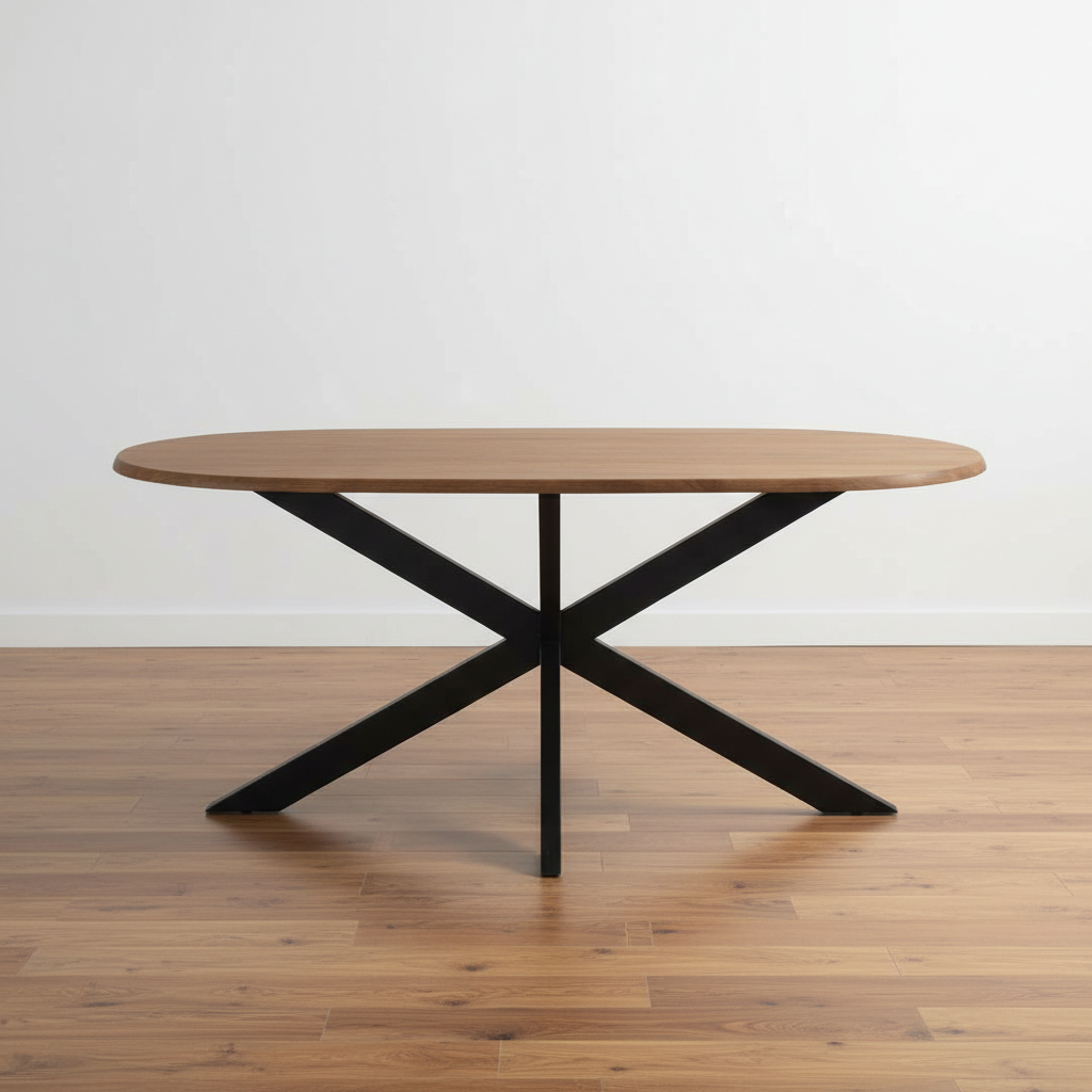 Mesa ovalada de madera de acacia natural con pie metálico negro. Tablero grueso y robusto para 8 personas, diseño estable y moderno.