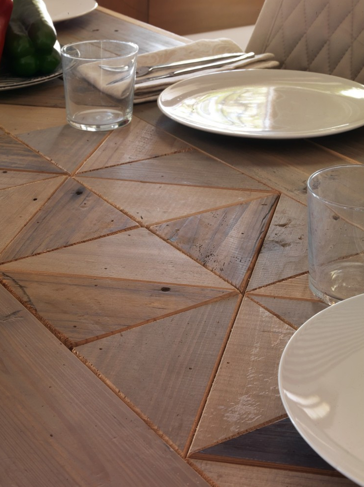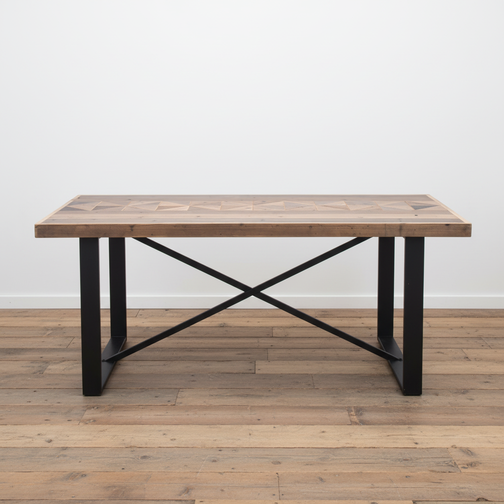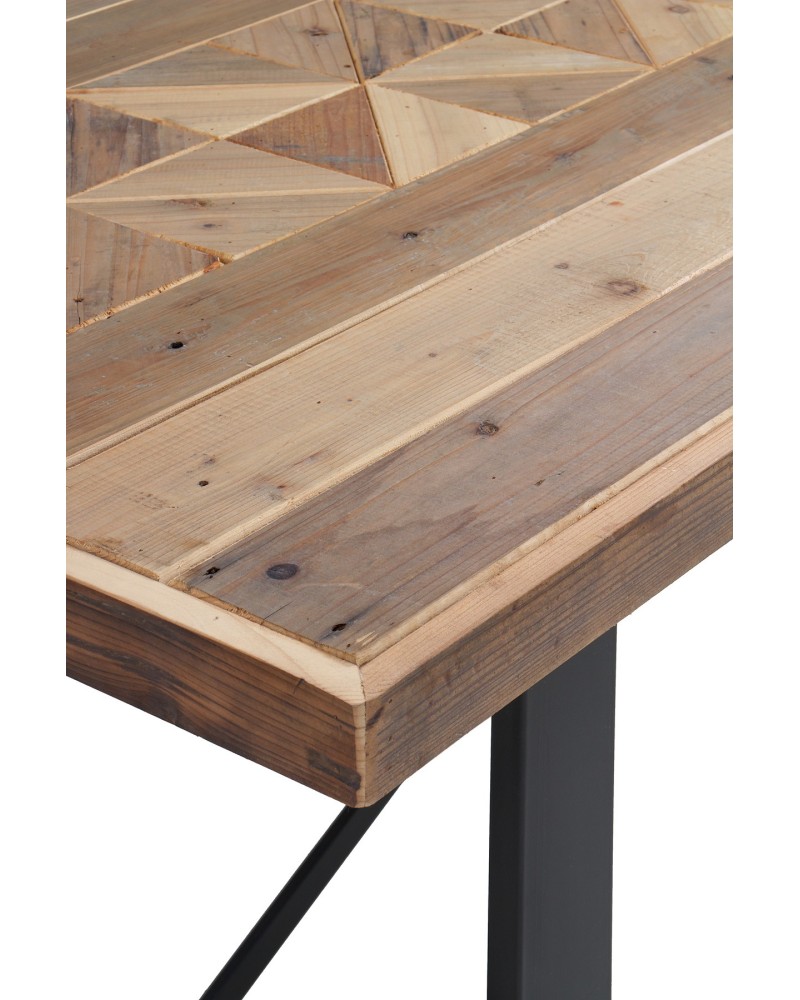 Mesa rectangular de comedor con tablero patchwork en madera natural y patas metálicas negras. Estilo industrial rústico para 6-8 comensales.