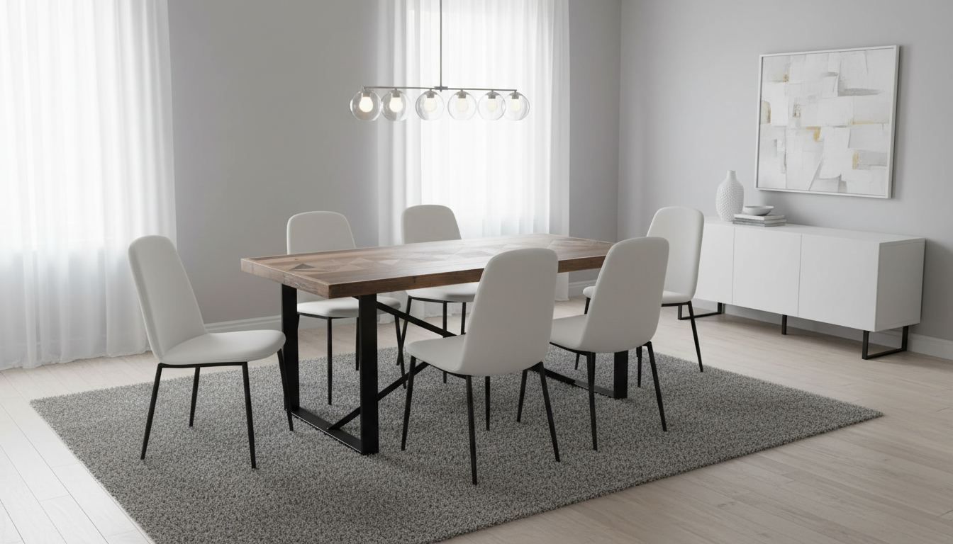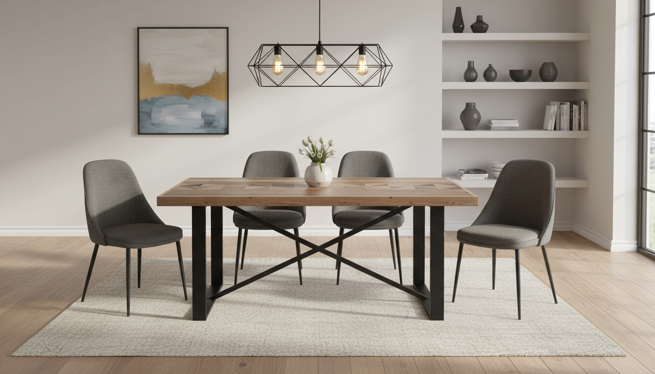 Esta mesa de comedor destaca por su diseño industrial rústico, con un tablero de MDF chapado en madera de fresno natural que forma un mosaico de lamas en tonos variados de madera, evocando un estilo reciclado y patchwork. Las patas de metal negro en estructura cruzada aportan estabilidad y un toque moderno, ideal para espacios contemporáneos o industriales. Sus medidas precisas de 180 x 90 x 76 cm permiten acomodar cómodamente a 6-8 personas, convirtiéndola en perfecta para comidas familiares o reuniones. El acabado natural resalta las vetas y texturas de la madera, con bordes reforzados y uniones precisas que garantizan durabilidad. Este mueble combina artesanía visible en el tablero segmentado con robustez metálica, ofreciendo un equilibrio entre estética vintage y funcionalidad diaria en cocinas, comedores o salas versátiles.