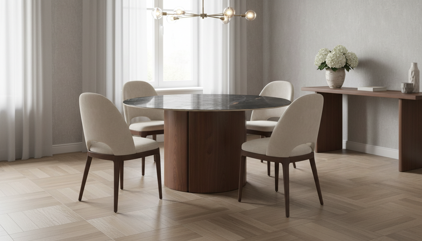 Mesa redonda sofisticada con tapa de cerámica efecto mármol gris oscuro brillante y base cilíndrica chapada en madera de roble. Perfecta para reuniones familiares o profesionales, ofrece estabilidad y un toque de lujo natural. Su forma circular fomenta la conversación fluida en cualquier ambiente.