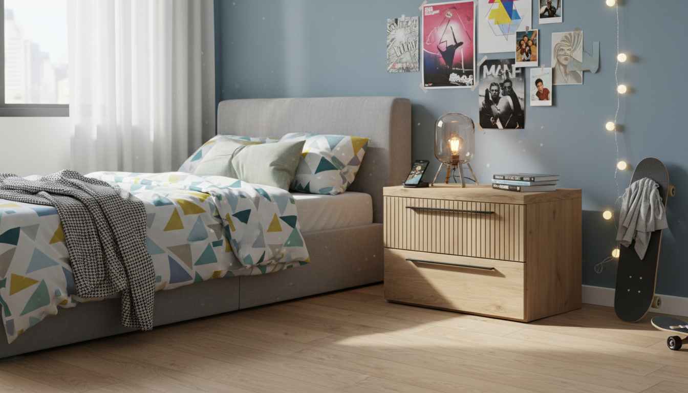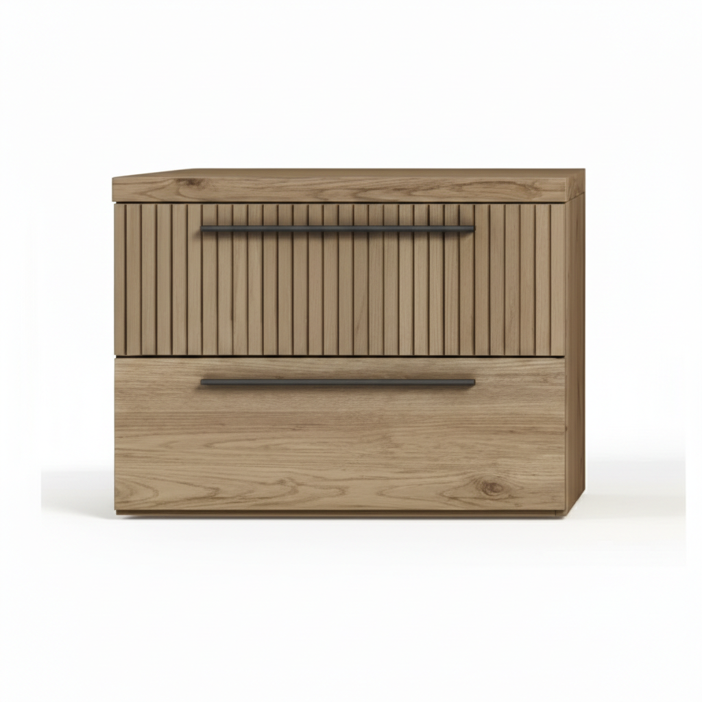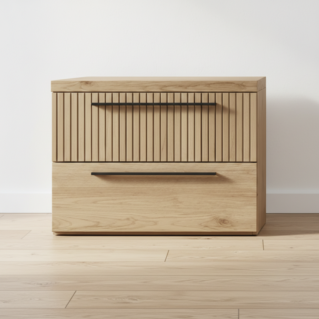 La mesita de noche destaca por su diseño moderno y funcional, ideal para dormitorios contemporáneos. Fabricada en madera con vetas naturales visibles, presenta una estructura rectangular con estética minimalista y detalles en relieve vertical que aportan textura y elegancia. Cuenta con dos cajones amplios superpuestos, equipados con tiradores metálicos delgados y lineales que facilitan el acceso al almacenamiento interior. Su forma compacta la hace perfecta para colocarse al lado de la cama, ofreciendo superficie superior para lámparas, libros o relojes, mientras los cajones mantienen el orden ocultando objetos cotidianos. El acabado mate resalta la calidez de la madera, integrándose armónicamente en estilos nórdicos, industriales o escandinavos. Los laterales lisos y la base sólida confieren estabilidad, y su orientación permite colocarla en esquinas para optimizar espacios reducidos. Este mueble combina practicidad con un toque sofisticado, elevando la decoración del dormitorio sin sobrecargarlo visualmente.