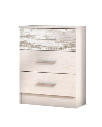 Mesita de noche de diseño actual con tres cajones, pensada para mantener el dormitorio ordenado y tenerlo todo a mano. Su estructura compacta permite colocarla junto a la cama sin recargar el ambiente, y los frentes de los cajones aportan un toque decorativo con textura tipo madera. Los tiradores rectos facilitan la apertura y el cierre, mientras que los cajones ofrecen buena capacidad para ropa pequeña, cargadores, libros o accesorios. Es una opción práctica para dormitorios juveniles o de matrimonio, y también funciona como mueble auxiliar en un recibidor o estudio.