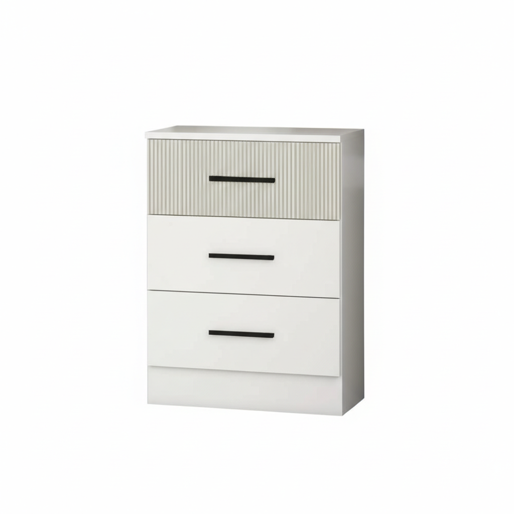 Esta mesita de noche destaca por su diseño moderno y funcional, ideal para dormitorios contemporáneos. Cuenta con tres cajones amplios para organizar objetos personales, ropa o accesorios, manteniendo el espacio ordenado y limpio. El cajón superior presenta un frente texturizado con rayas finas que añade un toque elegante y sofisticado, diferenciándose del resto liso. La estructura es robusta, con tiradores negros ergonómicos que facilitan el uso diario y una base elevada que mejora la limpieza debajo. Su estética minimalista la hace versátil, combinando perfectamente con camas, lámparas o decoraciones variadas. Ofrece una superficie superior generosa para colocar elementos esenciales como un reloj, libro o vaso. Fabricada con materiales resistentes como melamina de alta calidad, garantiza durabilidad en entornos cotidianos. Este mueble compacto optimiza espacios reducidos sin sacrificar estilo ni practicidad, convirtiéndose en un complemento esencial para habitaciones acogedoras y funcionales.