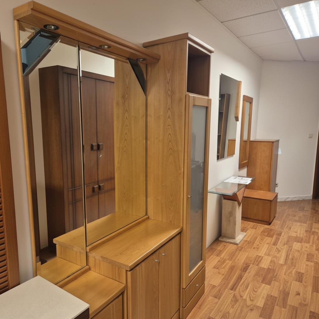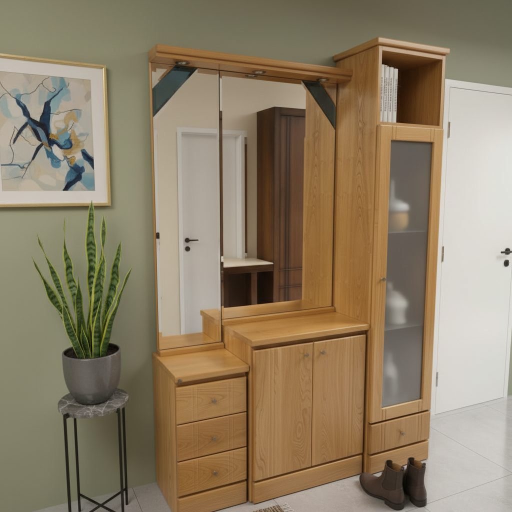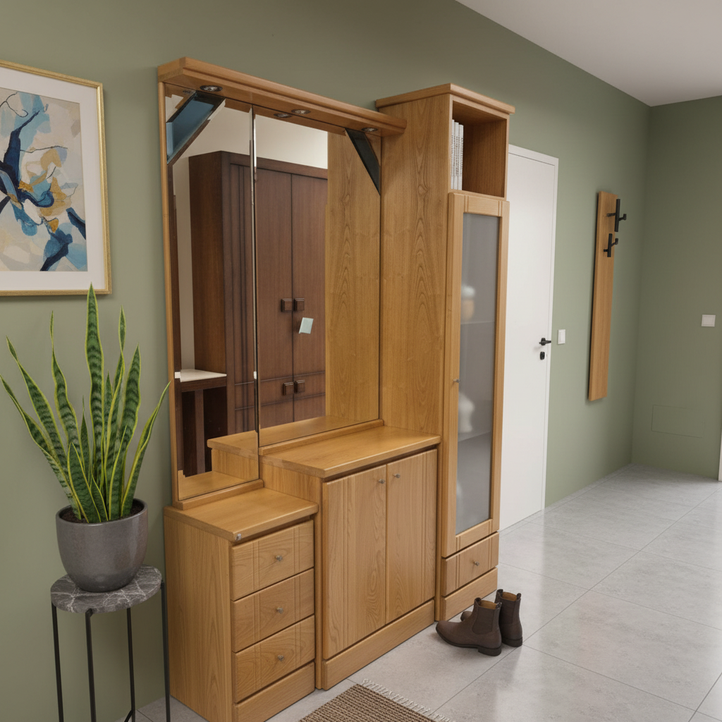 Conjunto de muebles de madera en tono claro, típicos de un recibidor elegante. Destaca un mueble central alto con espejo grande de cuerpo entero y laterales con estantes abiertos y puertas correderas de vidrio esmerilado. A su izquierda, un armario alto de dos puertas con espejo central y tiradores metálicos. A la derecha, una consola estrecha con espejo superior, cajones y patas estilizadas, junto a un taburete bajo con asiento tapizado. El diseño es moderno, con líneas rectas y acabados pulidos, sobre suelo de parquet. La madera maciza aporta calidez y solidez al espacio.
