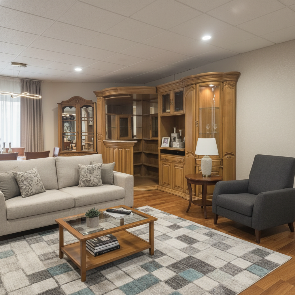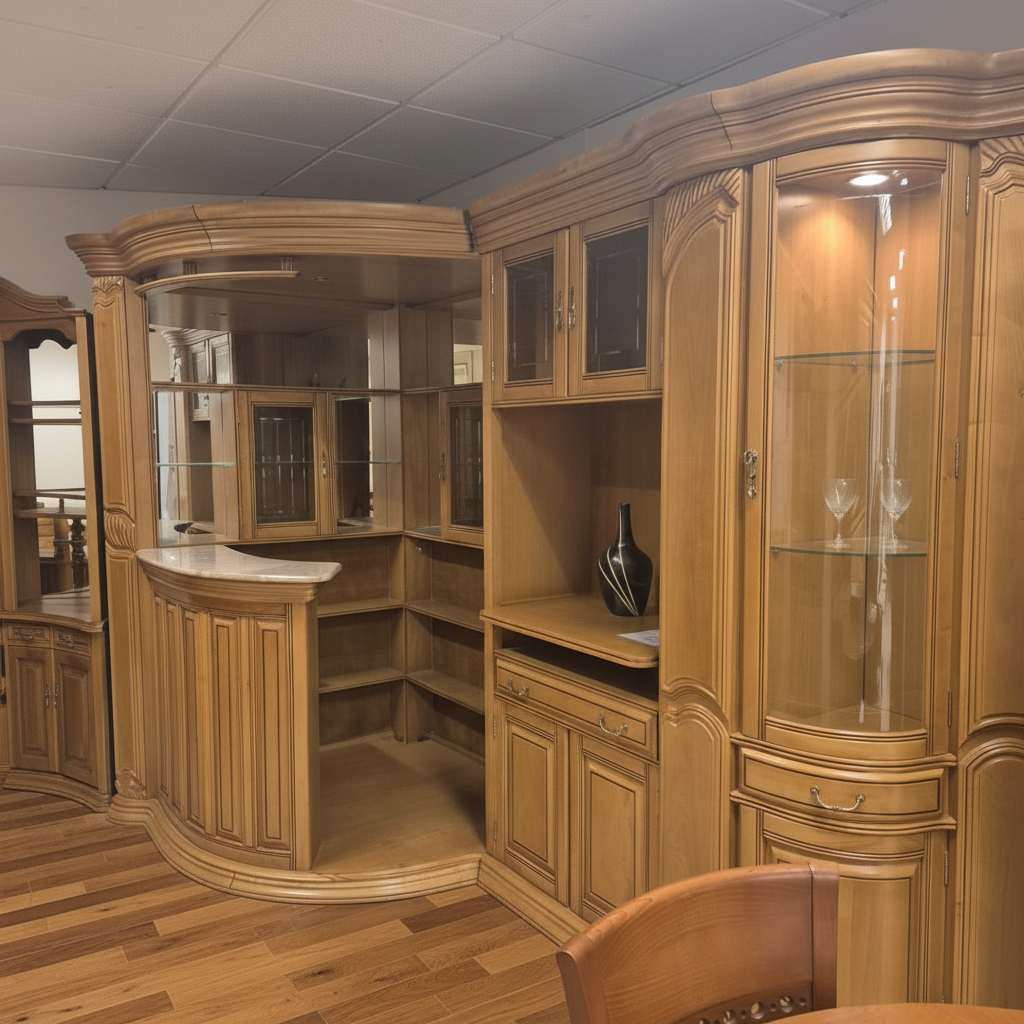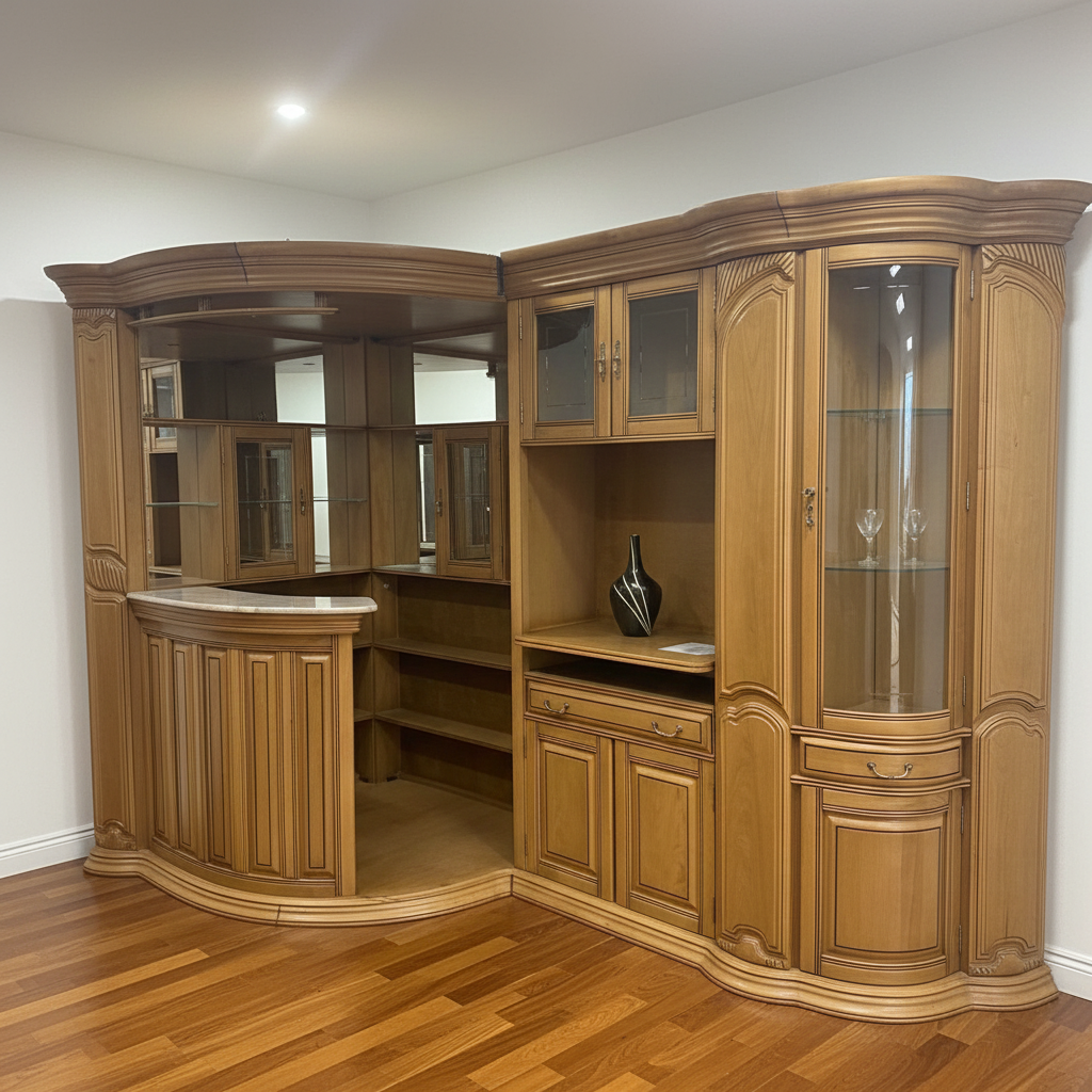 Mueble de madera maciza en forma de L, con diseño curvo y elegante que ocupa una esquina de la habitación. Destaca su estructura robusta con molduras talladas, capiteles ornamentales y acabados en tono caoba brillante. Cuenta con múltiples estanterías abiertas y cerradas, puertas de cristal biselado en las zonas superiores para exponer vajillas o decoraciones como un jarrón negro y copas, y un área central con barra curvada de superficie marmoleada ideal para servir bebidas. Los laterales incluyen espejos que amplían visualmente el espacio, cajones inferiores con tiradores metálicos y zócalos estables. El conjunto transmite lujo clásico, con detalles como curvas barrocas en los bordes y divisiones internas funcionales para almacenamiento. Su posición en el suelo de parquet resalta su solidez y armonía con el entorno luminoso.