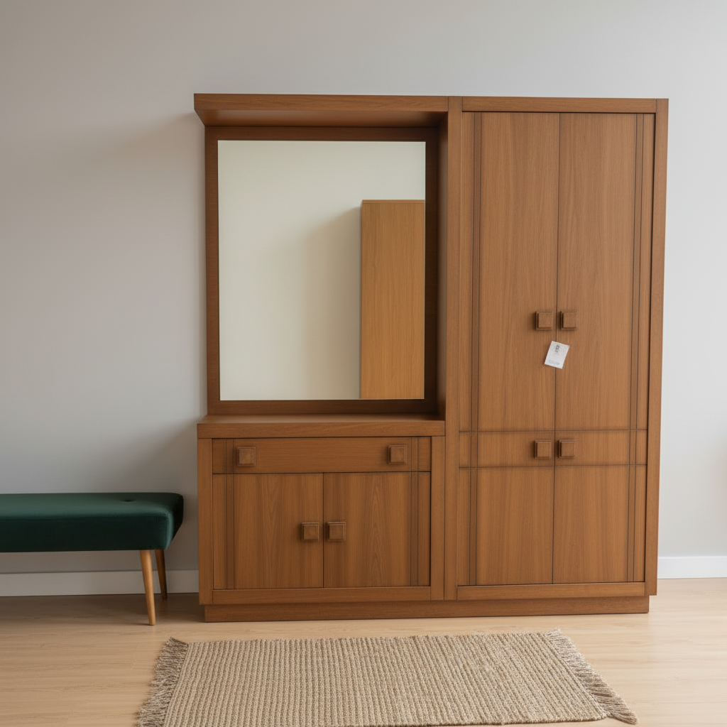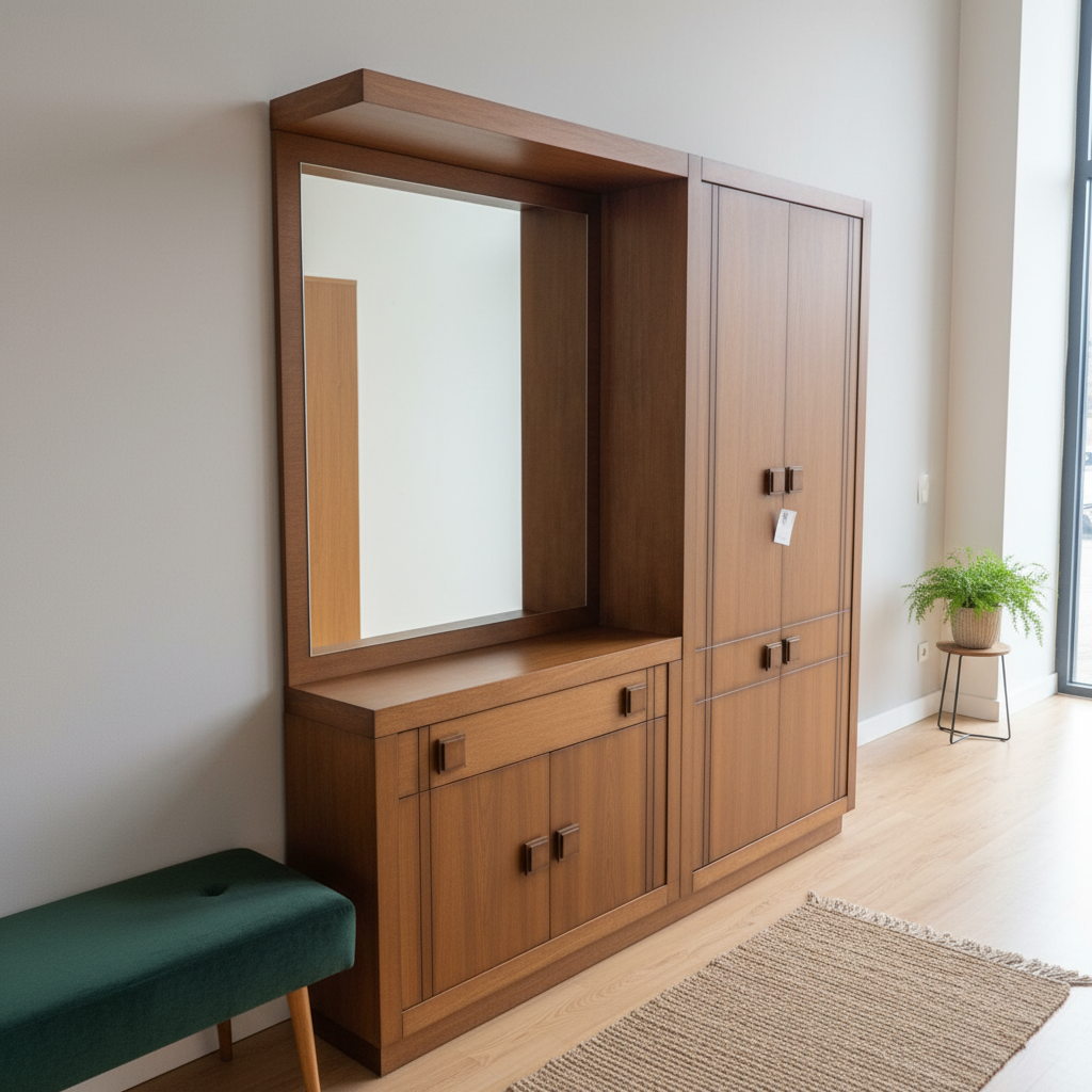 Mueble de madera maciza con espejo grande, armarios laterales y cajones inferiores, de diseño clásico y líneas rectas. Aporta gran capacidad de almacenaje, presencia decorativa y un estilo cálido y elegante para el hogar.