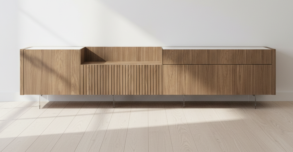 El mueble TV 215 de Kazzano destaca por su diseño modular y contemporáneo, fabricado en nogal tierra con detalles en mármol oro que aportan calidez natural y un toque de lujo sofisticado. Su estructura alargada con patas elevadas y divisiones funcionales lo hace ideal para salones amplios, ofreciendo amplio espacio de almacenamiento mediante cajones, puertas y nichos abiertos. Las texturas rayadas en los paneles frontales y la combinación de acabados elevan su estética minimalista, adaptándose perfectamente a estilos modernos o nórdicos. Este mueble permite personalizaciones como terminales laterales más gruesos para mayor robustez, integrando funcionalidad y elegancia en un solo elemento.