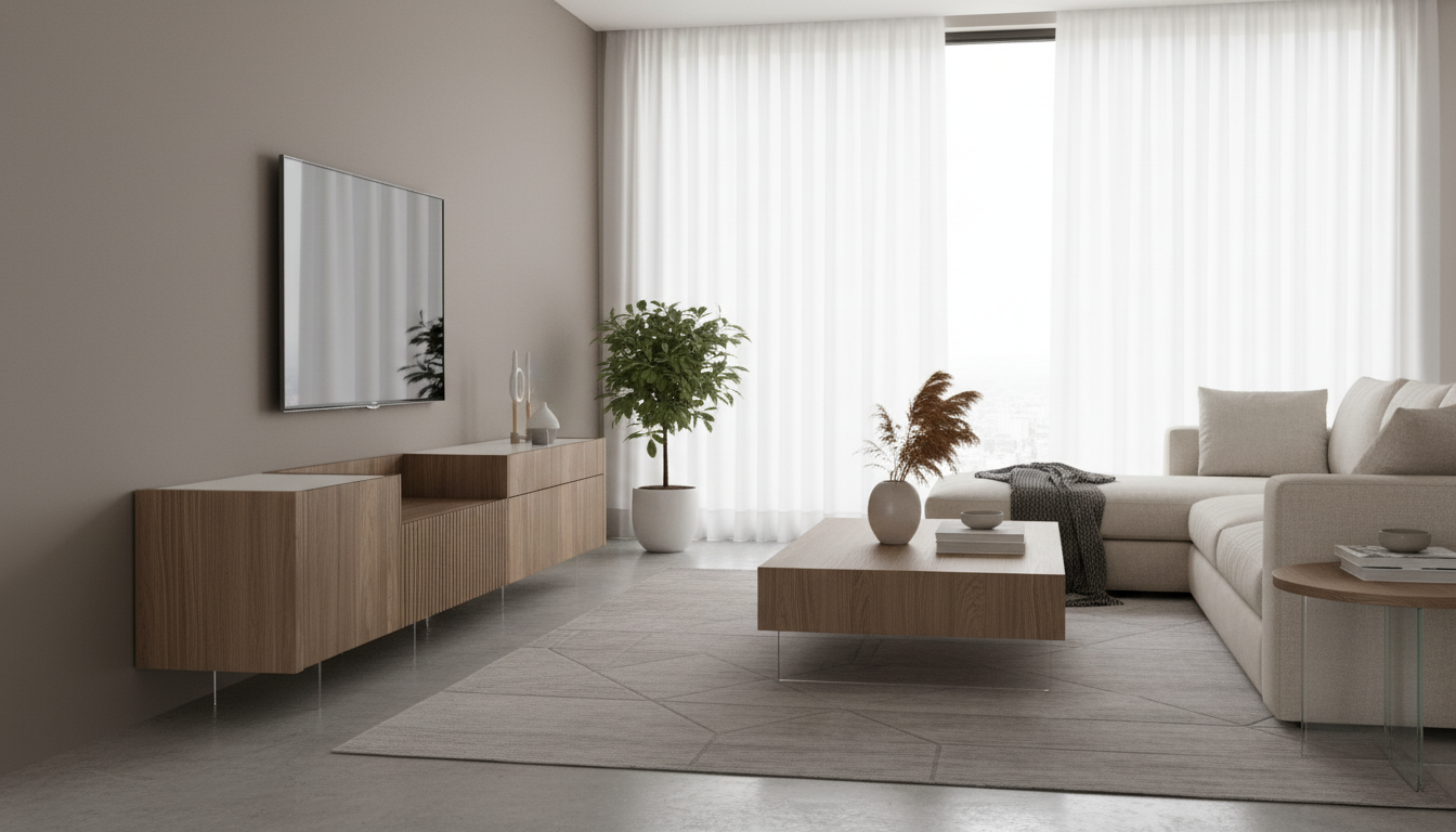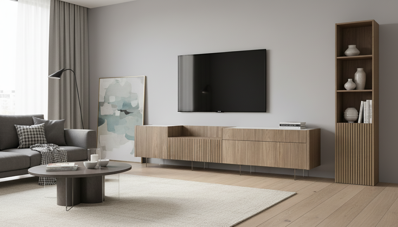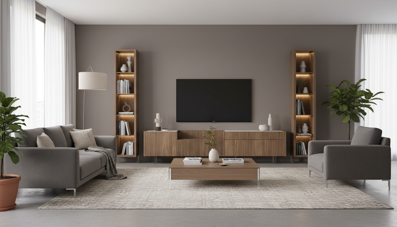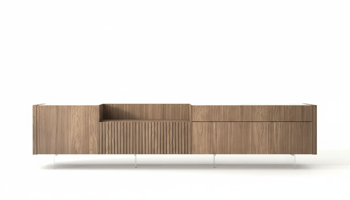 Ofrece versatilidad modular, materiales nobles como nogal y mármol, y personalización para adaptarse a cualquier salón amplio.