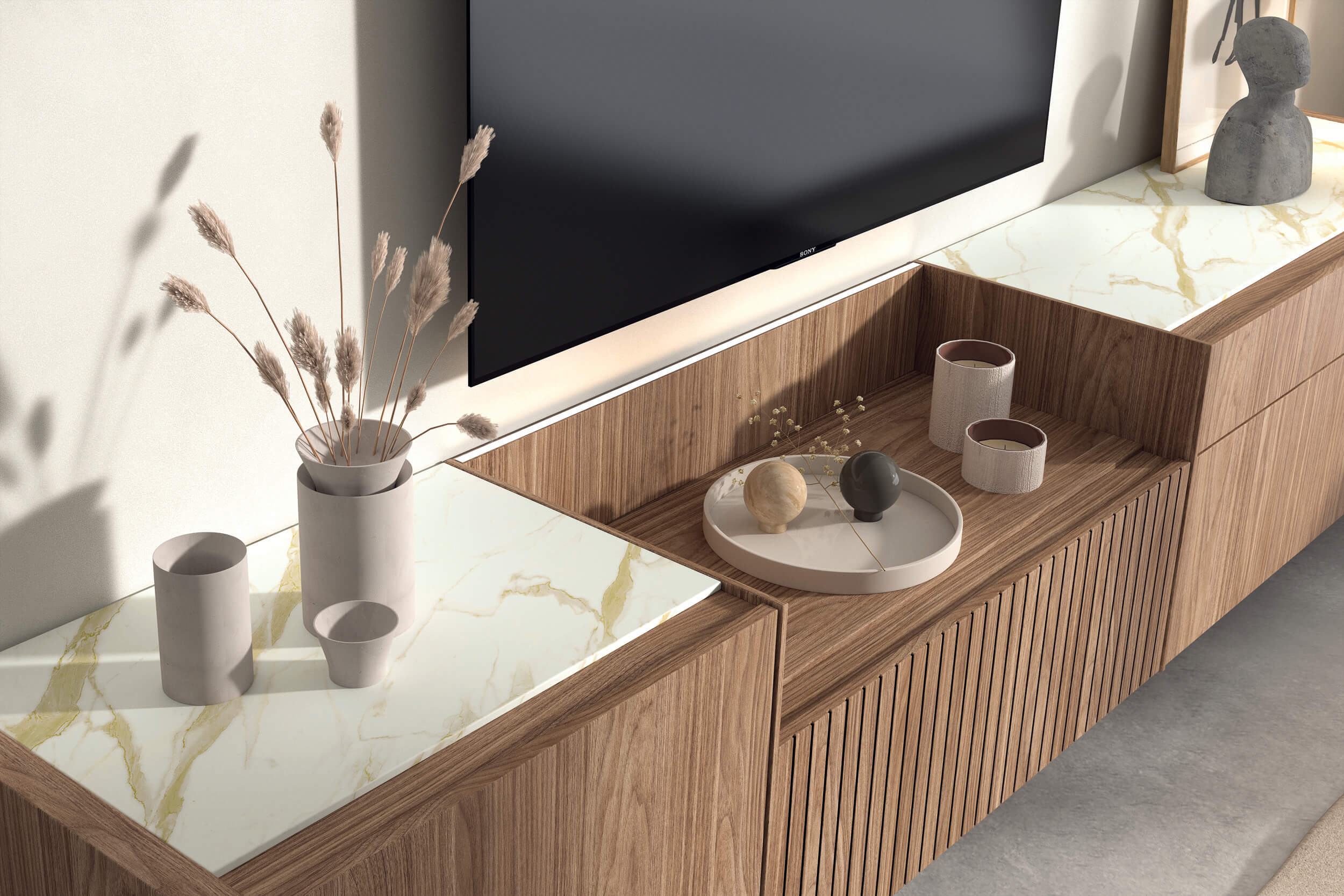 Mueble TV modular en nogal tierra con mármol oro, diseño lineal elevado sobre patas metálicas, nichos y cajones para almacenamiento versátil y estilo contemporáneo.