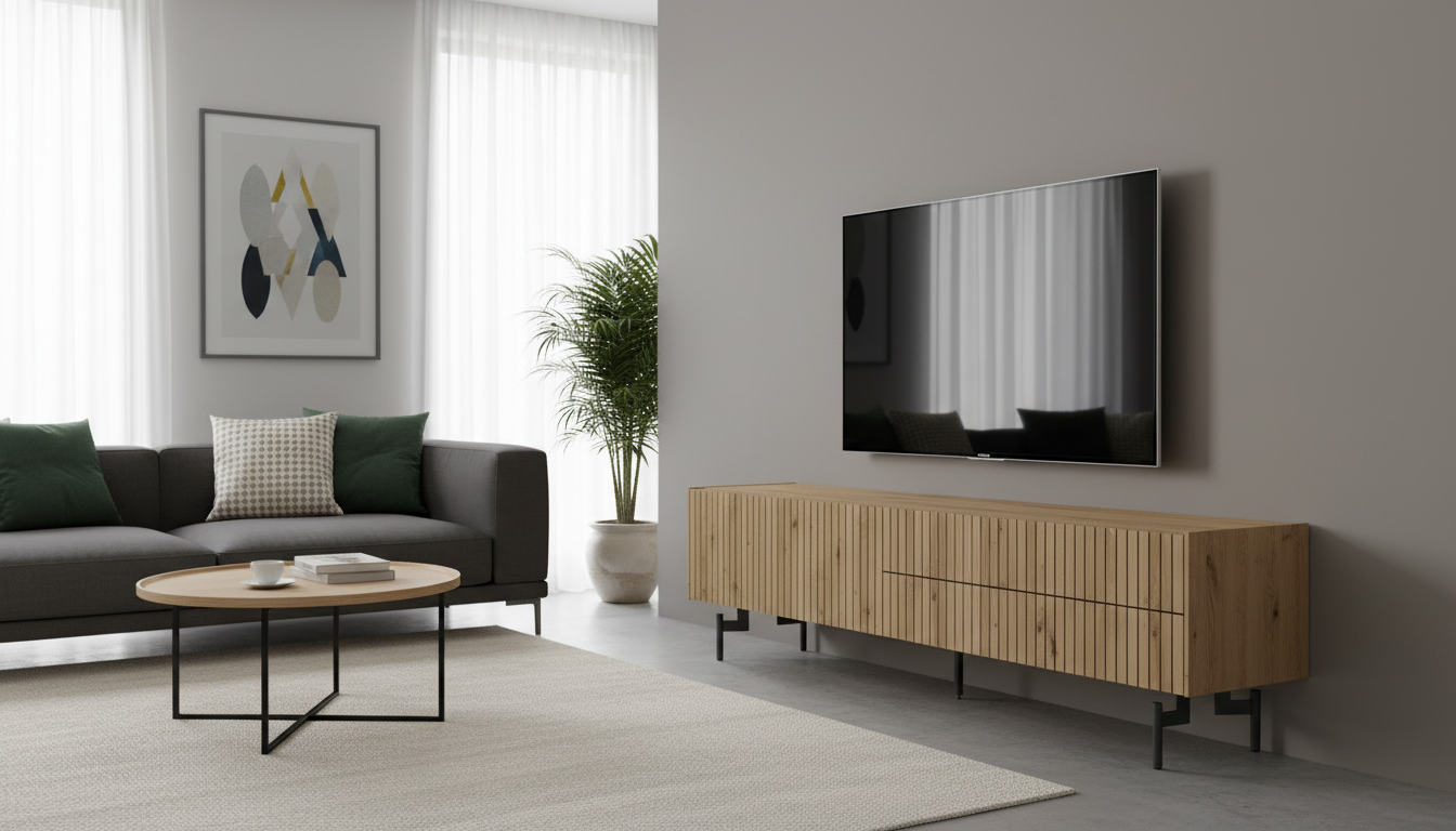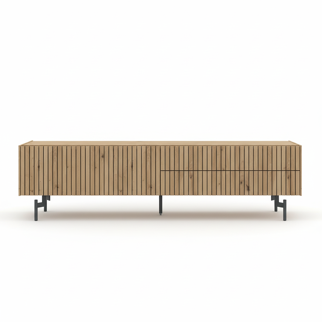Este mueble TV destaca por su diseño escandinavo moderno, fabricado en madera de haya maciza con puertas de listones verticales que aportan ligereza y estilo contemporáneo. Equipado con cajones laterales para almacenamiento práctico y patas de metal negro elevadas, se adapta perfectamente a salones amplios, combinando calidez natural con toques industriales. Sus acabados en tono claro de haya resaltan las vetas de la madera, ofreciendo durabilidad y un aspecto elegante que soporta televisores grandes sin esfuerzo.