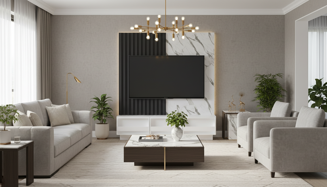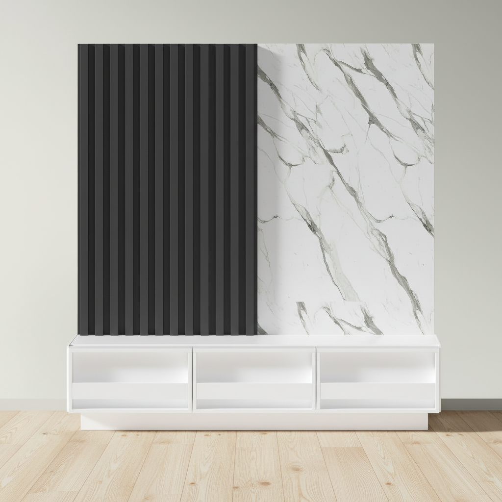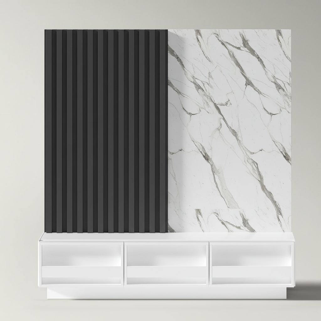 Este mueble TV combina elegancia moderna con funcionalidad práctica. Destaca por su diseño asimétrico con un panel alistonado en gris pizarra que aporta textura vertical, junto a un fondo en mármol gris veteado y una base blanca seda con cajones amplios. Ideal para salones contemporáneos, integra modulación revistero para revistas o mandos, paneles lisos para un acabado impecable y alistonados para dinamismo visual, soportando televisores grandes con estabilidad. Su composición en materiales premium como gris pizarra, mármol gris y blanco seda asegura durabilidad y fácil integración en espacios luminosos. Con altura total de 190 cm y anchura de 182 cm, ofrece amplitud sin abrumar el entorno.
