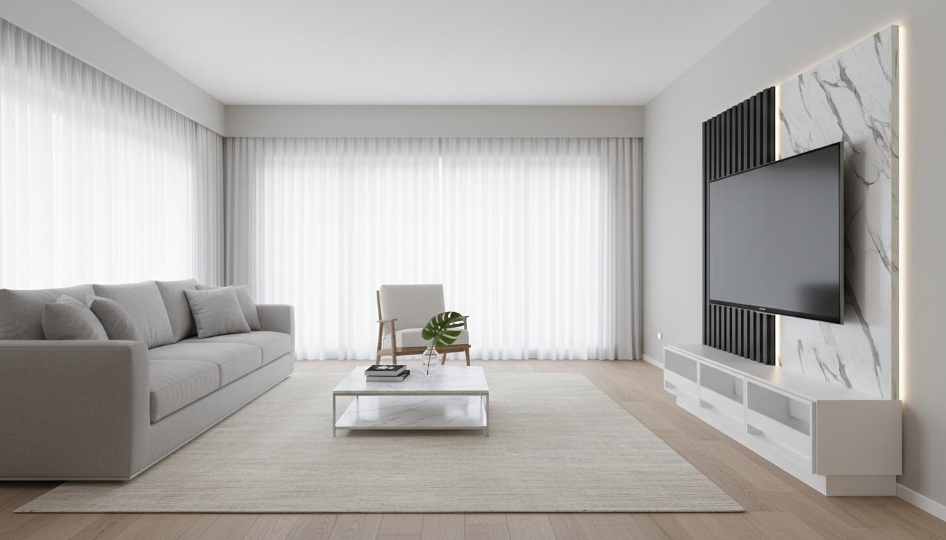Sí, su base reforzada en blanco seda y estructura modular aseguran gran estabilidad para TVs pesadas, con materiales como mármol gris y pizarra resistentes al uso diario.
